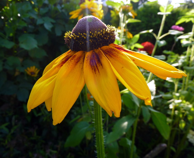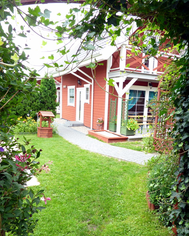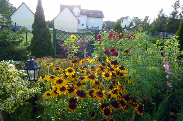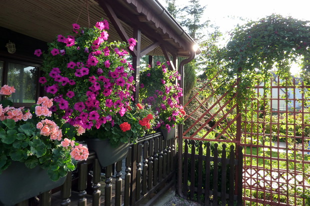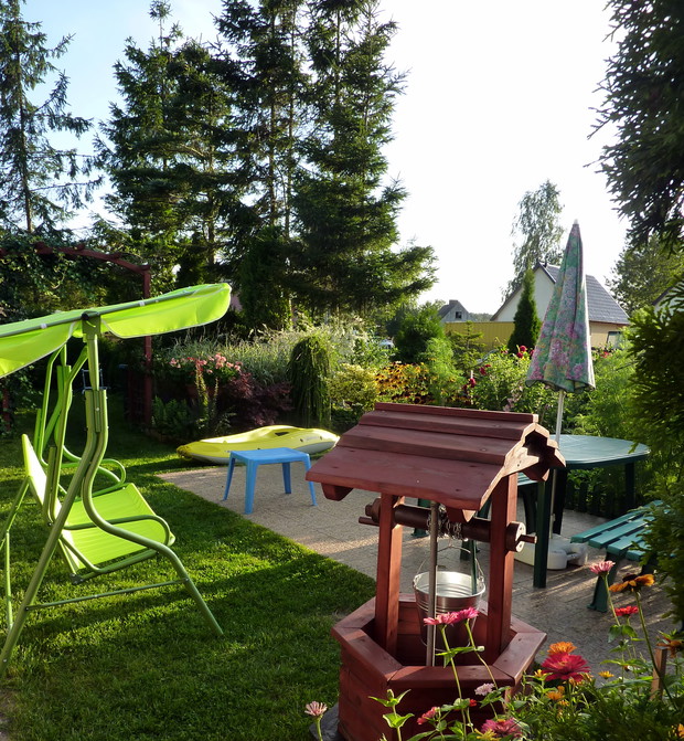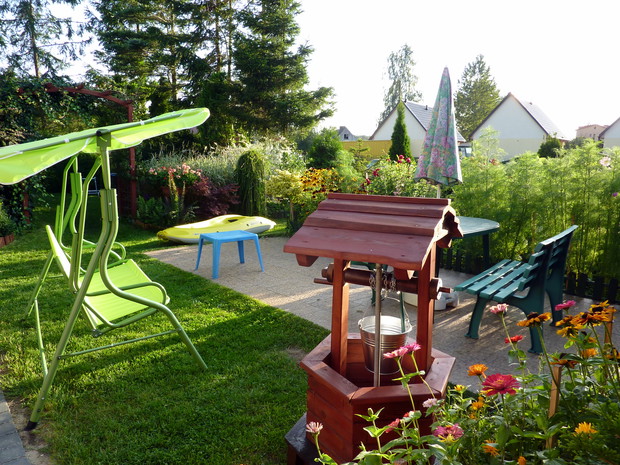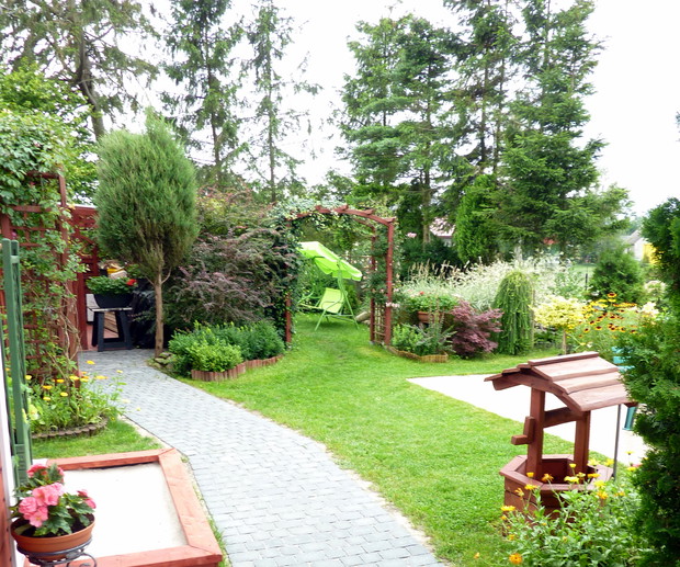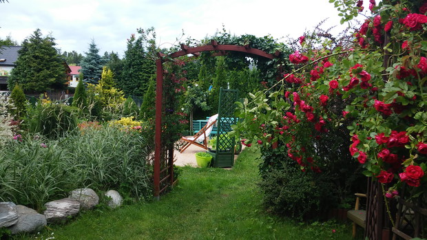 Nie sposób się nudzić, gdy ma się ogród! Każdy z nas ma jakieś pasje, naszą jest pielęgnacja ogrodu. Ogród mieści się nad morzem i tam często przebywam z rodziną. Nie sposób wszystkie prace w ogrodzie wykonać samemu. Moim pomocnikiem jest mój mąż. Wspólnie wykonana praca cieszy i nas, i rodzinę, która nas często odwiedza. Ogród daje nam wielką satysfakcję i nie sposób się w nim nudzić. Jak już jest porządek, to wypoczywamy. W naszym ogrodzie dominują drzewa, krzewy, tuje a przede wszystkim różne kwiaty, które kwitną od maja do późnej jesieni. W maju kwitną tulipany, narcyz, żonkile, w czerwcu nagietki, stokrotki, złocienie, goździki, powojniki, lilie, róże, od lipca do października kwitną cynie, rudbekia, dalie, kosmos i słoneczniki ozdobne. W donicach dominują petunie, dalie, nasturcje i pelargonie. Nad morzem bywa zmienna aura, należy pamiętać o podpórkach, zwłaszcza o daliach, szczególnie odmiana pomponowa i kaktusowa jest wrażliwa na złamania ze względu na wysokość. Kwiaty wymagają dużej pielęgnacji, często się usuwa przekwitłe kwiatostany, a gdy jest sucho to się systematycznie je nawadnia. Czas w ogrodzie płynie szybko, niczym jak dobra bajka, bo ogród do kraina baśni. Ogród to nasze magiczne miejsce.