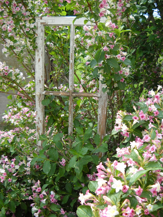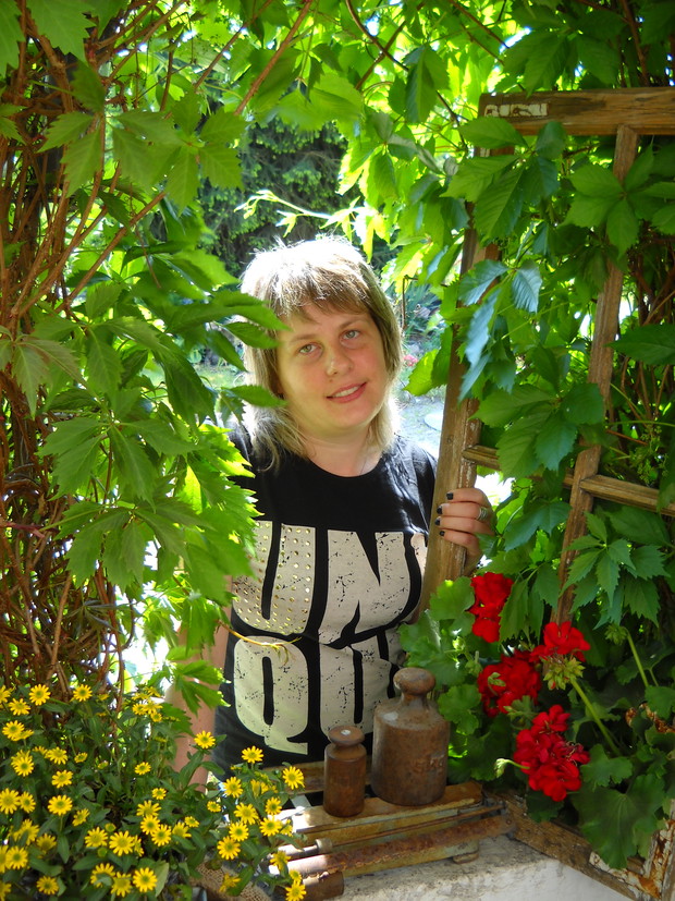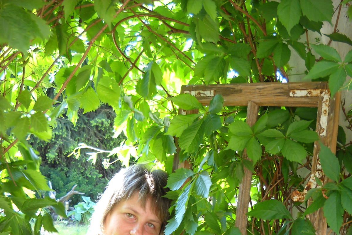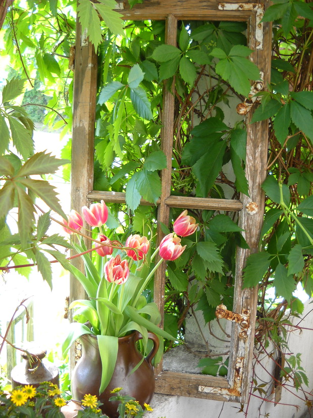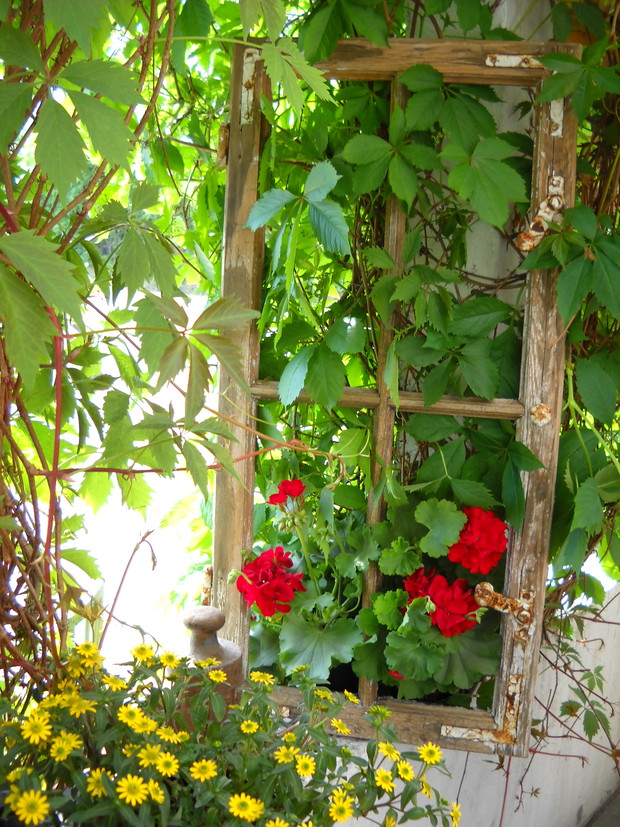 Tak oto stara rama okienna dostała nowe życie.Wkomponowałam ją w piękną zieleń która nadaje tła.Pelargonia bije swą czerwienią.Przy ramie obok moja skromna osoba.Moja aranżacja nabrała rustykalnego wiejskiego stylu dzięki dodatkom....................................................................................................................