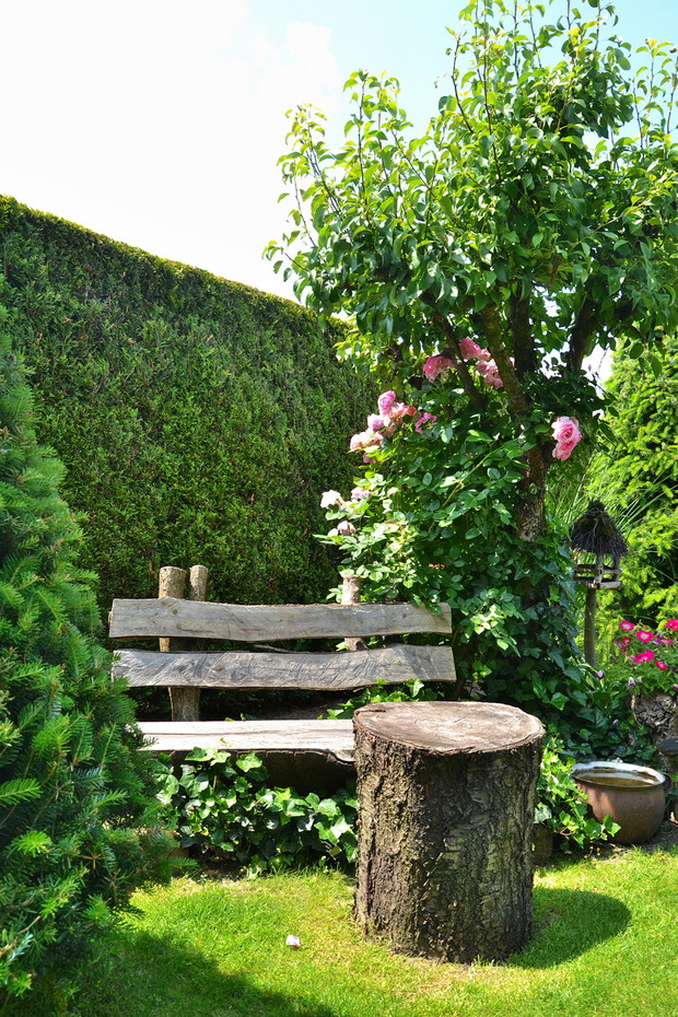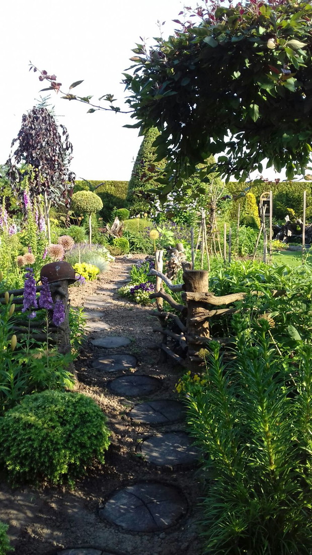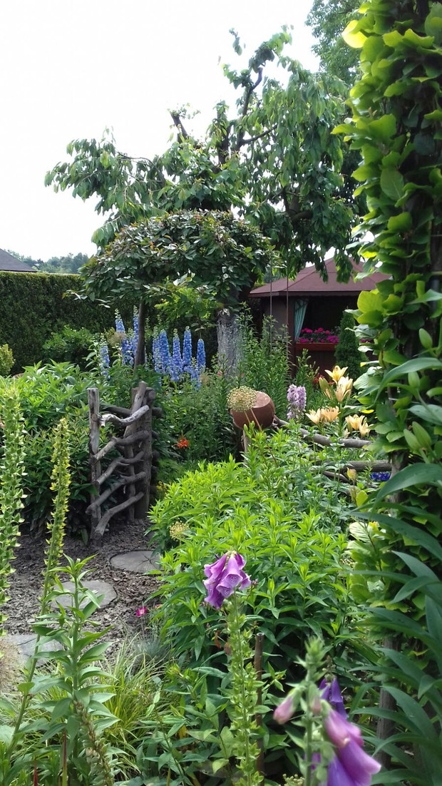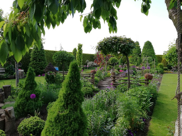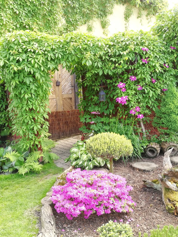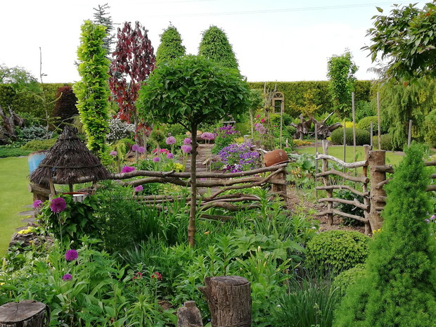 Moja ogrodowa przygoda rozpoczęła się 11 lat temu. Co roku powstawały nowe zakątki o różnej formie. Zawsze chciałam mieć swój tajemniczy ogród i do tego ciągle dążę. Myślę ze powoli mi się to udaje. Choć jest w nim mnóstwo pracy to ciągle powstają nowe pomysły które staram się realizować. Np. drewniana rama okna zyskała nowy blask a ogród zdobią własnoręcznie wykonane przeze mnie karmniki. W jednej z części ogrodu powstał tzw. ogród wiejski. Rosną w nim wszystkie "babcine" kwiaty takie jak: ostróżki, jeżówki, naparstnice, a wiosną całe mnóstwo tulipanów, żonkili i czosnków. Ta część ogrodu zmienia się najbardziej w ciągu roku. Jest on oddzielony od części warzywnej płotem z surowych gałęzi. Do ozdoby używam pni drzew i korzeni o ciekawych kształtach. Ostatnio na ścianie zawisły stare drzwi które kiedyś służyły jako wejście do stodoły. Wykończenia rabat zrobiono z grubych gałęzi dębowych a ścieżki są wyłożone plackami z jeszcze grubszych pni dębowych.