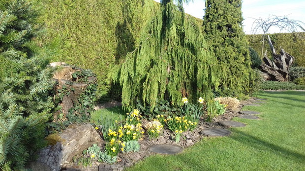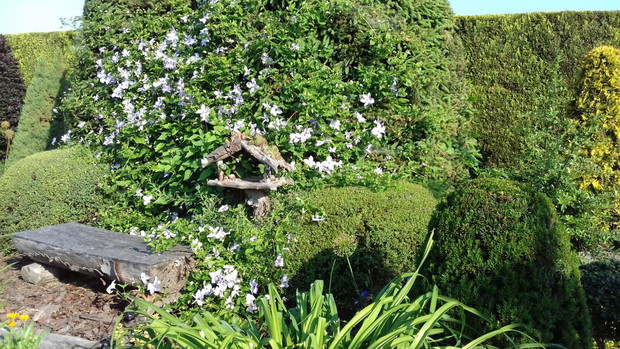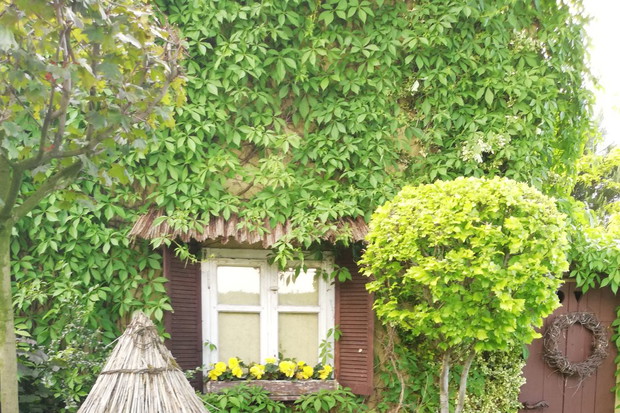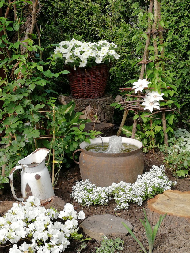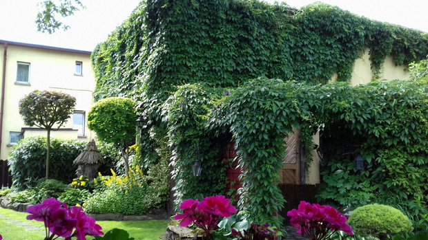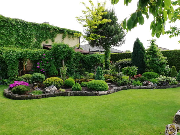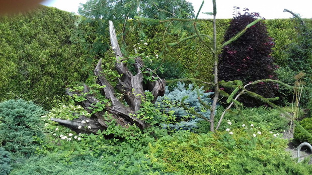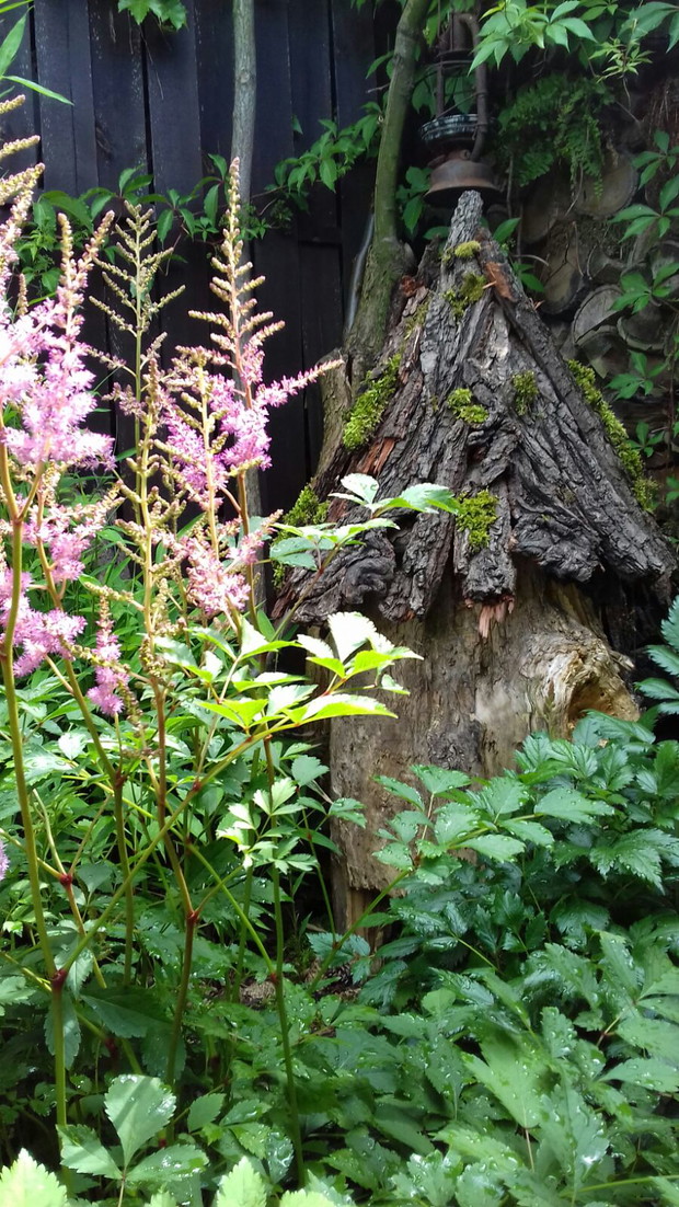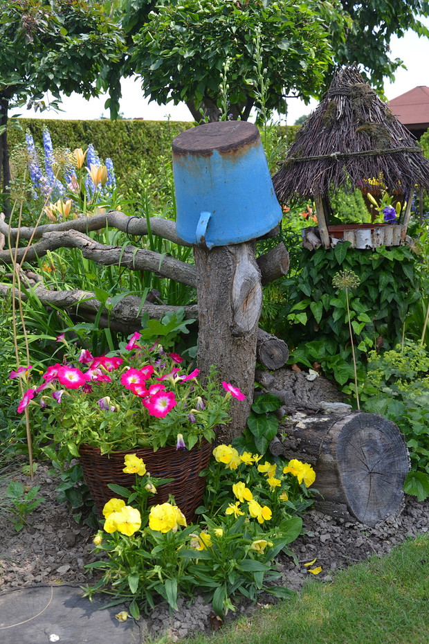 Moja ogrodowa przygoda rozpoczęła się 11 lat temu. Co roku powstawały nowe zakątki o różnej formie. Zawsze chciałam mieć swój tajemniczy ogród i do tego ciągle dążę. Myślę ze powoli mi się to udaje. Choć jest w nim mnóstwo pracy to ciągle powstają nowe pomysły które staram się realizować. Np. drewniana rama okna zyskała nowy blask a ogród zdobią własnoręcznie wykonane przeze mnie karmniki. W jednej z części ogrodu powstał tzw. ogród wiejski. Rosną w nim wszystkie "babcine" kwiaty takie jak: ostróżki, jeżówki, naparstnice, a wiosną całe mnóstwo tulipanów, żonkili i czosnków. Ta część ogrodu zmienia się najbardziej w ciągu roku. Jest on oddzielony od części warzywnej płotem z surowych gałęzi. Do ozdoby używam pni drzew i korzeni o ciekawych kształtach. Ostatnio na ścianie zawisły stare drzwi które kiedyś służyły jako wejście do stodoły. Wykończenia rabat zrobiono z grubych gałęzi dębowych a ścieżki są wyłożone plackami z jeszcze grubszych pni dębowych.