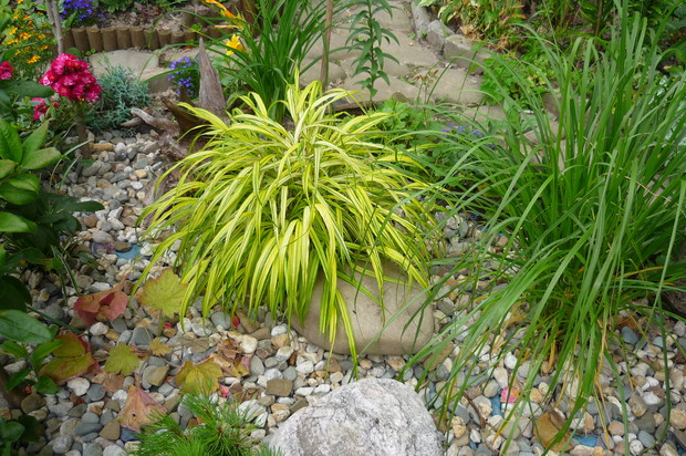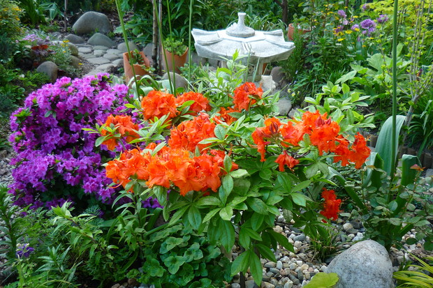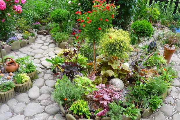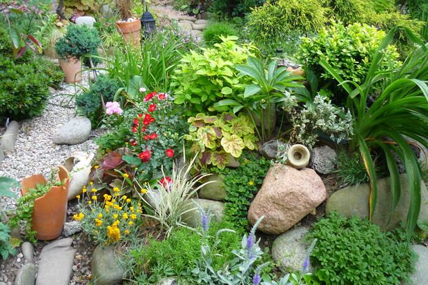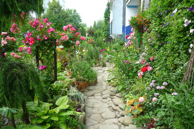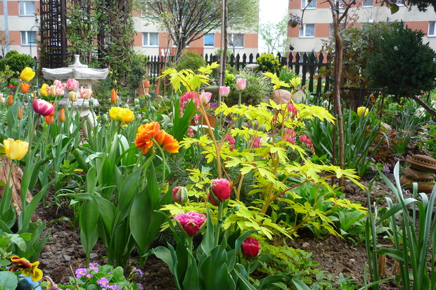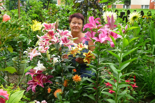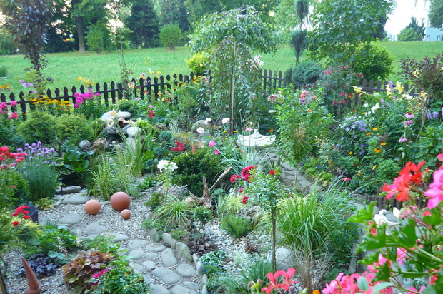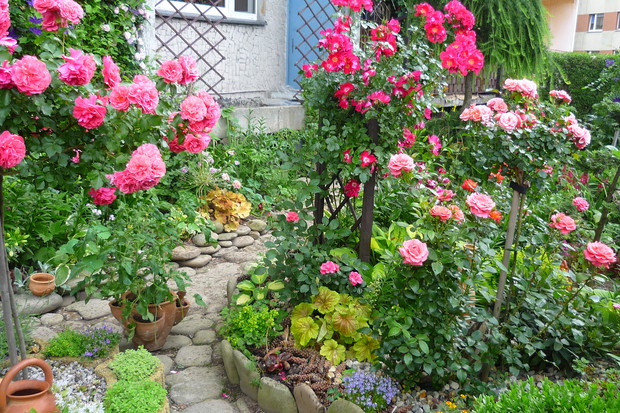 Ogród znajduje się przy budynku wielorodzinnym na jednym z osiedli w moim mieście. Nie jest to miejsce zwyczajne- to prawdziwy mały raj wśród blokowiska tętniący bogactwem roślin Mój ogród jest piękny o każdej porze roku.Od wiosny do póznej jesieni bez przerwy kwitną kwiaty. Jest tu miejsce na różnego rodzaju róze, azalie ,piwonie drzewiaste,hortensje . liliowce, floksy i moje ulubione clematisy i lilie. Do ogrody z balkonu prowadzą schodki drewniane, wykonane przez męża. W ogrodzie znajduje sie malutkie oczko wodne z dwoma rybkami i wykonaną własnoręcznie prze zemnie kaskadą wodną. Przyjemnie jest usiąść na balkonie z filiżanką kawy i posłuchać plusku spadającej wody. W upalne dni do oczka wodnego przylatuje dużo ptaków osiedlowych, aby napic się wody i obmyć piórka. Pluszczą sie w kaskadzie i rozbryzgują wodę Jest to przyjemny widok widząc jak ptaki sie ciesza, ja moge godzinani na nie patrzeć W czsie kwitnienia floksów i lilii w okół ogrodu unosi się przyjemny zapach. Mieszkańcy lubią tu spacerować i podglądać co jeszcze nowego rozkwitło. Są też tacy co się dziwią że mi sie tak chce- pracowac, a ja poprostu jestem szczęśliwa ,że mogłam stworzyc taka kwitnącą "Oaze "wśród bloków.