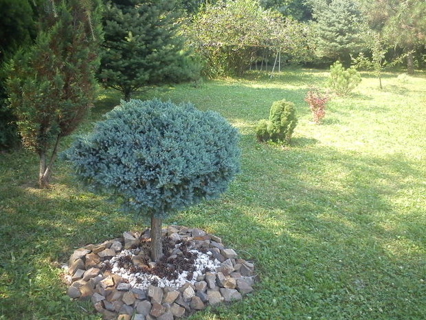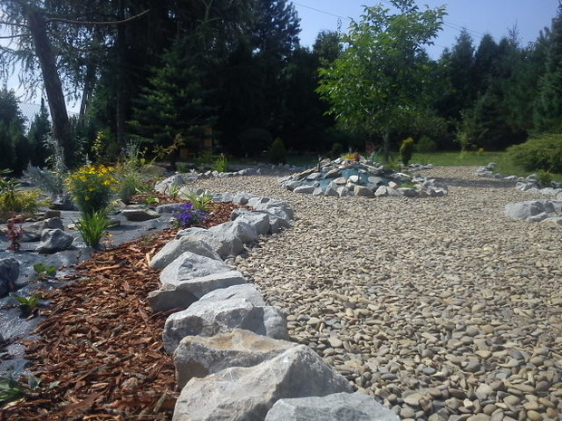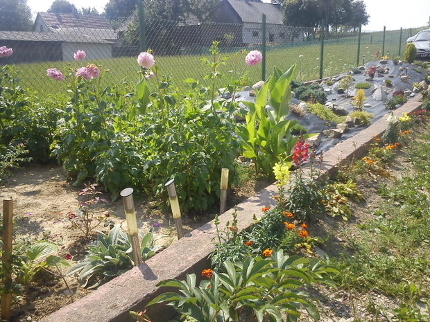 Nasz ogród został utworzony niedawno. Jest oczkiem w głowie męża, bo włożył w niego dużo pracy. Mamy mały skalniaczek pod domem i trochę większy ogród za domem, gdzie oprócz kwiatów (róże,konwalie, clematis, krokosomia, irysy, juki, przetaczniki, mieczyki, dalie, cynie...) i krzewów ( m.in. berberysy) rosną także owoce: winogrona, maliny, jabłka, agrest, aronie. Dróżki są usypane małymi kamyczkami i rozchodzą się na środku ogrodu. Otaczają je duże głazy z zewnątrz otoczone drobną korą. W naszym ogrodzie można wypocząć w cieniu, a także położyć się "na słońcu". Ogród jest robiony w tym roku, więc wszystko dopiero budzi się do życia, ale wiemy, że za trzy lata wszystko tu porośnie i będziemy jeszcze bardziej zadowoleni ze swojej pracy. Mąż planuje zrobić jeszcze drewnianą huśtawkę, altankę, oraz oczko wodne, tak by można było zaprosić gości do wspólnego wypoczynku. Nasz ogród otaczają od zachodu wysokie już tuje, co daje nam prywatność, jednak przy zachodzie słońca promienie ślicznie prześwitują przez gałązki, co tworzy piękną świecącą poświatę. W kącie ogrodu mąż zrobił namiastkę lasu, gdyż bardzo lubi leśne wyprawy; posadził paprocie, a opadające igły z sosen rosnących niedaleko tworzą jakby runo leśne, gdzie rosną też poziomki. Staramy się dbać o nasz ogród, bo to zaowocuje w przyszłości. Doglądamy go i podlewamy codziennie i patrzymy, jak rośnie nasze wspólne dziecko, a przy tym nasza miłość do siebie nawzajem :)