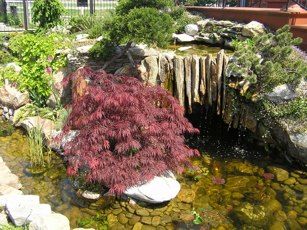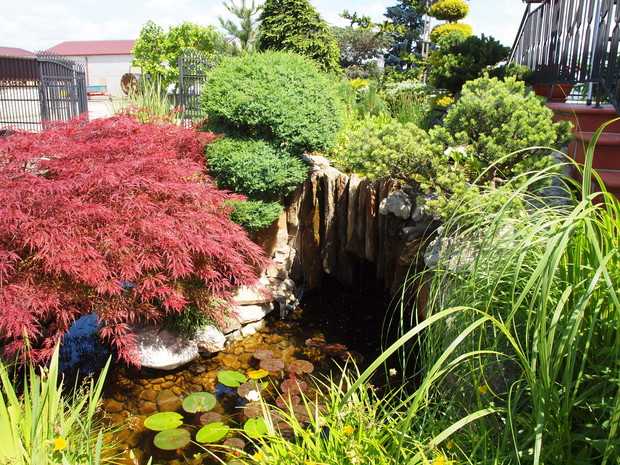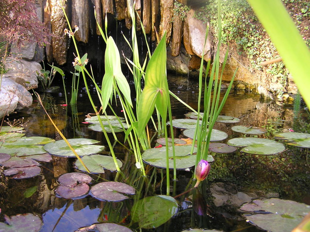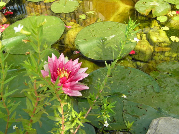 OCZKO WODNE Z MAŁĄ GROT!! OZDOBIONE JEST PRZEZ LILIE WODNE RÓŻOWE, AMARANTOWE,BIAŁE!!!! SWOISTYM RARYTASEM BYŁA LILIA WODNA NIEBIESKA OPRAZ HIACYNT WODNY KTÓRY PRZY UPALNYCH TEMPERATURACH WYPUSZCZAŁ KWIATY!!!! STRATEGICZNYM PUNKTEM ROŚLINNOŚCI W OCZKU JEST CZERWONY KLON PALMOWY I GÓRUJĄCY NAD NIM CYPRYSIK KSZTAŁTOWANY I CIĘTY NA STRUKTURĘ BONSAI!!!! OCZKO SKŁADA SIĘ Z MAŁĘJ GROTY NAD KTÓRĄ BIJE ŹRÓDEŁKO WPROWADZAJĄCE WODE DO MAŁEJ SADZAWKI Z NIEJ SKOLEI WODA SPLYWA NA DWIE STRONY. Z JEDNEJ STRONY PŁYNIE KASKADOWO DO DOLNEGO OCZKA A Z DRUGIEJ WPROSY PO KAMIENNYCH ŁUPKACH NA POGRANICZE STAWU Z GROTA!!!