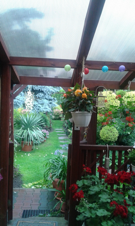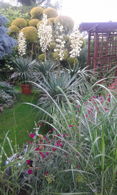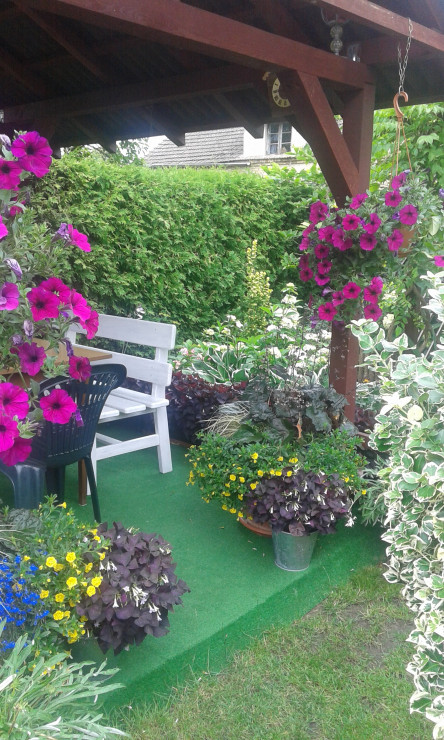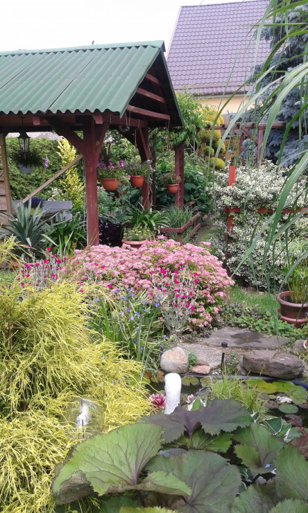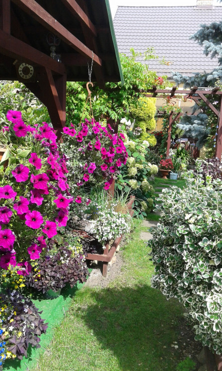 Zdjęcia przedstawiają ogród moich rodziców - mamy Anny i taty Józefa. Mieszkają w małej wiosce w województwie lubuskim. Każdą wolną chwilę poświęcają pracom w ogrodzie. Nigdy nie mieli ogrodnika, tylko sami stworzyli tak piękny ogród. Każdy kto ma ogród to wie, że właściciele ogrodu mają mało czasu na to, żeby w tym ogrodzie sobie posiedzieć, bo zawsze jest coś do zrobienia. Dlatego przesyłam te zdjęcia, aby inni mogli podziwiać ich ogród. Moja mama i tata zawsze mówią, że "ogród i wnuczka to całe nasze życie". Jest to ich pasja, co roku jest tych kwiatków i krzaczków coraz więcej i dlatego w tym ogrodzie jest tak kolorowo. Mam tych zdjęć bardzo dużo, ale nawet gdybym załączyła wszystkie to nie oddają one rzeczywistości. Różnego rodzaju iglaki, trawy, hortensje, kwitnące palmy, magnolie, azalie oraz cynie, lawendy i wiele innych kwiatków tworzą ten ogród. Jest to bardzo ciężka praca, ale efekty są. Jednym słowem mówiąc tu jest pięknie.