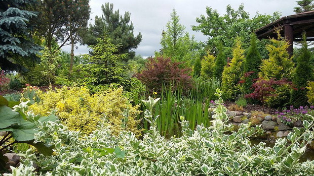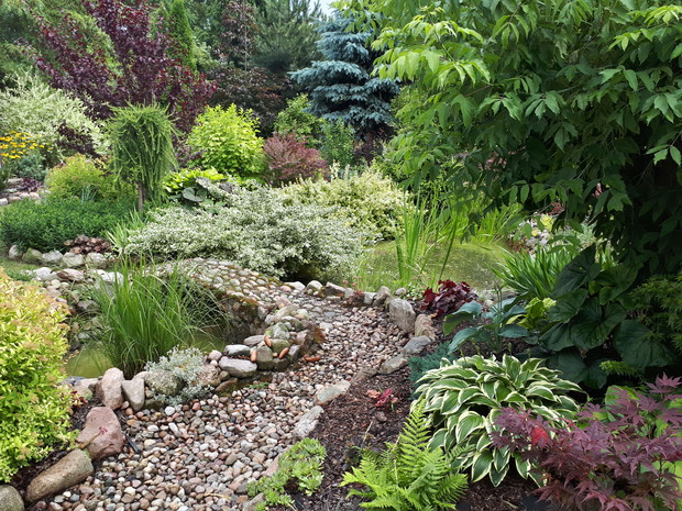 Ogród - Nasz Raj na Ziemi. Trwa właśnie 4 sezon, kiedy go z mężem tworzymy. Własnoręcznie zmieniamy, wzbogacamy stary ogród po rodzicach, który kiedyś świecił pustkami, a teraz to prawdziwa oaza barw, którą tworzą rozmaite gatunki drzew, krzewów, bylin. Sadząc nowe zdobycze staramy się, by nie było za zielono, by obok siebie znalazły się barwne różniące się kolorami, formami rośliny. Kompozycje uzupełniają kwitnące byliny, które zakwitają jedne po drugich, wzbogacając tym samym już istniejący kolorystyczny tęczowy akcent. Najstarsza część to okolice stawku, ten widok z altany na wodę i rośliny teraz najbardziej cieszy oko. Rośliny miały czas by pięknie się rozrosnąć. Ogród powstaje systematycznie, w zeszłym roku udało się wreszcie połączyć ze sobą świeżo powstałą część, gdzie znajduje się obszerny trawnik, a także dwu letnie rabaty. To miejsce cieszyć oczy będzie dopiero za 2/3 lata, kiedy malutkie sadzonki roślin podrosną, i efekt barwnych kompozycji będzie bardziej widoczny. Za tą częścią ogrodu jest już tylko spory warzywniak, i folia gdzie tworzę rozsady kwiatów i warzyw oraz nasz mały busz - lasek w którym ukryty jest kompostownik.