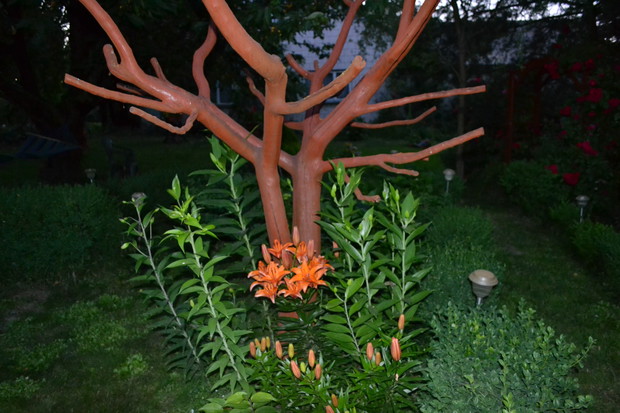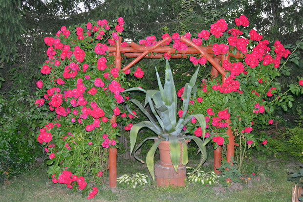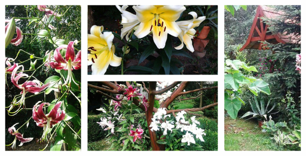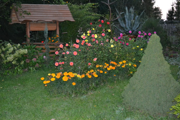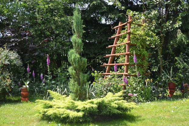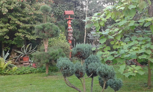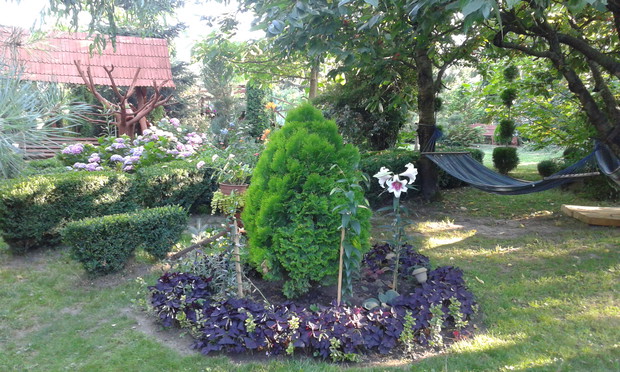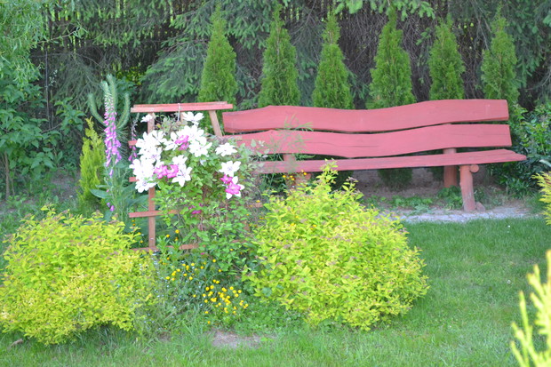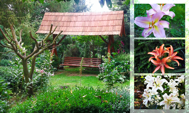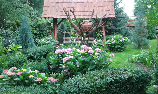 Ogród, który stworzyliśmy, a właściwie cały czas tworzymy i powiększamy, jest naszym miejscem na ziemi, naszą wspólną pasją. Inspiracje czerpiemy z natury. Staramy się łączyć pomysły i marzenia, wpisując je w zmieniający się wraz z kolejnymi porami roku krajobraz. Dlatego w naszym ogrodzie wszystko jest wykonane przez nas. Wspólnie zajmujemy się planowaniem nasadzeń i projektowaniem drewnianej architektury ogrodowej, którą później w większości wykonuje mąż, przy współudziale synów. Ja z córką, a teraz także z wnuczką, tworzymy rabatki, na których ciągle coś zmieniamy, przesadzamy, uzyskując coraz to ciekawsze aranżacje. Ogród, to przestrzeń, w której chętnie odpoczywamy całą naszą rodziną, ładując ,,baterie'' do dalszej pracy. Ulubionym miejscem wypoczynku w upalne dni są dwa hamaki pod czereśniami i krzesło peruwiańskie. Natomiast do biesiadowania służy kącik wypoczynkowy w sosnowym lasku, który zachwyca przez cały rok, nie tylko pięknem leśnych roślin, smakiem poziomek, ale przede wszystkim cudownym zapachem sosny. Wieczorem lubimy usiąść na ławeczce na moście, aby obserwować i słuchać uwijające się wśród drzew różnorodne ptaki, czasem wiewiórki, zachwycać się wspaniałą kolorystyką kwiatów, a przede wszystkim poczuć unoszącą się cudowną woń, która zmienia się wraz z rozkwitającymi krzewami i kwiatami. Kiedy patrzymy na ten nasz ciągle zmieniający się ogród, rozpiera nas duma i radość, że udało nam się stworzyć takie cudowne i jedyne w swoim rodzaju miejsce.