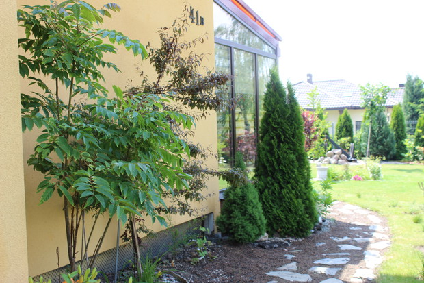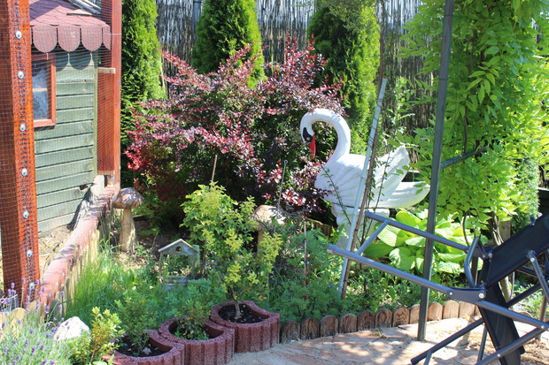Nasz ogród jest młody, ma zaledwie 5 lat, ale nie zmienia to faktu, iż cała nasza rodina wkłada w niego serce i pasję. Każda roślina, każdy nowy liść czy kwiat do dla nas radość. Przede wszystkim nie ma tu ingerencji żadnej frmy , całość tworzyliśmy własnymi rękami. Każdej wiosny czekamy na zieleń. Mamy w naszym ogrodzie kilka rarytasów m.in kuningamię chińską, paulownię puszystą, skrzydłorzech kaukaski i wiele innych. Gdy kupilismy działkę było tu pusto i smutno, a ponieważ to południowa strona tym bardziej trudno było dobrać gatunki odporne na takie warunki. Najpierw stworzyliśmy najwyzsze piętro z drzew a dopiero pod nimi sadzilismy inne gatunki. Oczko wodne pełne jest ryb - karpi, linów i karasi. Mieszkają tu żaby, jaszczurki i węże. Nieopodal rośnie buddleja która wabi setki motyli, także tych chronionych i rzadkich. Nasz 7 -letni synek pasjonuje się hodowlą drobiu ozdobnego i z tego względu musieliśmy wygospodarować w ogrodzie teren na wolierę. Mąż zadbał o estetyczny wygląd woliery a synek o zwierzęta. Kolorowe bażanty i nietypowe kury to bardzo towarzyskie stworzenia. Obok woliery rośnie babus drzewiasty odmiany Atrovaginata, przy oczku zaś modrzew , liliowce, lespedeza bicolor. Każdego roku dosadzamy nowe okazy lub zmieniamy miejsce pobytu już obecnych. W tym roku posadziliśmy sośnicę japońską i czekamy na owoce cytryńca chińskiego. Ogród to dla nas odskocznia od codzienności, miejsce piękne, spokojne. W naszym regionie jest około 130 jezior, blisko także mamy Biskupin i lasy, sarny podchodzą do ogrodzenia a różnorodność gatunków ptaków potrafi zaskoczyć. Juz od marca wypatrujemy zieleni i czekamy cierpliwie na słońce. Naszą duma jest mamutowiec olbrzymi oraz metasekwoja chińska. Mimo, iż działka ma około 1000 m2 to znajdzie się tu zawsze miejsce na coś nowego. Z Holandii przyjechał 3 lata temu hibiskus trzykolorowy i kwitnie bajecznie co roku. Całe życie mieszkaliśmy w mieście w bloku.Teraz dopiero czujemy czym jest odpoczynek. I nie ma znaczenia czy działka ma 1000 m 2 czy 5000...to swój kawałek świata urządzony tak, jak tego chcemy, pełen pasji i miłości a rosliny to czują. Nie mielibyśmy żadnej satysfakcji z ogrodu robionego na zamówienie przez firmę. Tu my wkładamy serce i uczymy się na własnych błędach, czasem przypłacam to łzami a czasem radość jest ogromna ale na tym polega praca w ogrodzie. I my to wiemy.
