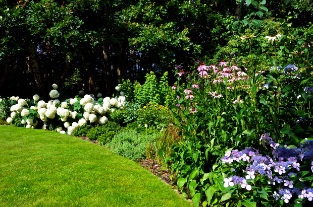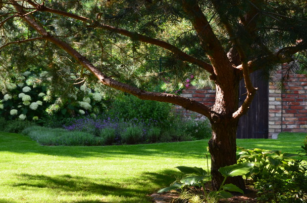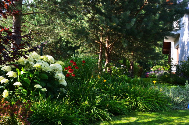 Mój ogrodowy zakątek na skraju lasu tworzę od 4 lat. Dęby, brzozy i sosny " wchodzą " do ogrodu i tworzą klimat , o którym zawsze marzyłam. Dają co prawda dużo cienia i stwarzają ograniczenia , ale myślę ,że poniesiona ofiara jest warta niepowtarzalnego uroku jakie dają stare drzewa. W cieniu rzucanym przez korony drzew doskonale czują się moje ulubione hortensje , rododendrony i hosty. Miejsca słoneczne niepodzielnie należą do piwonii, lawendy i róż. Późnym latem uroku rabatom dodają kwitnące trawy i jeżówki. Staram się wybierać rośliny , które nie tylko pięknie pachną ale także zwabiają do ogrodu motyle, pszczoły i inne pożyteczne owady. Piwniczka , którą mąż stworzył na potrzeby domowych przetworów doskonale sprawdza się w roli skalniaka . Szczególnie wiosną cieszy oczy, gdy mieni się barwami goździków i floksów. Wiele frajdy sprawia grill i wędzarnia , która w tym sezonie stała się gwoździem programu ogrodowych spotkań i daje przepyszne wędliny. Wszystkie prace w ogrodzie wykonuję sama. Sadzę, przesadzam i stale coś zmieniam i mimo, że to ciężka praca sprawia ogromną przyjemność. Zgodnie z powiedzeniem ,że " ręce w ziemi dobrze robią na " głowę" życzę wszystkim takiej możliwości relaksu.:)