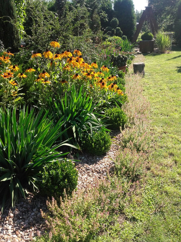 W galerii "Ogrodnik doskonały" chciałabym zaprezentować mój ogród, który jest tworzony od ponad 15 lat. Pierwsze prace związane z nasadzeniami roślin, wykonaniem trawnika zapoczątkował mój tata. Ogród ma powierzchnię 25 arów. Jest podzielony na dwie części: część reprezentacyjna oraz część ogrodu warzywnego z mini sadem owocowym. Na zdjęciach można zauważyć wiele formowanych roślin w szczególności są to bukszpany wiecznozielone, żywotnik zachodni "Smaragd", cis pospolity. Mogę śmiało powiedzieć, że przycinanie i formowanie krzewów i drzew jest naszym ulubionym zajęciem. Stawiamy na nasadzenia grupowe bylin, które w szybkim czasie stają się bardzo okazałe. Dla owadów a w szczególności dla pszczół sadzimy rośliny, które najbardziej je przyciągają a są to m.in. liatry kłosowe, przegorzany pospolite, rudbekie, jeżówki a z kolei dla ptaków czeka miniaturowe oczko wodne ze świeżą wodą. Wiele roślin próbujemy sami rozmnażać, posiadamy swoją własną mini szkółkę. Nigdy nie kupiliśmy żadnego bukszpanu a mamy ich setki. Huśtawkę oraz meble ogrodowe wykonujemy poprzez wykorzystanie starych elementów, które powinny trafić do skupu złomu. W tym roku udało nam się nadać drugie życie starej, żeliwnej wannie z której powstała kanapa ogrodowa. Jak widać na załączonym zdjęciu kot Feliks jest bardzo zadowolony z nowego miejsca do leniuchowania. Ogród nie tylko ładnie wygląda latem kiedy wszystko jest zielone ale także zimą pod 30 centymetrową kołderką śniegu. Uwielbiamy się relaksować w ogrodzie