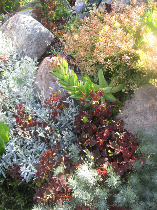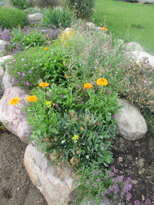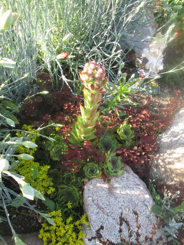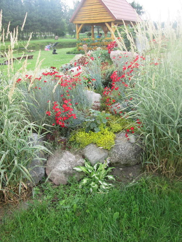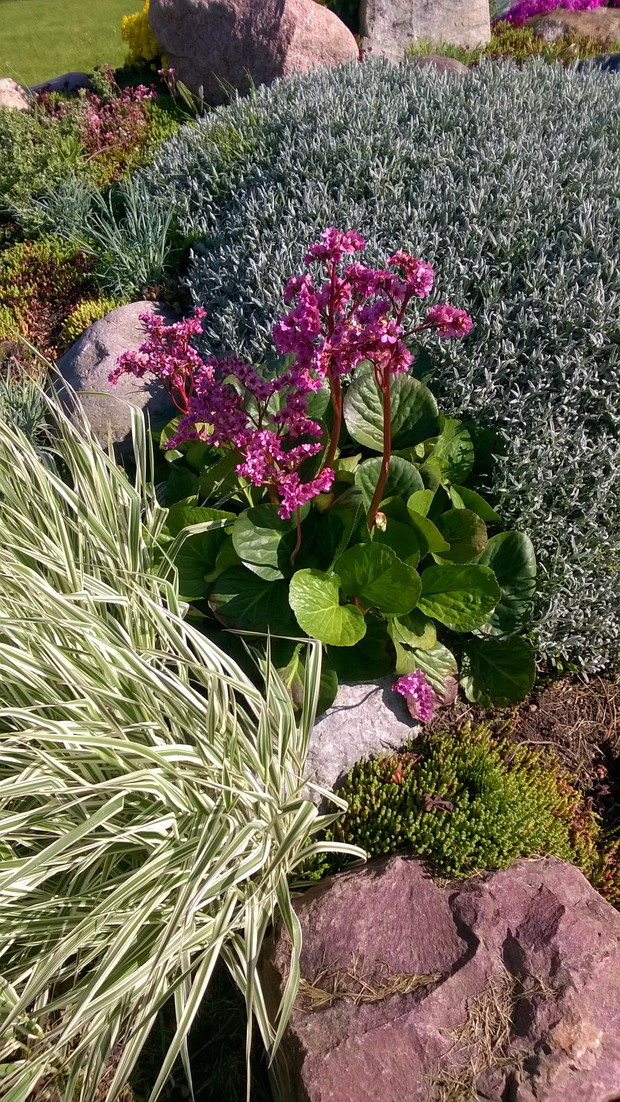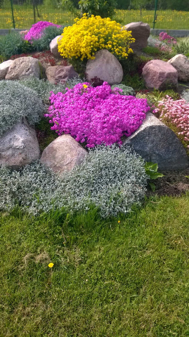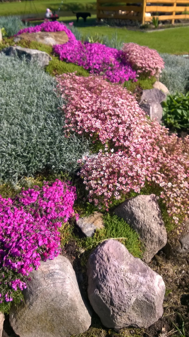 Skalniak jest interesującą częścią mojego ogrodu. Warto wspomnieć, że wszystkie kamienie na jego stworzenie pochodzą z naszej posesji. Od wczesnej wiosny skalniak żyje pełnią życia. Jako pierwsze kwitną krokusy i tulipany karłowate. Później zakwita płomyk szydlasty w kolorze purpury i rogownica. O różnych porach roku kwitną rojniki i rozchodniki, skalnica, żagwin, smagliczka górska, barwinek, maciejka, stokrotka, funkie, bylica, miodunka plamista, goździk postrzępiony oraz bergenia sercolistna. Rośliny rozrastają się i rozsiewają tworząc dywan z roślin na którym nie ma miejsca dla chwastów.