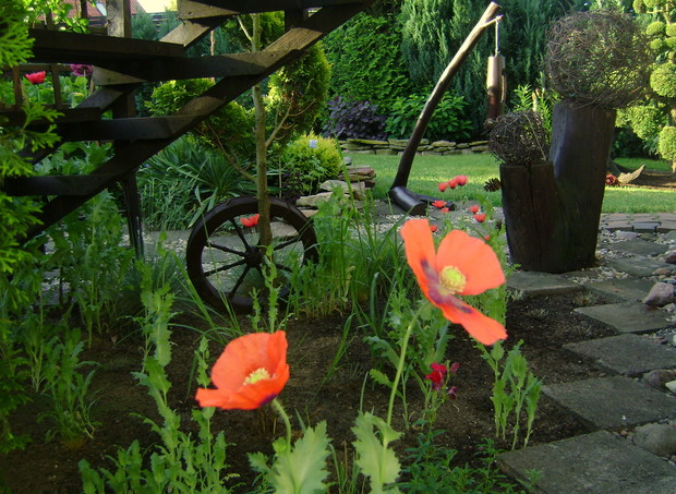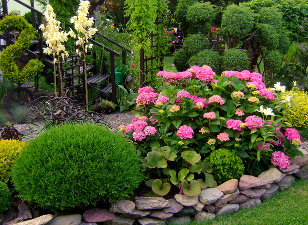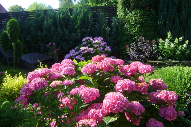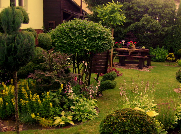 Na działce o powierzchni 6 arów znajduje się otoczony ogrodem dom z powierzchnią tarasową oraz wiata. W ogrodzie króluje roślinna różnorodność z drobną przewagą hortensji. Całość otoczona jest tujami i świerkami. Sporo drzew iglastych w ogrodzie została przycięta w ciekawe formy - to ja samodzielnie nadaje kształt moim roślinom. Ogród podzieliłam na trzy części: reprezentacyjną , wypoczynkową oraz gospodarczą. W części wypoczynkowej rośnie sporych rozmiarów drzewko bonsai oraz stoi duża drewniana leżanka, która zachwyca swoim wyglądem i oryginalnością. W drugiej części reprezentacyjnej znajduje się romantyczne oczko wodne z kaskadą, kolorowe wysepki kwiatowe pełne kwitnących róż. Wszystkie rabaty kwiatowe oddzielone są od trawnika polnymi kamieniami co znacznie ułatwia koszenie. To właśnie między nimi znajduje się huśtawka dla wnucząt oraz komplet mebli drewnianych. Jest to miejsce, gdzie można usiąść z kubkiem kawy w ręku i zachwycać się pięknymi widokami ogrodu. W ostatniej części gospodarczej znajduje się piękna drewniana ściana i drzwi w kolorze ciemnego brązu, na których wiszą oryginalne przedmioty ze swoją wiekową historią – są to prawdziwe starocie tj. podkowy, atrapy okna, sierpy itp. Drzwi wiaty przemieniłam na galeryjkę moich prac, które są zmieniane regularnie w zależności od obowiązującej pory roku – czasem są to ozdoby z gałązek brzozy, innym razem lawendowy wianek w kształcie serca. Imponujący efekt, który udało się osiągnąć to ciężka praca moich rąk.