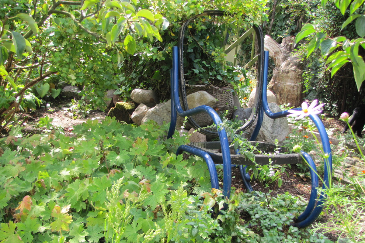 Dzień Dobry chciałabym Państwu zaprezentować mój ogród. Jestem nauczycielem plastyki i w związku z tym paleta barw nie jest mi obca. Taki właśnie jest mój ogród: kolorowy, tematyczny, z kwiatami, drzewami, z miejscem do siedzenia, z kurnikiem do którego wchodzi się przez 100 letnie drzwi, ze zwierzętami , nami domownikami. Ponieważ nie jest to duży ogród, a kocham wszystkie rośliny to jest urozmaicenie od drzew iglastych jak świerk, cis. Drzewa liściaste brzoza z której moja córka najbardziej się cieszy bo ma tyle lat co ona czyli już ponad 30 lat, tulipanowiec, jaśmin, leszczyna oraz drzewa owocowe jabłoń, wiśnia, grusza. Roślin jest mnóstwo więc ogród jest podzielony na części tematyczne. Część morska w której dominują niebieskie doniczki kupowane przeważnie na targach, a w nich pelargonie, dalie. Część morską od następnej oddziela wiklinowy płot, za którym kryje się płożąca tuja, żarnowiec, tawlina jarzębolistna, jabłoń, oraz przeplatają się irysy, kosmosy, rośnie nawet w zaciemnionym miejscu melisa. Część tzw. Biesiadna, otoczona jest licznymi kwiatami doniczkowymi: begoniami, opuncją, różami, niezapominajkami oraz tujami, które już są na tyle duże, że tworzą naturalny płot. Również blisko znajduje się małe oczko wodne z fontanną. Siedząc lub leżąc każdy może odprężyć się przy szumie wody trzymając w ręku książkę. Wychodząc dalej przechodzimy przez pergolę utkaną z róży w kolorze herbacianym. Za nią znajduje się klatka ze świnką morską przed nią zaś klatka z koszatniczką. Po jednej stronie mam zielnik, a w nim: tymianek, tymianek cytrynowy, miętę, melisę, oregano,bazylię, majeranek. Od zielnika idziemy w stronę kurnika, a w nim 3 kury i kogut, który jest naszą ozdobą. Przechodząc ścieżką z kamieni widzimy piękną różę. Całość zrobiona jest z drewna otoczonego bluszczem oraz koszykami wiklinowymi. Jeśli spojrzeć na wprost widzimy margaretki, truskawki pnące w doniczkach, Irysy, ostróżka, wierzba syberyjska, jarząb kanadyjski, kolejne róże tym razem białe i żółte oraz ulubioną roślinę mojej córki budleję. Przechodzimy w głąb dochodząc do części leśnej, która jest całkowicie zaciemniona. Bluszcze, drzewa iglaste, konwalie, kiścień, azalia. Wszędzie towarzyszą nam nasze zwierzęta domowe trzy koty oraz pies. Mój ogród jest odzwierciedleniem mnie.