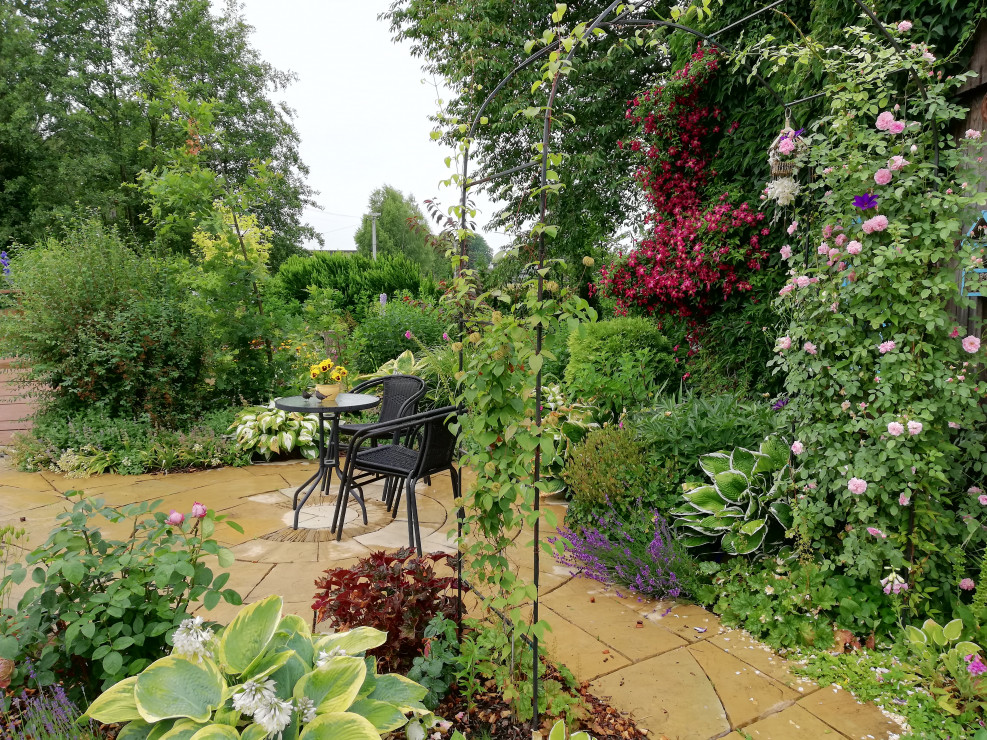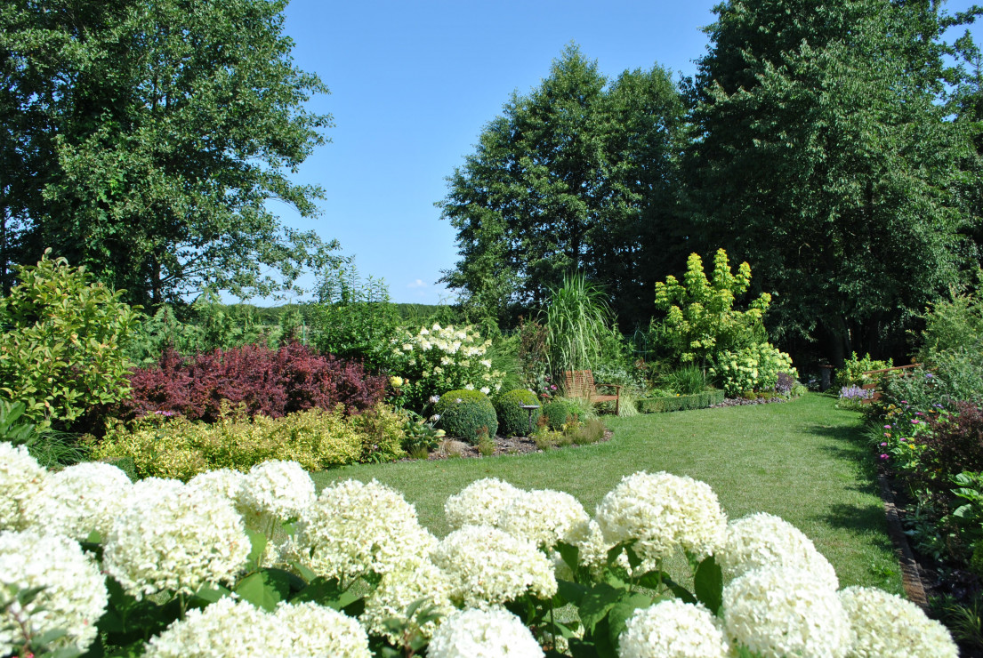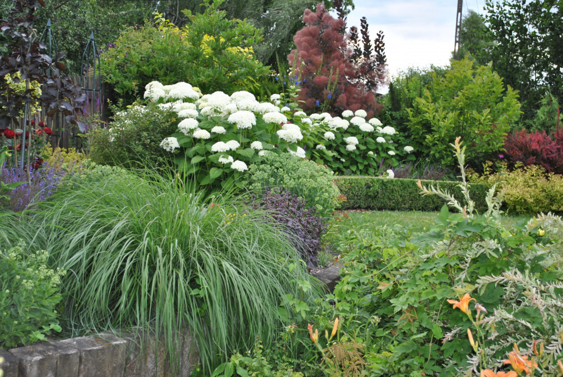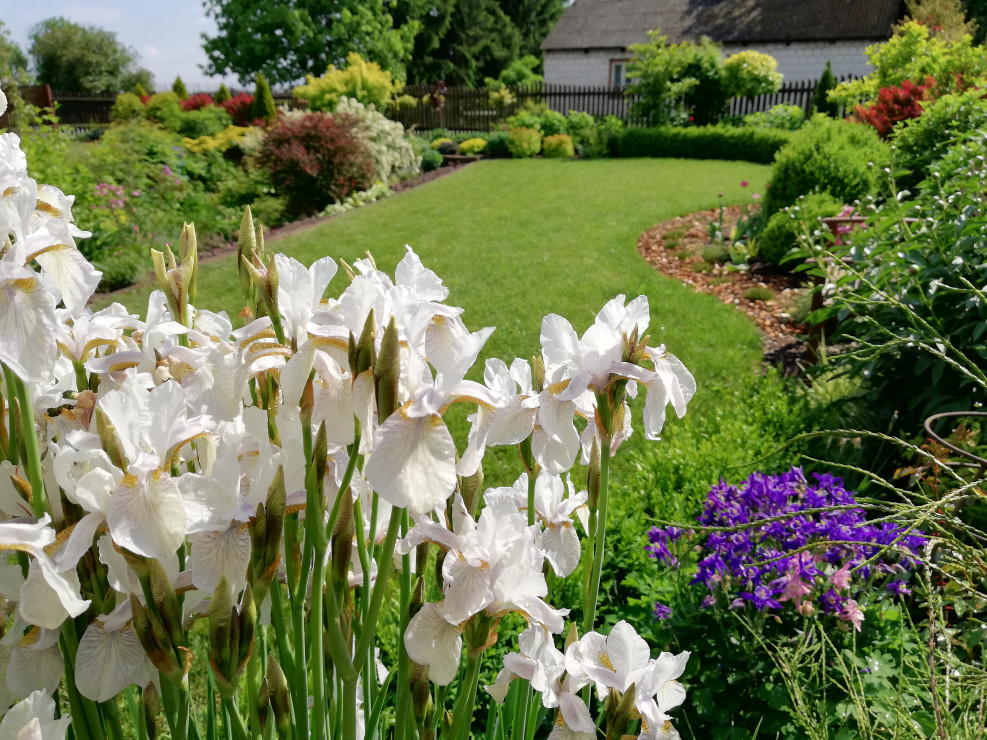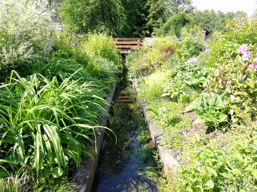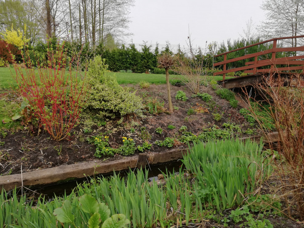 Witam i zapraszam do obejrzenia Naszego Ogrodu z niebieskim oknem ! Ogród ma 5 lat a powstał na totalnym ugorze . Przez działkę przepływa rów melioracyjny który kiedyś był czymś niechcianym ! Teraz cieszy oko dzięki zagospodarowaniu i dopasowaniu roślin na rabatach przy wodzie i nie tylko. Działka ma powierzchnię ok 30 arów znajdują się na niej budynki gospodarcze, plac zabawa dla dzieci oraz miejsce wypoczynkowe - placyk otoczony roślinnością . Ogród cieszy każdą porą roku.Wiosną królują kolorowe tulipan i inne cebulowe . Latem oczy cieszą byliny ostróżki, liliowce i kosaćce . Nie wyobrażam sobie żeby na rabatach brakowało host hortensji i traw!! Urzekają mnie swoim pięknem zwłaszcza na jesiennych rabatach . Niezawodne zestawienie hortensji rozchodników i traw sprawia że każda chwila spędzona w ogrodzie bardzo cieszy! Zima jest równie piękną porą roku gdzie powiązane w chochoły trawy kołyszą się na wietrze. Nasz ogród choć młody ma sporo mieszkańców dzikie kaczki ,jeż czy wiewiórka czują się w nim dobrze!