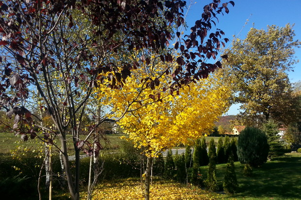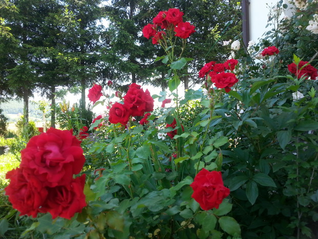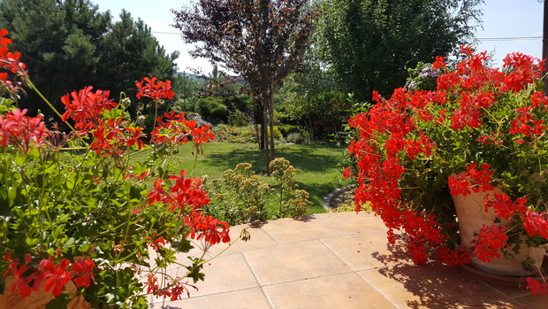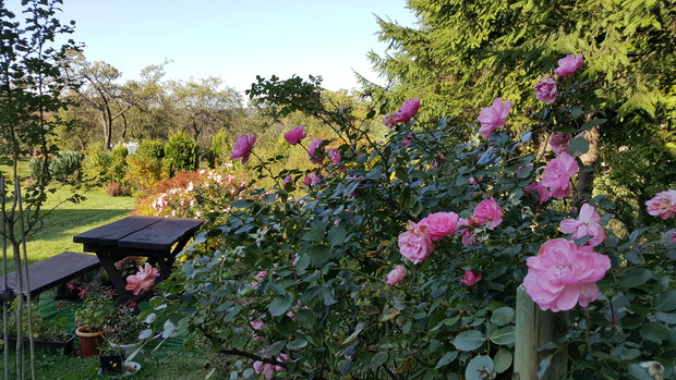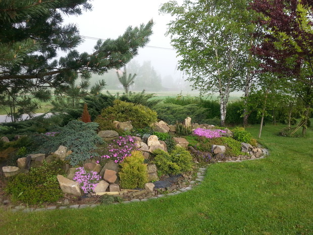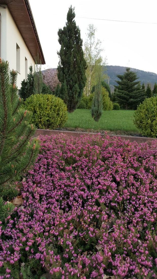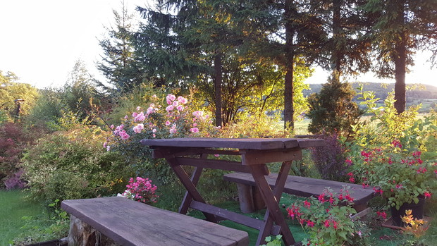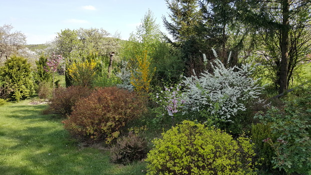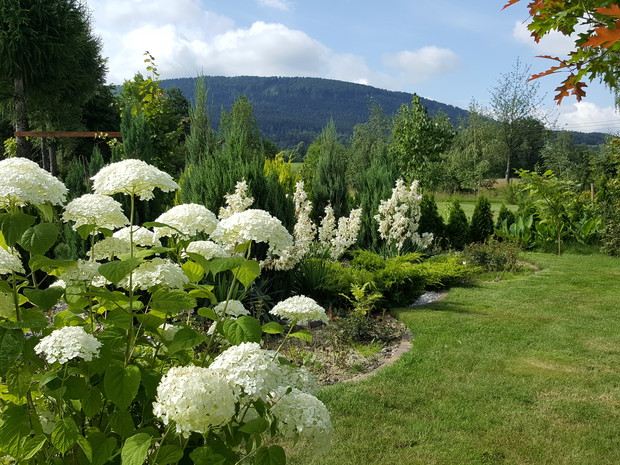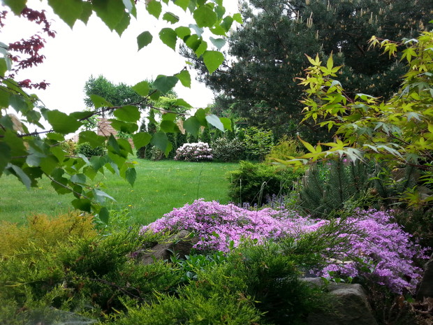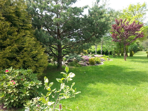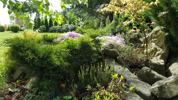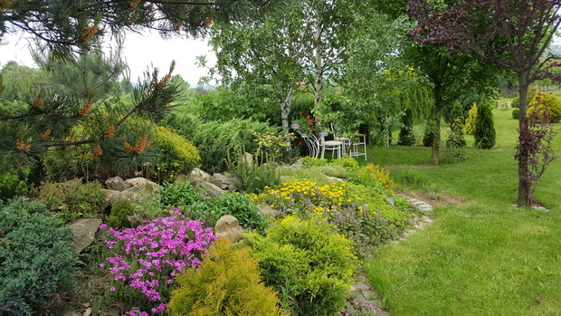 Kiedy wybraliśmy miejsce na swój dom, na działce nie było ani jednej ozdobnej rośliny. Wszystko trzeba było zaplanować od początku, a przy braku wiedzy ogrodniczej było to niezmiernie trudne. Od początku założenie było takie, że ogród ma być przyjemny i pożyteczny, czyli miał się podobać i być miejscem odpoczynku. Ogród założyliśmy sercem . Pierwsze posadzone rośliny ozdobne jak i drzewka owocowe pochodziły z recyklingu, ponieważ bardzo zależy nam na ochronie środowiska i segregacja odpadów towarzyszyła nam od samego początku. Dodatkowym plusem było też to że mając konkretne rośliny można było wybierać dla nich miejsce, a potem dokupić rośliny uzupełniające. I tak z roku na rok zdobywaliśmy rośliny, wiedzę i doświadczenie, choć niektóre rośliny wielokrotnie zmieniały swoje miejsce, niektóre nie przetrwały, a część znalazło od razu optymalne dla siebie miejsce. W ogrodzie znalazły się także rośliny których pozbywali się znajomi i one właśnie odwdzięczają się wspaniałym wzrostem, kwitnieniem czy owocowaniem. Ogród jest podzielony na kilka części tematycznych ale jest tak założony że z każdego okna domu rozciąga się widok na pewną jego część, ponieważ dom stoi dokładnie w środku. Różnorodność kwitnących krzewów powoduje że ogród dosłownie mieni się kolorami cały rok, a uroku dodaje mu jeszcze piękne, zalesione zbocze pobliskiej góry która jest tłem dla ogrodu od strony południowej. Poza walorami ozdobnymi ogród dostarcza również wielu owoców, ponieważ drzew i krzewów