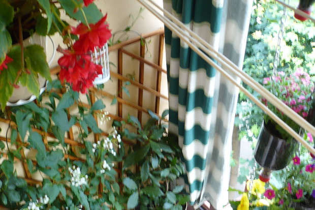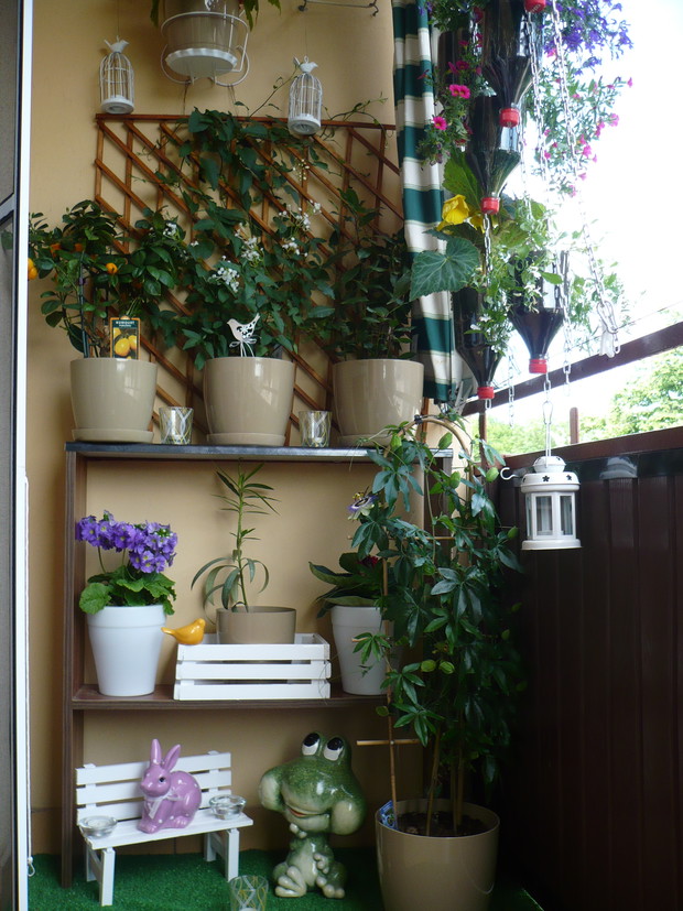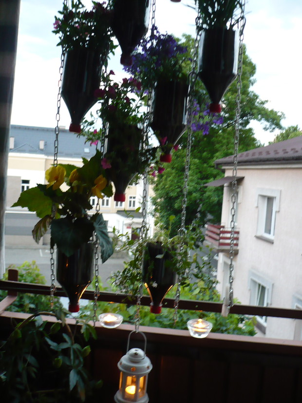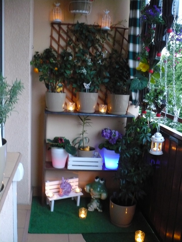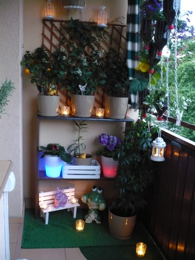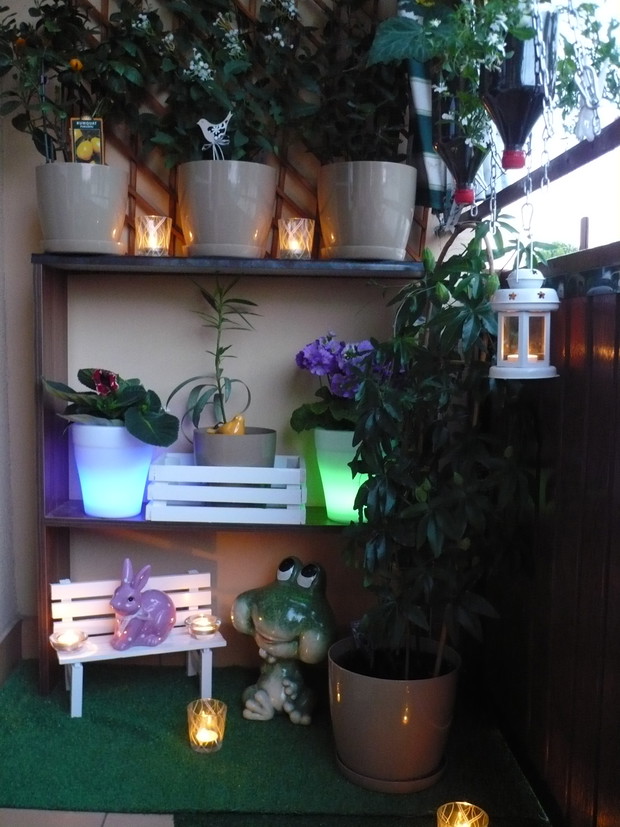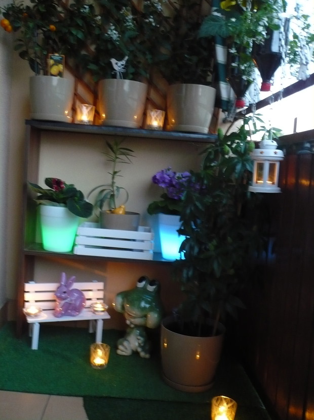 Wąski balkon metr , szerokości więc postanowiłam troszkę dać kwiatów i go zmienić w mini ogródeczek balkonowy postanowiłam również trochę w ekologię , wiszące na łańcuchach butelki plastikowe po wodzie , i posadzone w nich są różne odmiany kwiatów :-) są też jak widać na zdjęciach doniczki podświetlane w nocy wyglądają rewelacyjnie , jak i są świeczniki ze świeczką odstraszającą komary :-) na podłodze posiadam sztuczną trawę wygląda świetnie każdy kto przychodzi do mnie myśli że posiadam żywą trawkę Bardzo miło spędzam na balkonie czas jest po prostu pięknie zapraszam znajomych na kawkę i przepyszną szarlotkę :-) polecam kto też posiada wąski balkon do takiej dekoracji Zachęcam do głosowania na mój mini balkon , kto nie posiada takiego balkonu może sobie zrobić tak jak ja zrobiłam butelki wiszące na łańcuchach