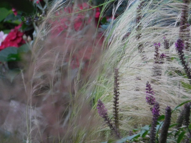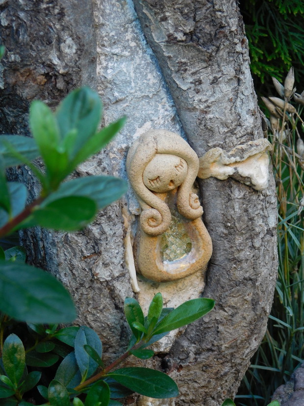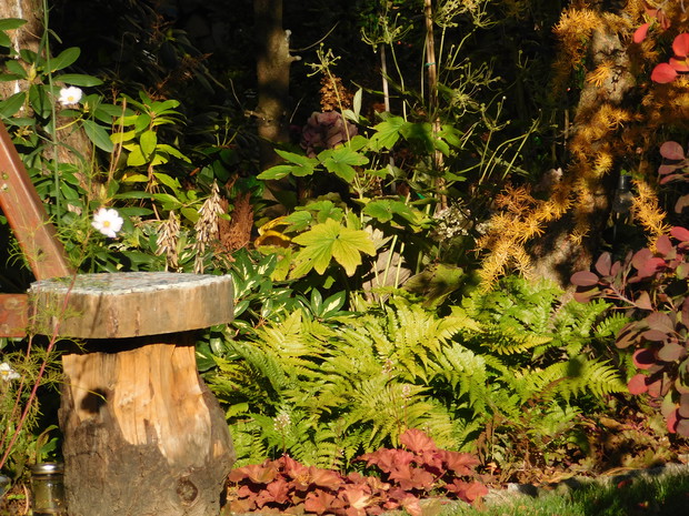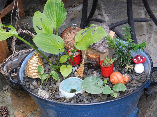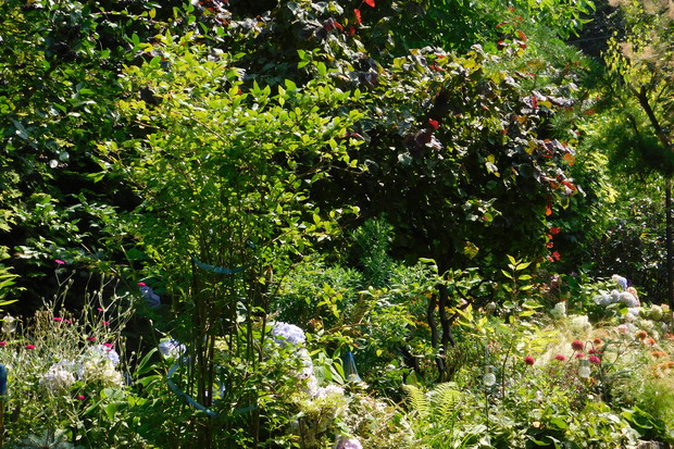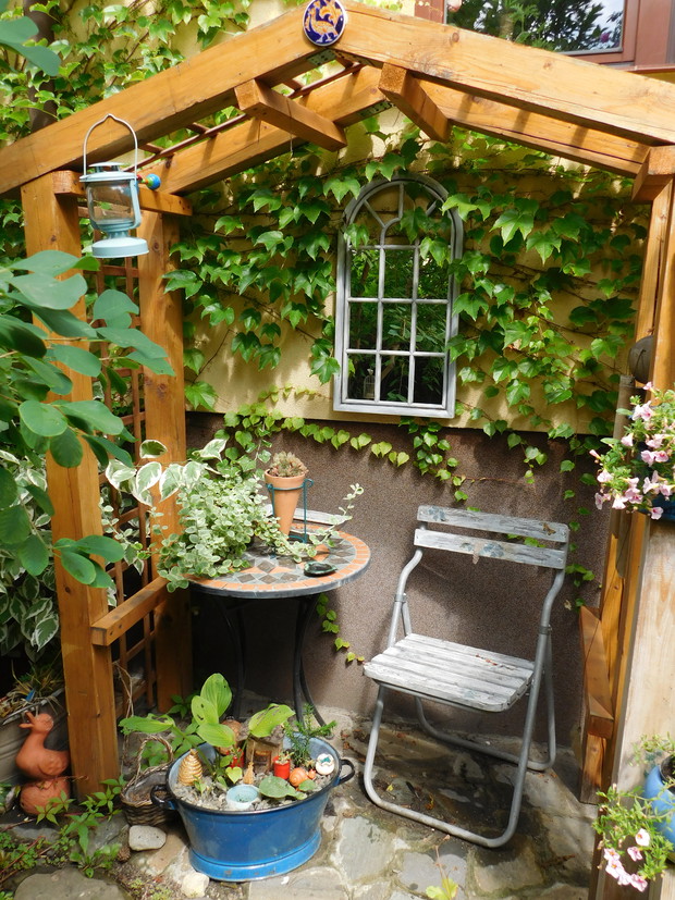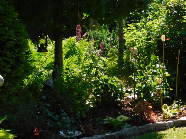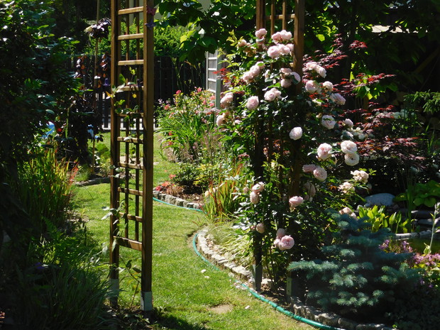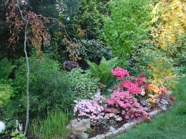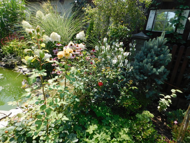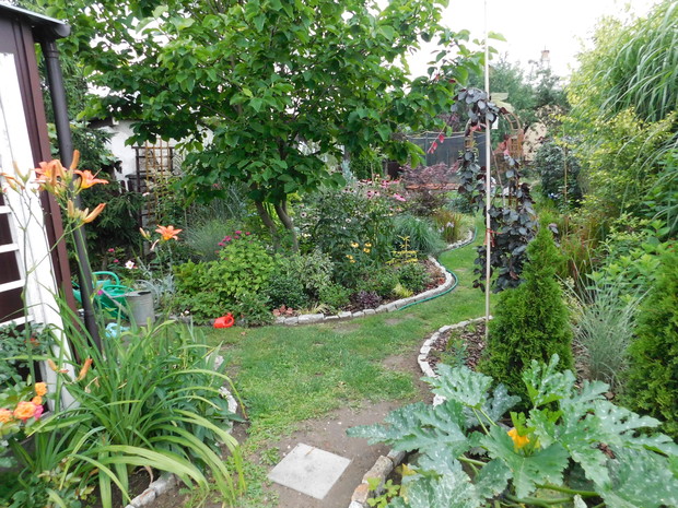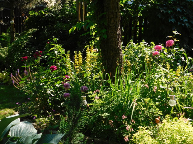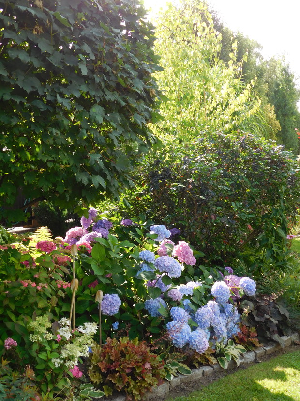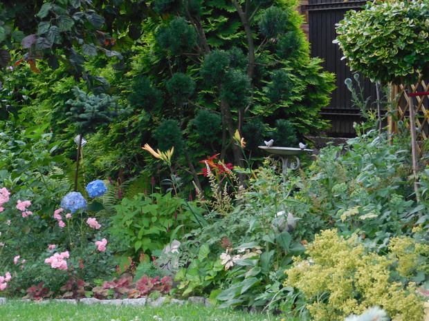 Ogród, choć nieduży mieści sporo drzew i krzewów. Byliny stanowią uzupełnienie. Jest w nim dużo ciekawych odmian hortensji, rododendronów. Przebywanie w ogrodzie daje mi bardzo dużo radości, bo umożliwia podziwianie nie tylko roślin, ale także zamieszkujących go zwierząt, których jest bardzo dużo. Ptaki mają tu swoje stałe miejsce - jest kilka budek lęgowych, karmników, poidełek i oczko wodne, więc głód i pragnienie im nie straszne. Wodne życie jest równie fascynujące, bo można podglądać życie ryb, żab, czy licznych ważek. Szum traw ozdobnych wspaniale wycisza i uspokaja, a zapach róż przyprawia o zawrót głowy. Wśród paproci wprawne oko może nawet dostrzec przemykające elfy, które mają tu swoje schronienie.