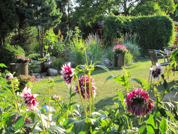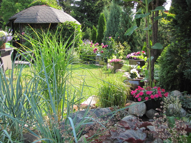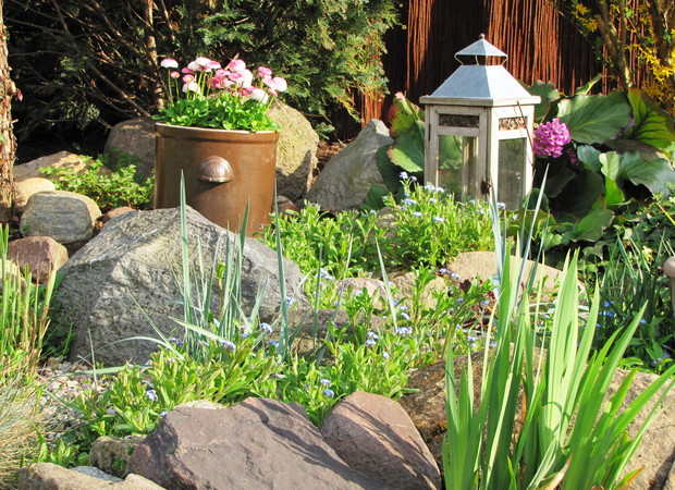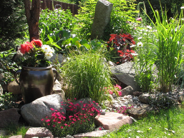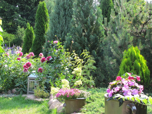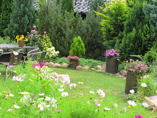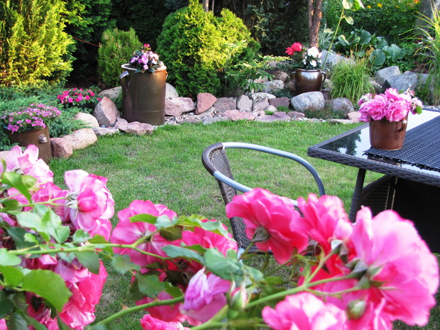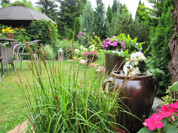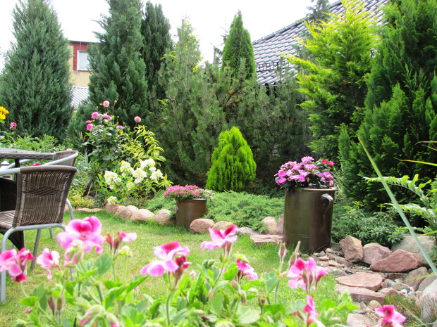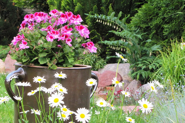 Kamionkowe garnki – praktyczne i eleganckie w ogrodzie. Donice i osłonki to nieodłączny element dekoracyjny niemal w każdym ogrodzie,. Wybór tych ogrodowych gadżetów jest na rynku olbrzymi. Od plastikowych poprzez ceramiczne do drucianych. Ja jednak tradycyjnym sklepowym donicom zdecydowanie mówię NIE. Stawiam na donice i osłonki bardziej wyszukane. W jednym w moich zakątków postawiłam na kamionkowe gary i dzbany. Zaczęło się od jednej sztuki znalezionej w babcinej piwnicy i to dało początek moim zainteresowaniom tymi przedmiotami. Chociaż zdobycie kolejnych zajęło mi kilka sezonów poszukiwań i wymagało niemało funduszy, to uważam, że warte były poszukiwań i wydatków. W moim różowym zakątku na tle zimozielonych iglaków pięknie się prezentują z jednorocznymi kwiatami w biało- różowych odcieniach tj. pelargonie, begonie, stokrotki. Zdecydowanie lepiej prezentują się, gdy tworzą małą kolekcję. Są solidne i łatwe do utrzymania w czystości.