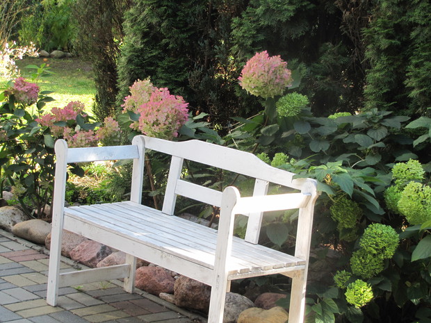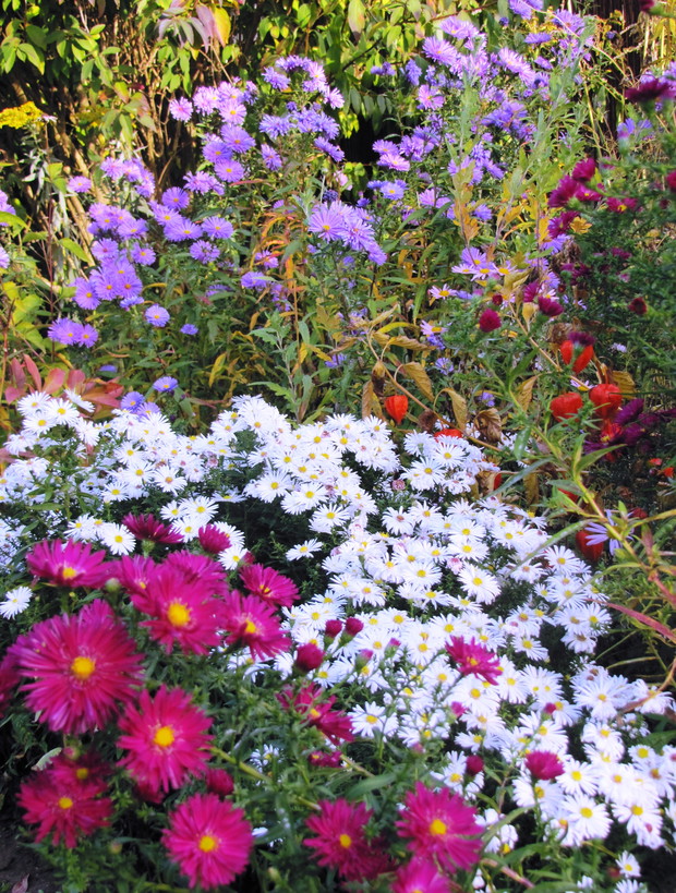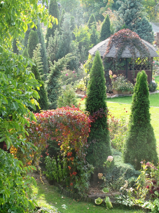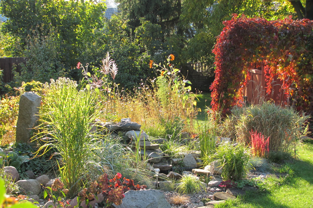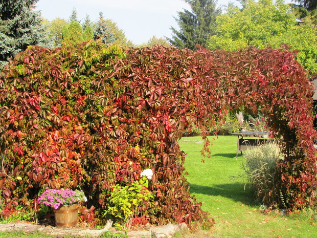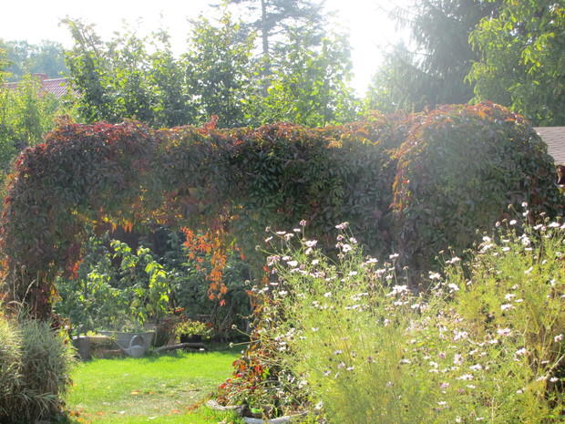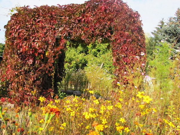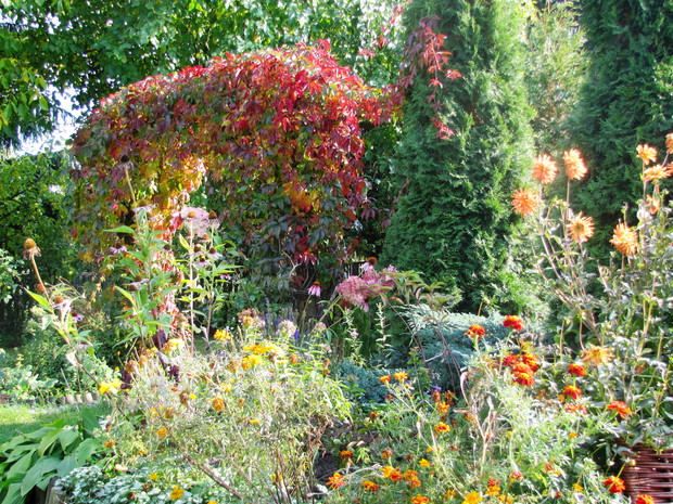 Październik w ogrodzie to pełnia jesieni, u mnie zdecydowanie dominuje kolor purpury,to za sprawą winobluszczu pięciolistnego (dzikie wino), które zresztą uwielbiam. Kwitną też marcinki w czterech kolorach, niezawodne bursztynowe aksamitki i różowieją hortensje bukietowe. Niektóre kwiaty i byliny powtarzają kwitnienie min. lwia paszcza, floksy, ostróżki i kosmosy. Nad oczkiem wodnym i przy skalniaku szeleszczą trawy. Dojrzewają owoce ( pigwa, jabłka, gruszki, winogrono) i spadają orzechy.