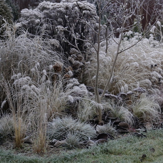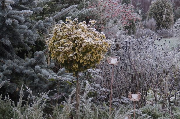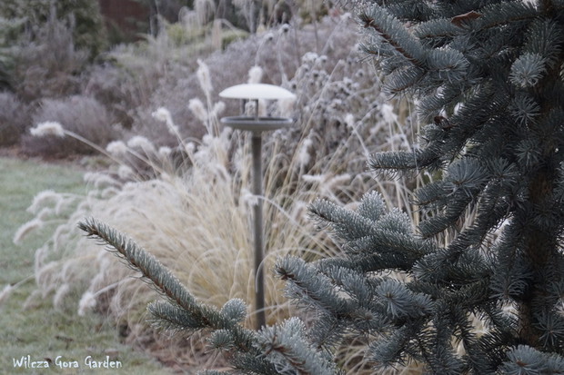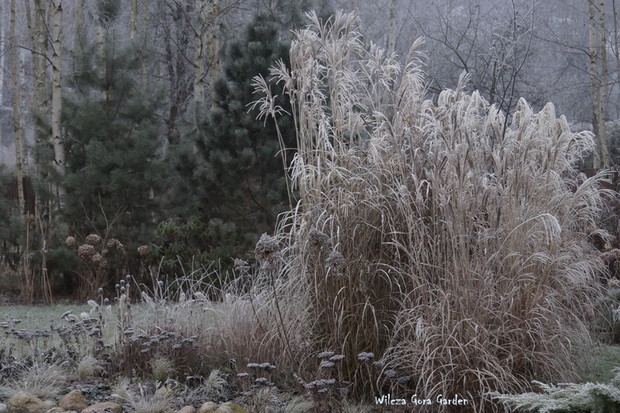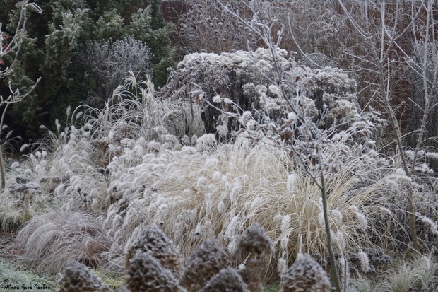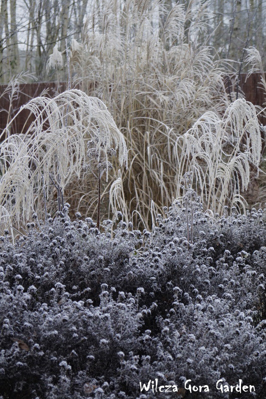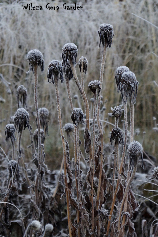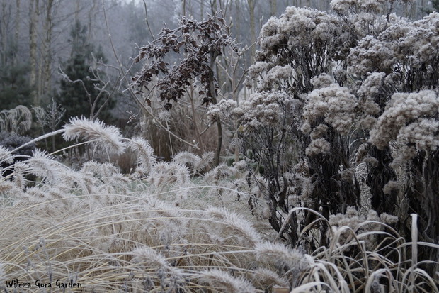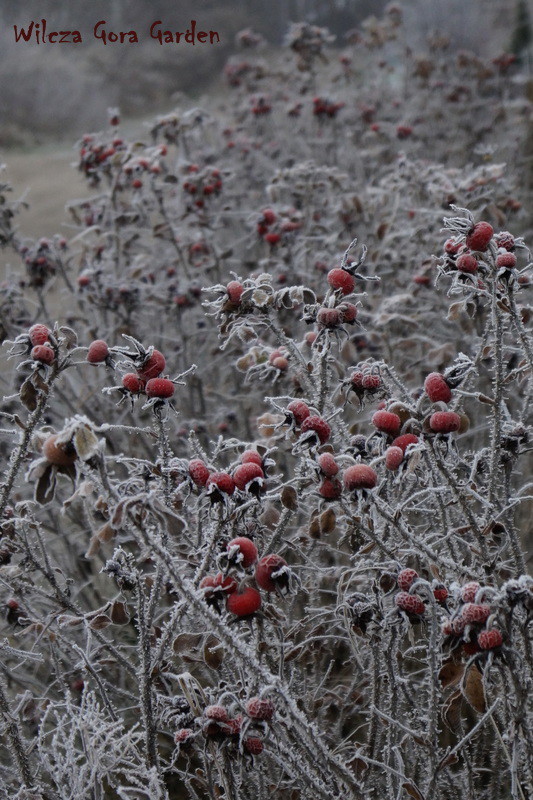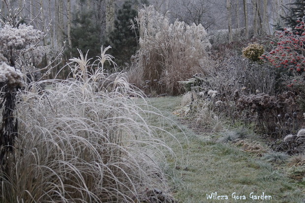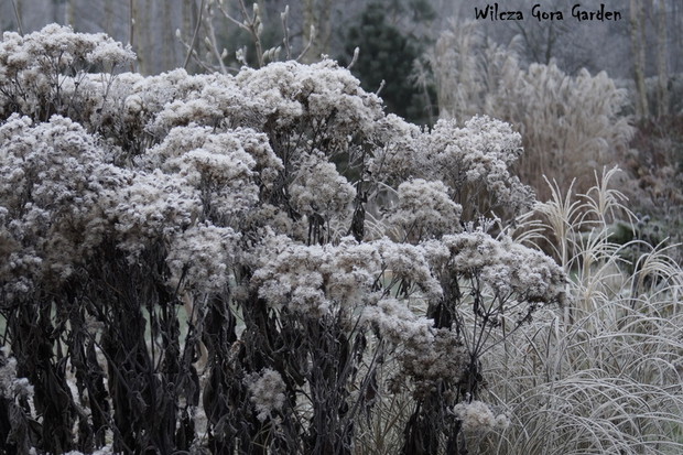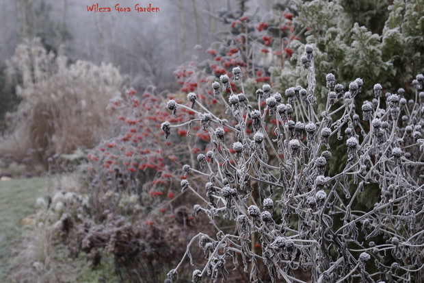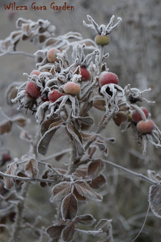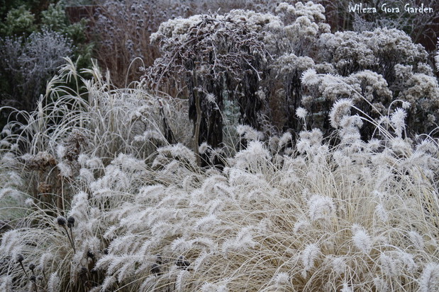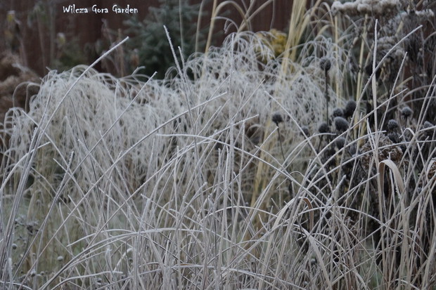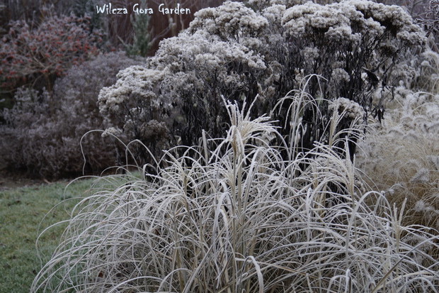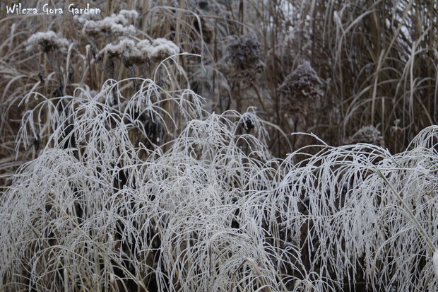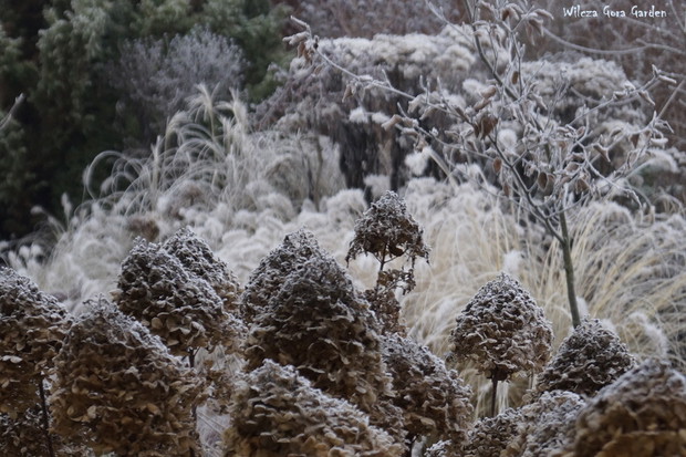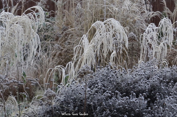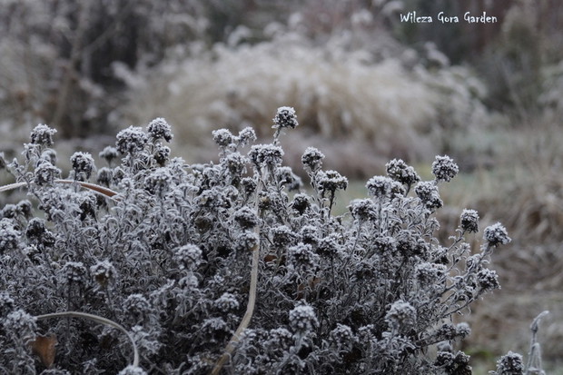Zima w tym roku ...bardzo jesienna...rozpieszcza wysokimi temperaturami i troszkę męczy ciągłą zmiennością aury. Deszcze pomogą nawodnić zimozielone rośliny przed zimą i dobrze zwilżą glebę. Dlatego bardzo się z nich cieszę. Tylko te szaro-bure kolory w ogrodzie nie pozwalały się nim nacieszyć. Kiedy jednak nadszedł pierwszy pierwszy przymrozek...natychmiast wybiegłam z aparatem do ogrodu...udało się zatrzymać piękno tej porannej chwili...zapraszam na pierwszy w tym sezonie, zimowy spacer po naszym ogrodzie...