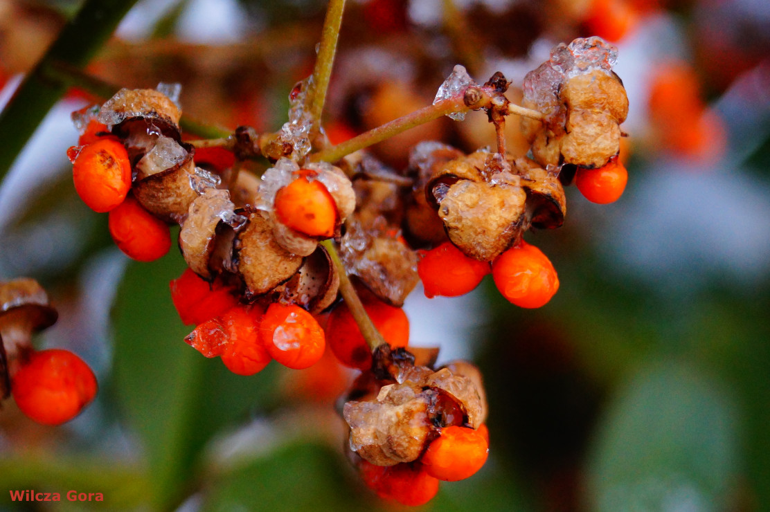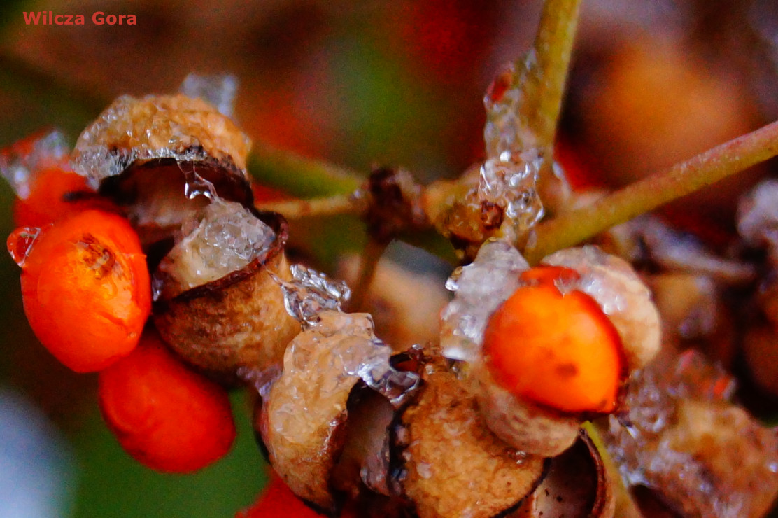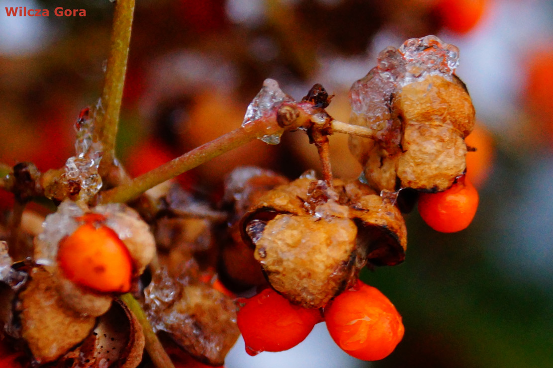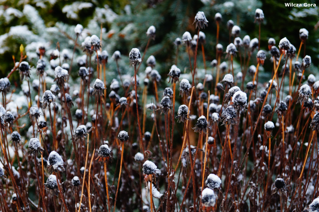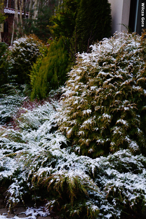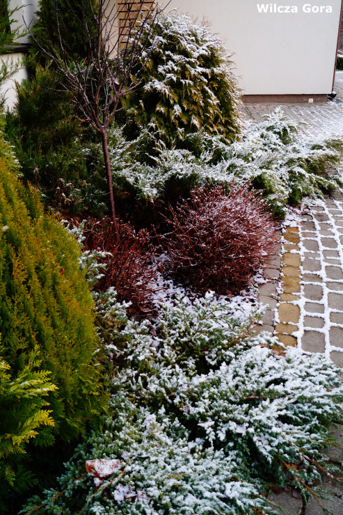 6 grudnia Mikołaj oprószył nasz ogród cienką warstwą śniegu. Ciężko jeszcze było mówić o zimowym krajobrazie, ale taka lekka, cienka biała kołderka ładnie ozdobiła nasze rośliny. Mróz zamroził krople nocnego deszczu i na pomarańczowych owocach trzmieliny można było zobaczyć tego efekty. Wiał chłodny i dość silny wiatr, który nie tylko mroził krople ale i zdmuchiwał śnieg. Cieszę się , że zdążyłam zatrzymać w obiektywie ten dzień. Kilka dni później, w ogrodzie było już zupełnie inaczej....ale to już w kolejnej galerii "WILCZA GÓRA POD ŚNIEGIEM"