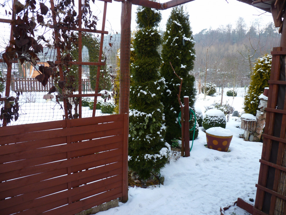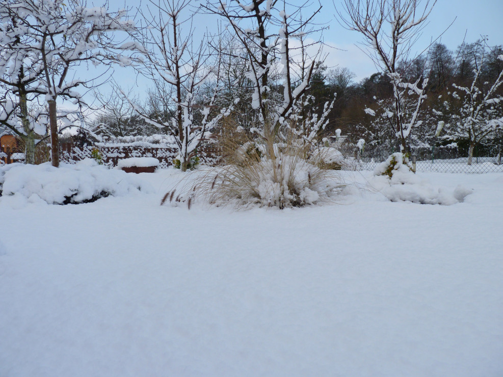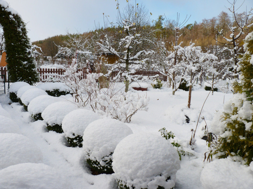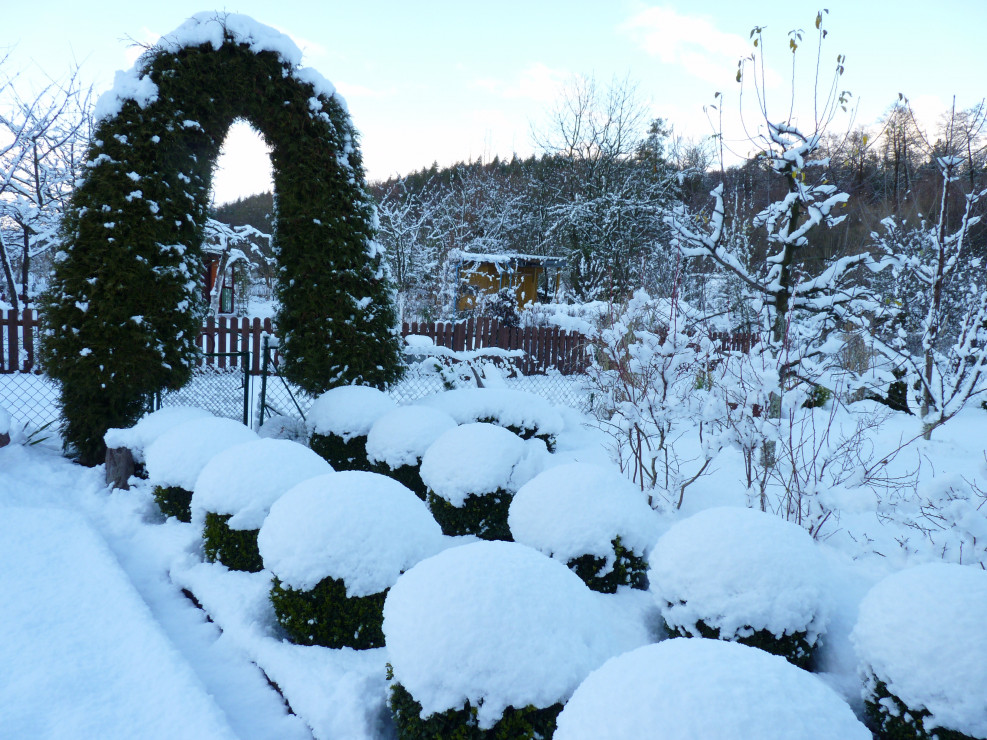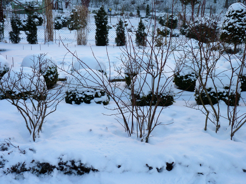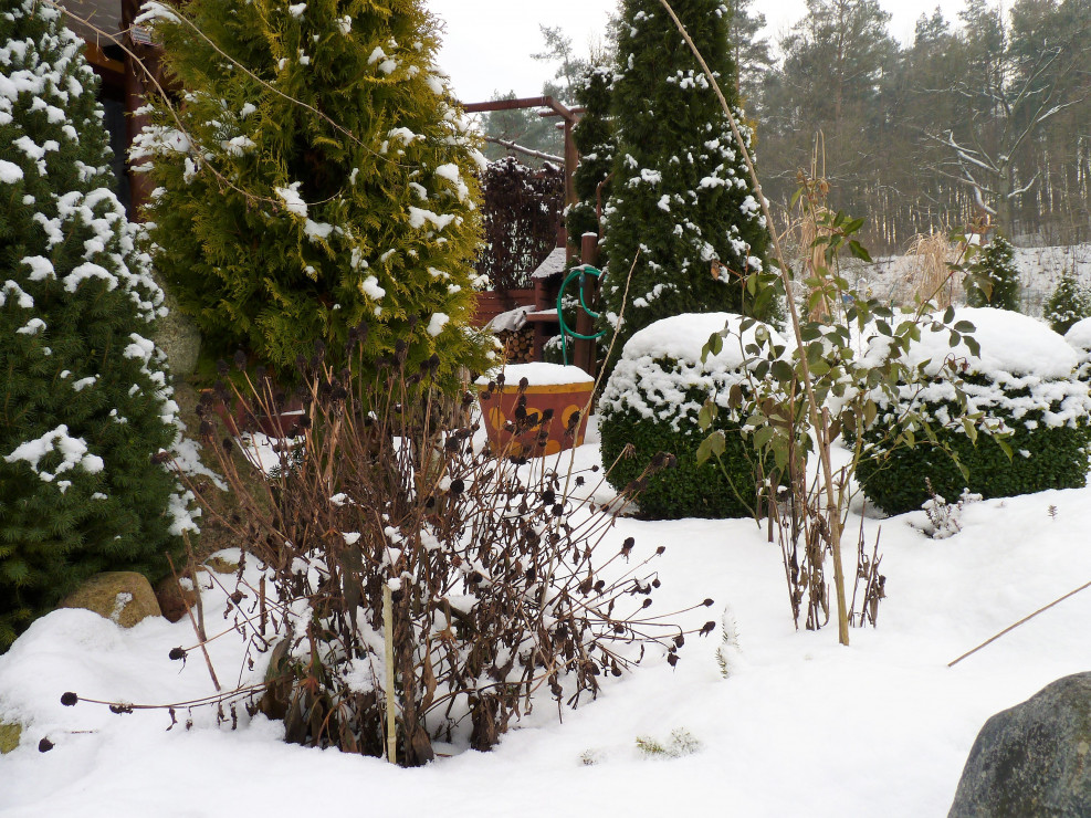 Można powiedzieć, że zimą ogród zapada jakby w zimowy sen. Wydawać by się mogło, że nic się w nim nie dzieje, a my ogrodnicy możemy spać spokojnie i cierpliwie czekać na wiosnę. Nic bardziej mylnego. Nawet jeżeli odpowiednio zabezpieczyliśmy nasze wrażliwsze okazy to i tak musimy kontrolować, czy nic złego się z nimi nie dzieje. Czy na przykład osłony zabezpieczające nie zostały zerwane przez silny, zimowy wiatr. Dla drzew owocowych zagrożeniem bywa też zimowe słońce, które nagrzewając pnie może spowodować pęknięcia kory. Gdyby tak się stało, to najlepiej jak najszybciej zabezpieczyć rany pastą ogrodniczą. Żeby tego uniknąć należy pamiętać o bieleniu drzew wapnem. Dla roślin niebezpieczny jest także śnieg. Zwłaszcza jak jest go dużo i jest mokry. Jeżeli w porę go nie strząśniemy może uszkodzić delikatne gałązki. Ale z drugiej strony, to właśnie śnieg sprawia, że ogród pod tą białą kołderką wygląda bajecznie…… Pięknie prezentują się oprószone śniegiem iglaki, czy śnieżne czapy na bukszpanach. A zaschnięte trawy i kwiatostany wrzosów na tle białego puchu wyglądają bardzo malowniczo.