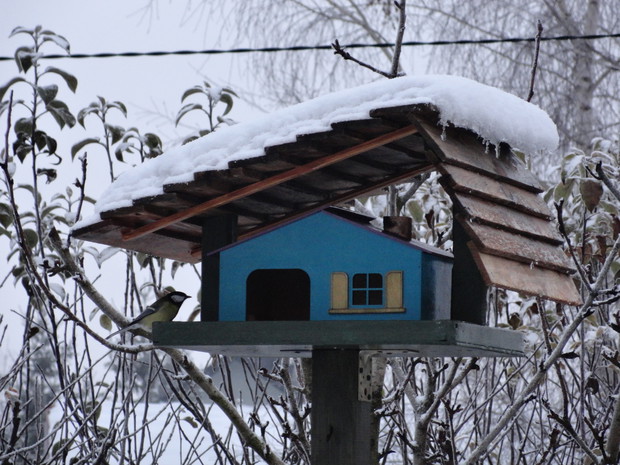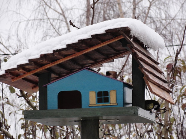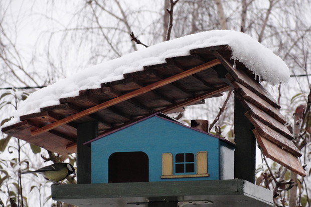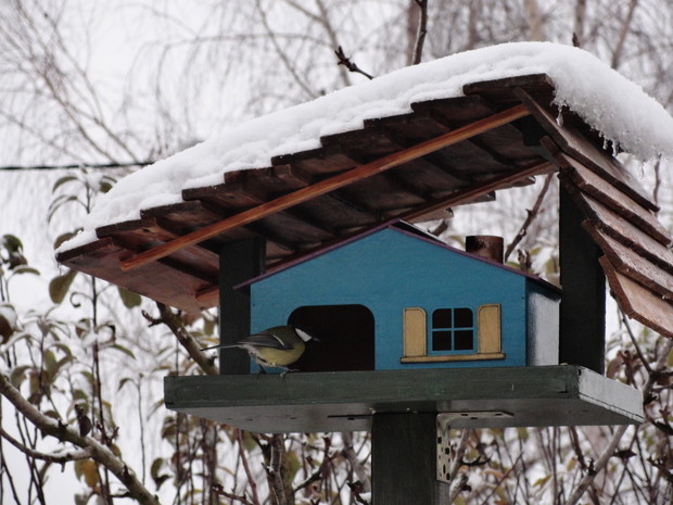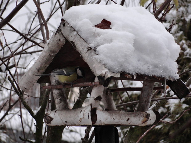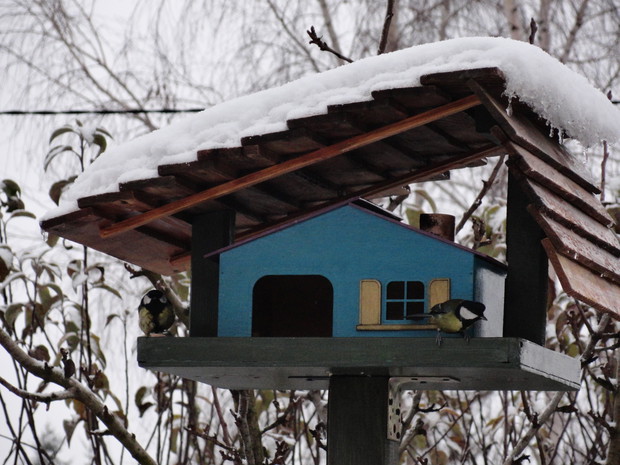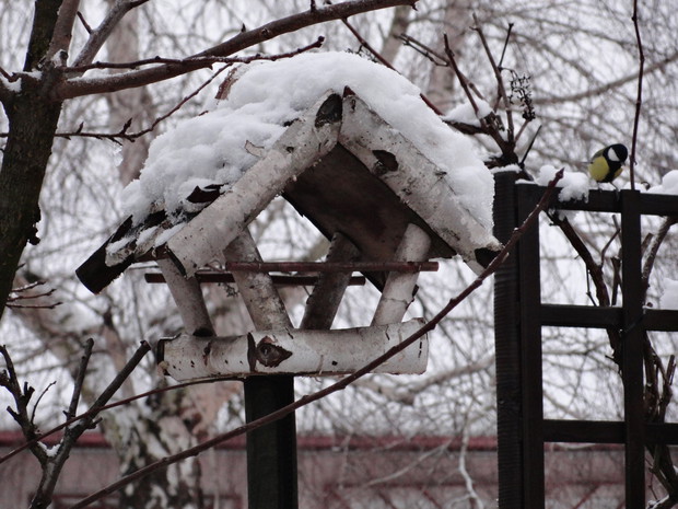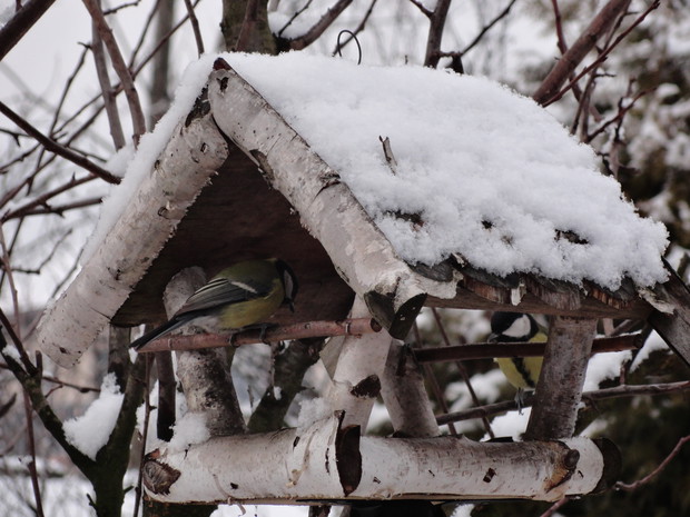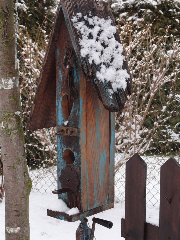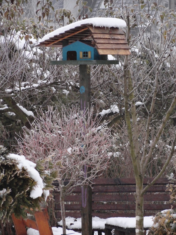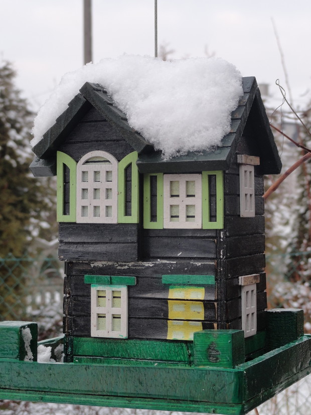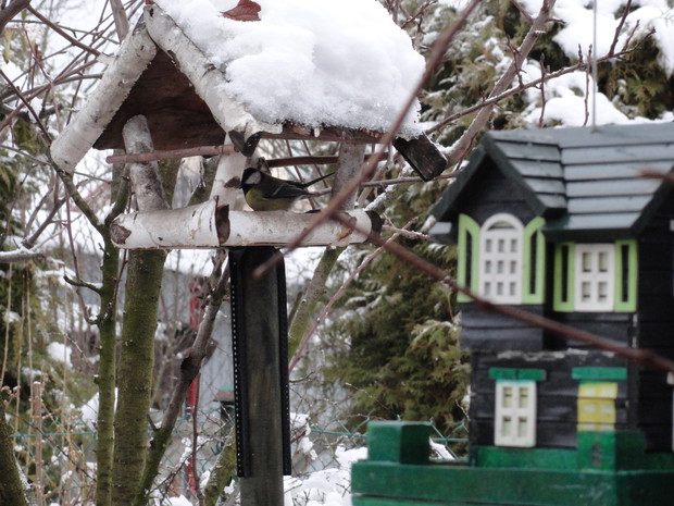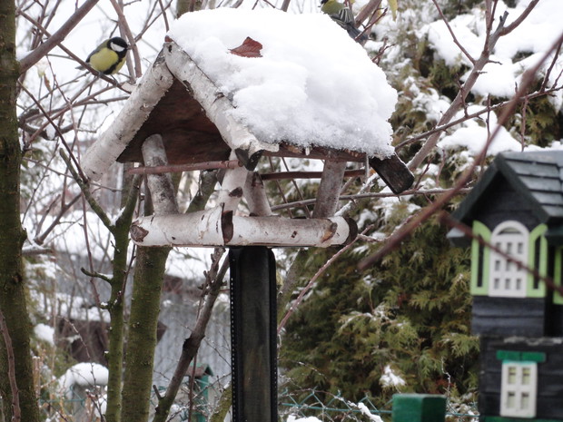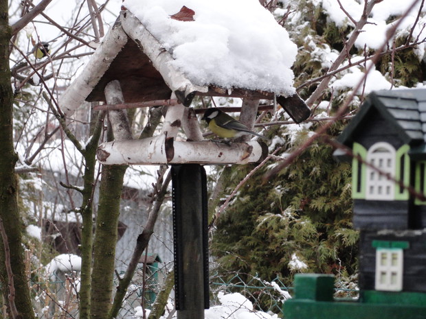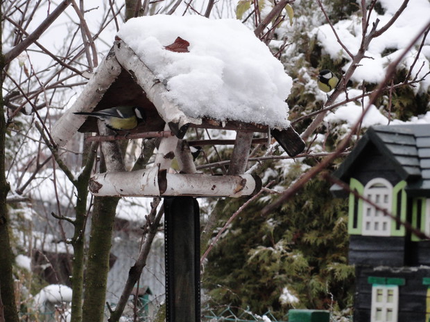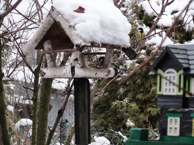 Zimą, ogród pod białym puchem wygląda niesamowicie... Kolorowe karmniki, domki dla ptaków pokryte białą pierzynką przyciągają skrzydlatych braci smakowitymi ziarnami... Bardzo lubię usiąść z kubkiem gorącej kawy i obserwować sikorki przylatujące na słonecznik... W tym samym czasie równie ciekawe historie tworzy nasze stadko kotów... One z kolei mają świetny punkt widokowy na dachu, obserwują stamtąd nadlatujące ptaki i wszystko dokoła... Młode kotki uwielbiają wspinaczki na drzewa i wspólne harce... Pomimo chłodu ogród zimowy ma wiele uroku, miło jest przychodzić tu i być witanym przez takich wiernych przyjaciół...