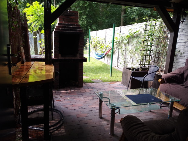 Zrobiony ogród jest wykonany własnoręcznie przeze mnie i mojego męża gdy to kupiliśmy wyglądało to nie zbyt ładnie. Z czasem było widać efekty pracy najpierw trzeba było przywieść ziemię żeby tam co kolwiek wyrosło posialismy trawe ścieżka z plastrów drzewa , zbudowana została altana, grill . Posadziliśmy winogrona, maliny, magnolia krzewy ozdobne. Mąż położył stare cegły na podłogę pod altanę. Zbudował donice . Blat z drzewa. Odnowiliśmy stare kanapy. Wejście do ogrodu jest zrobione z bluszczu który tworzy tunel. Przed posialismy trawe.