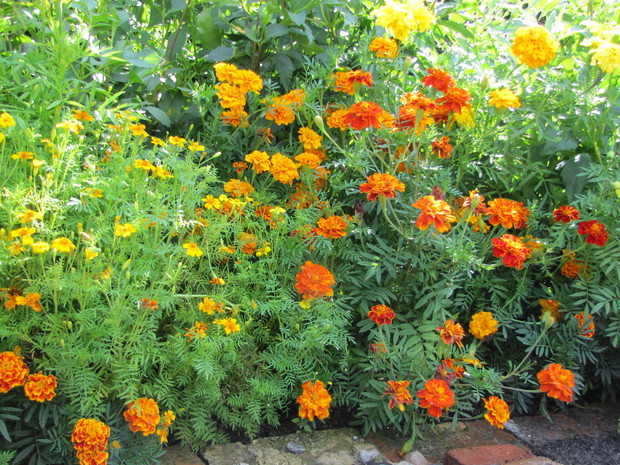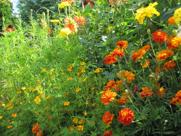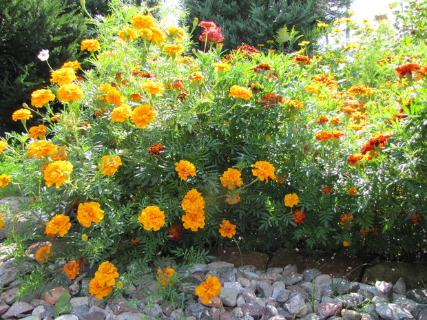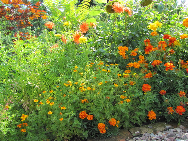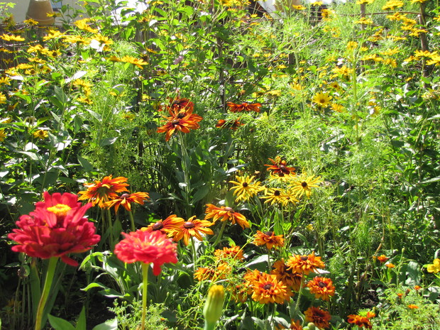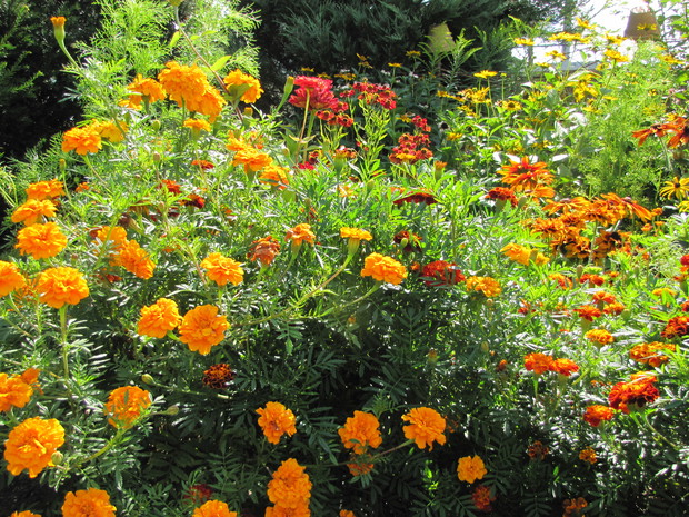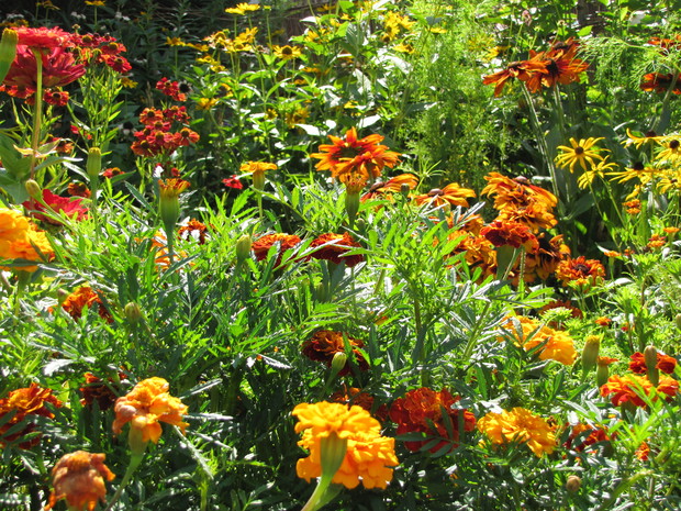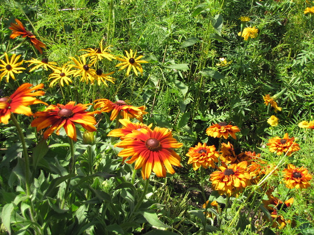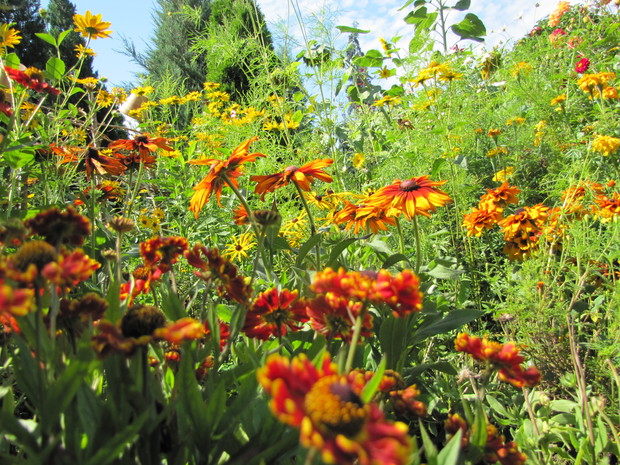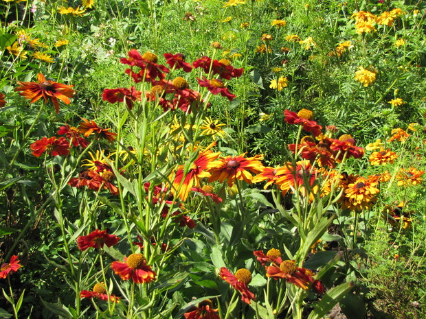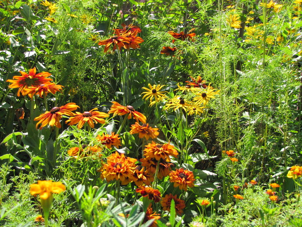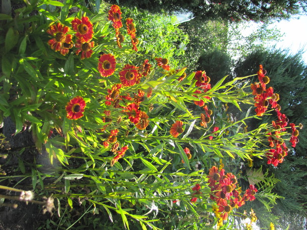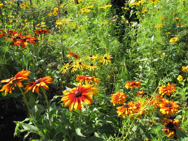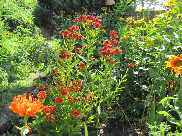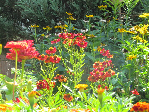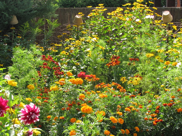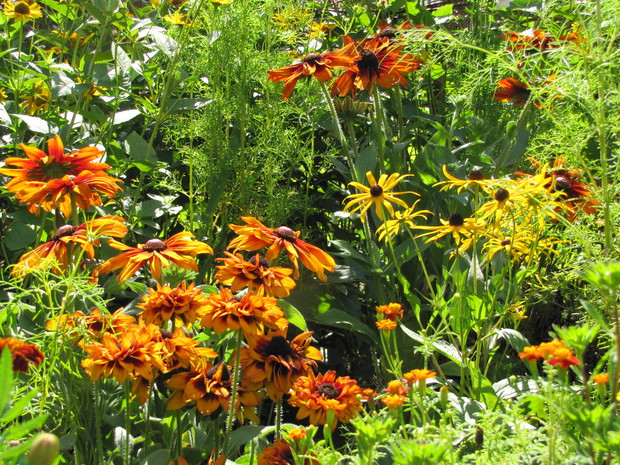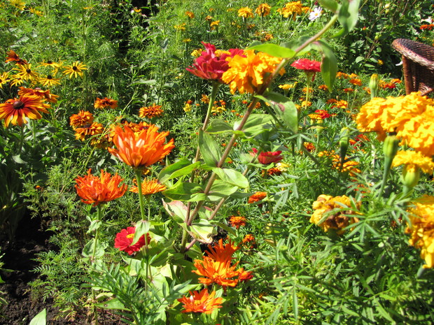 Rabata w kolorze bursztynu. Kilka lat prób i błędów w doborze kwiatów, aby skomponować rabatę w ciepłych bursztynowych kolorach. Powoli się udaje. Tutaj dominują odcienie czerwieni, brązu,pomarańczy i żółci. Zatem nie mogło zabraknąć dzielżanów żółtych i czerwonych, rudbekii, aksamitek w różnych odmianach, , słoneczniczków szorstkich, słoneczników, cynii, nawłoci, krwawnika i dalii.