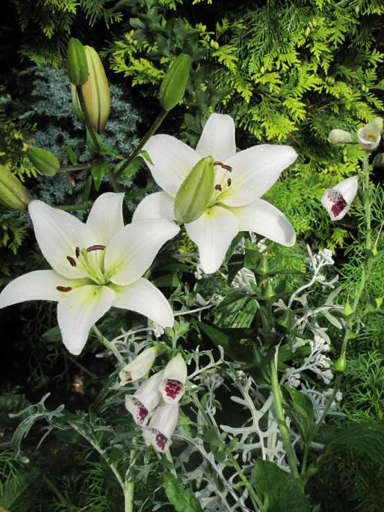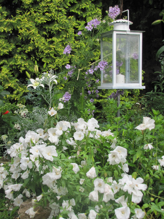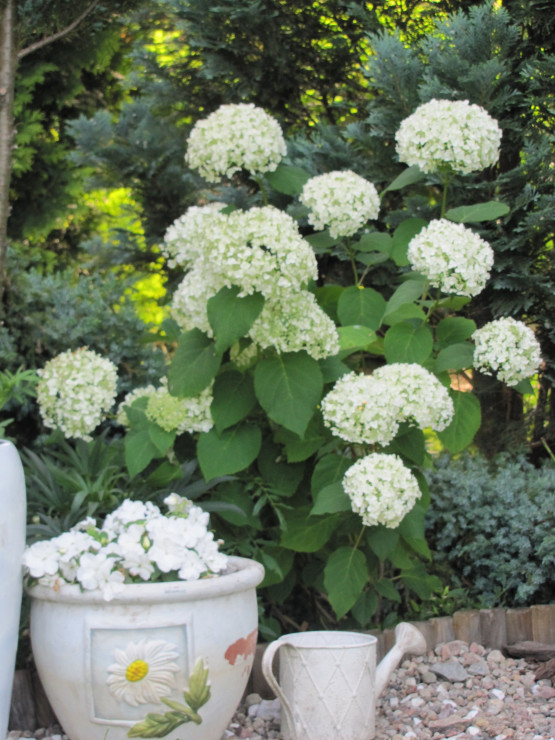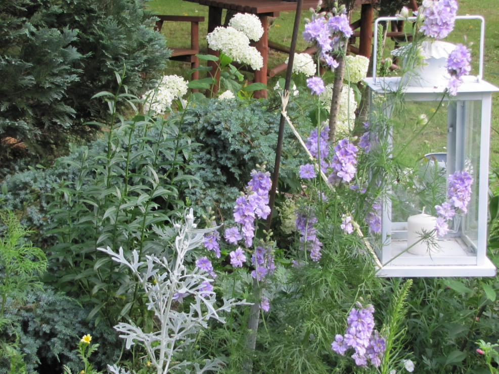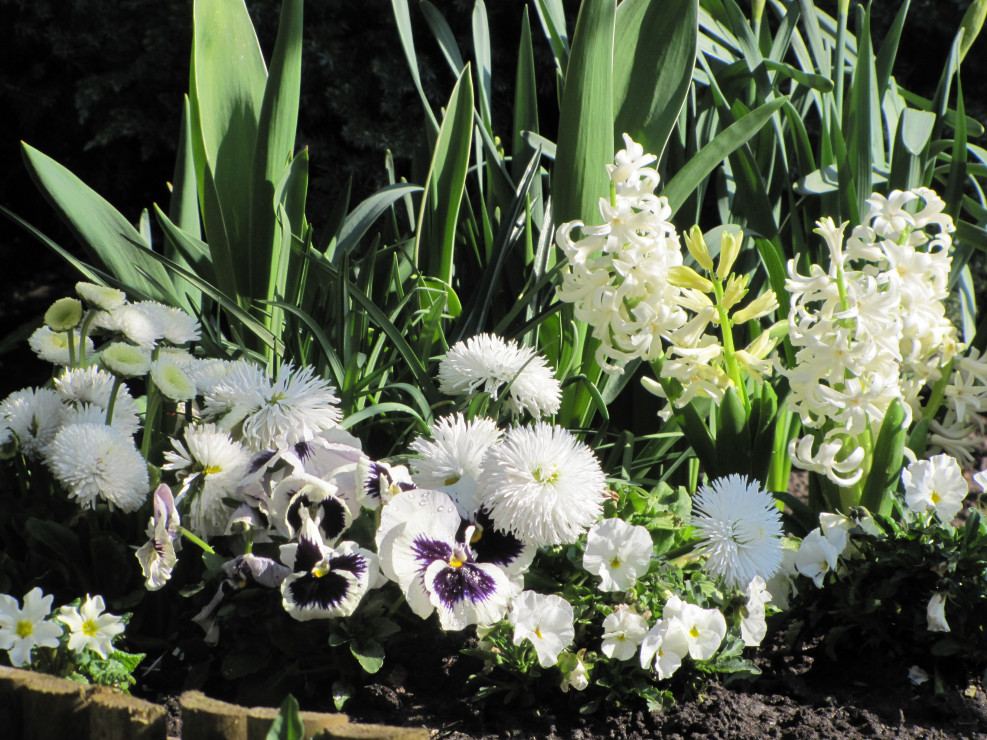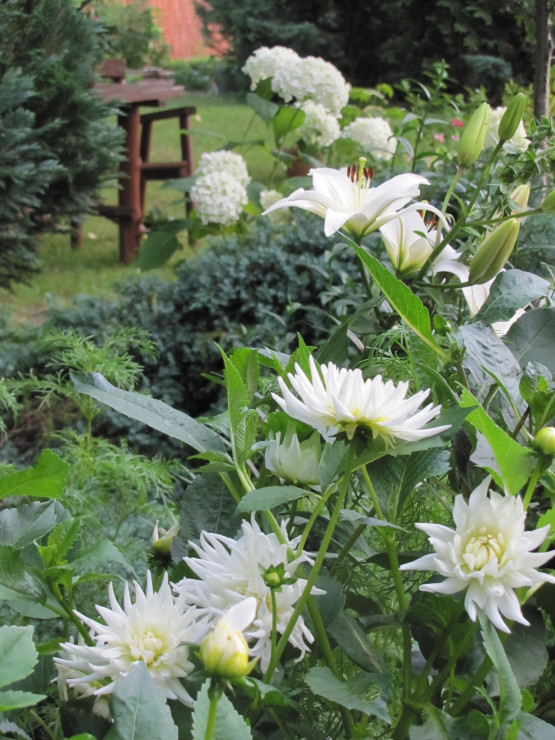 Na jednej z moich rabat przeważają kwiaty w kolorze białym. Rozkwitają od wczesnej wiosny: przebiśniegi, ciemierniki, stokrotki, narcyzy,hiacynty, tulipany, bratki, niezapominajki, starzec popielaty, margaretki, lewkonie, pięciornik, godecje, naparstnice, ostróżki, lilie, dalie, niecierpki, hortensja Anabell i czekam na kolejne...