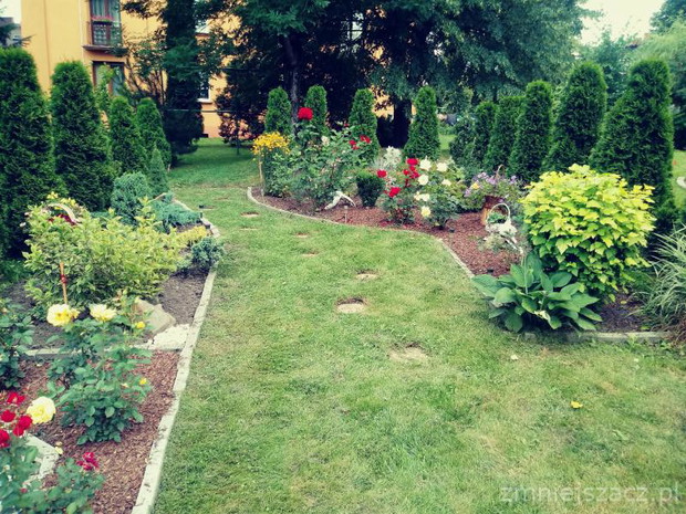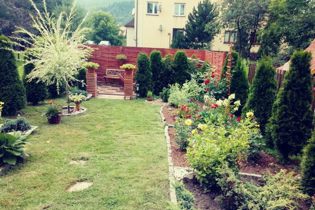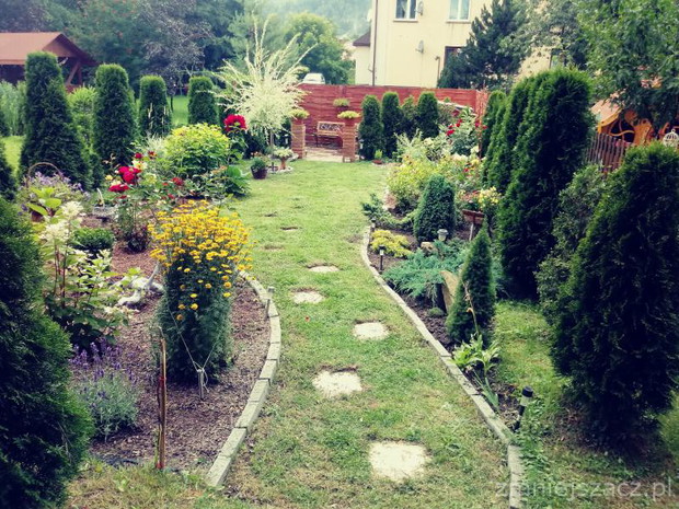 Ogród znajduje się na powierzchni ok. 1 ara. Granice wydzielają rzędy tui ( głównie Szmaragdy ) oraz własnoręcznie zrobiona pergola. Na pierwszym planie, po prawej stronie rosną krzewy iglaste a po drugiej stronie kwiaty i krzewy zielone kwitnące oraz skalniak. W tle za, za murkami znajduje się kącik typowo wypoczynkowy. Na drewnianym podeście stoi stół z krzesłami, ławeczka oraz huśtawka. Całość ozdabiają rośliny pnące, doniczkowe i wiszące. Wieczorem nastroju dodają lampki solarne. Dużą atrakcją ogrodu jest to, że większość donic i skrzynek na kwiaty jest wykonana własnoręcznie. Nie brakuje tu korzeni przyniesionych z lasu oraz kolorowych kamieni i skałek. Dróżki wykończone są kostką brukową.