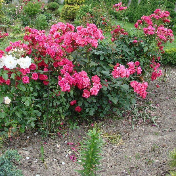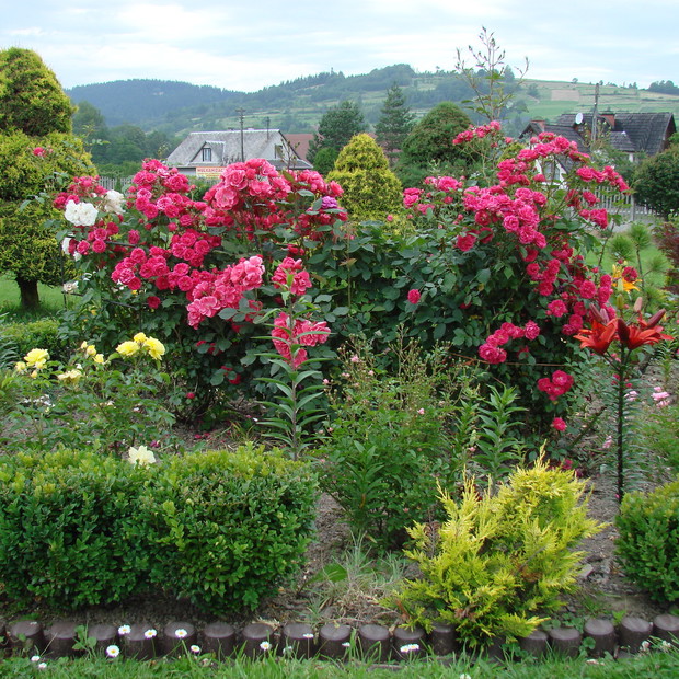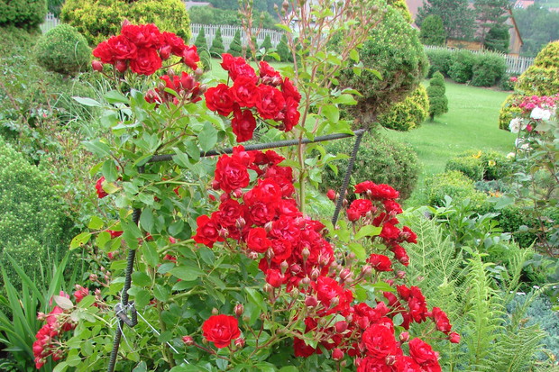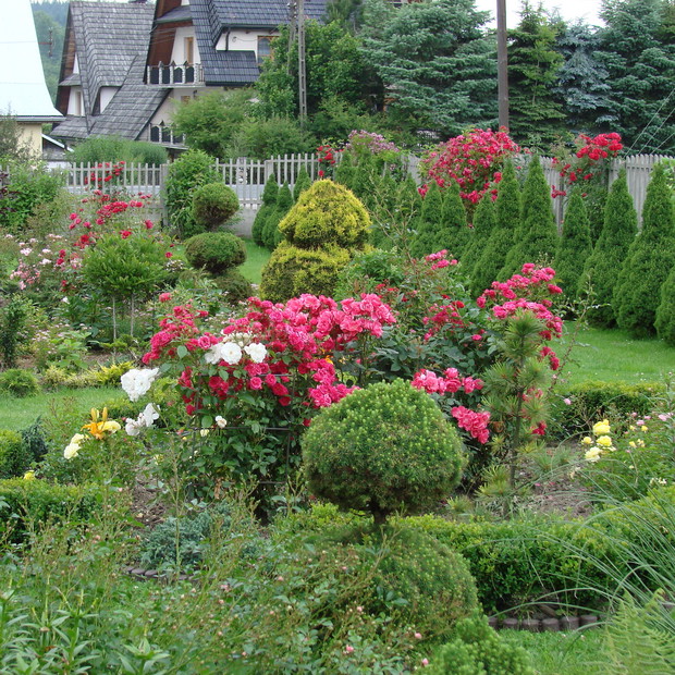 Mój ogród przydomowy to ok. 40 arów powierzchni. Znajdują się w nim różne gatunki drzew owocowych i ozdobnych jak magnolia oraz krzewy takie jak: migdałowiec, milan amerykański, glicea, hortensje bukietowe, budleja, pigwowiec, krzewuszki i wiele rodzajów iglaków jak sosna, jodła kalifornijska czy świerk biały i żywotnik zachodni. Niewątpliwie ważne miejsce w moim ogrodzie poza powojnikami takimi jak klemantisy zajmują róże, które zachwycają swoją barwą i zapachem. Na rabatach w moim ogrodzie rośnie kilka gatunków róż, począwszy od pnących poprzez parkowe i rabatowe, które przyciągają nie tylko ludzkie oko, ale i przepiękne gatunki motyli. Róże są jednak bardzo delikatnymi kwiatami, dlatego wymagają starannej pielęgnacji, gdyż wrażliwe są na przymrozki oraz ataki mszyc. Szczególnie róże angielskie zachwycają swoim zapachem i trudno przejść obok nich obojętnie. W ogrodzie jest też miejsce na jeżyny, maliny, porzeczki, agrest i borówkę amerykańską.
