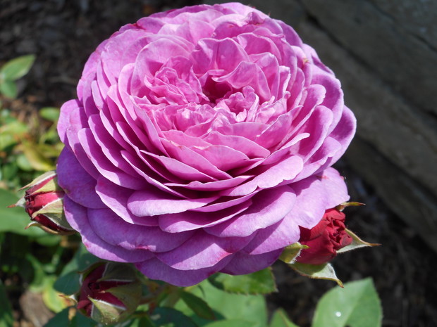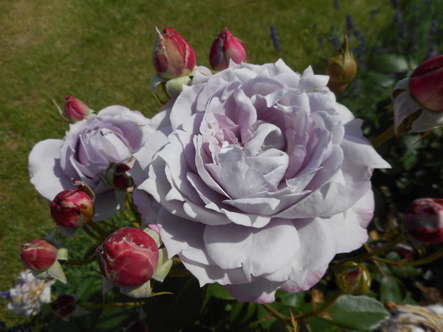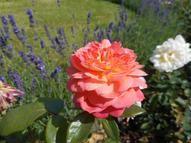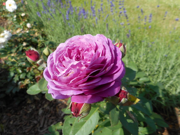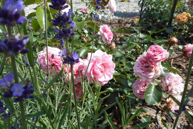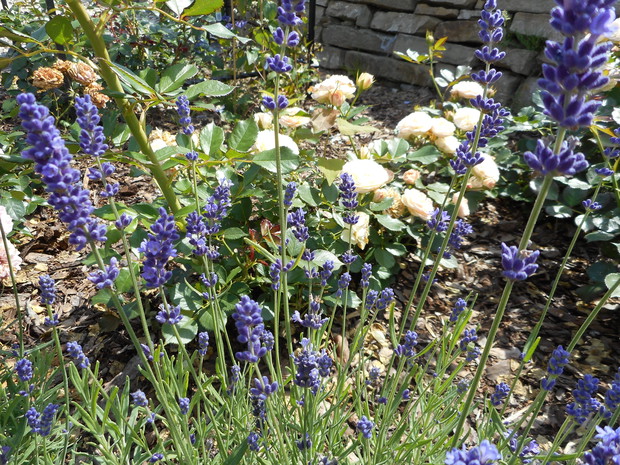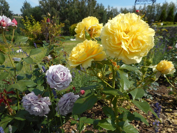 Rabata różana - powstała wiosną tego roku, krzaczki są jeszcze małe ale rekompensują to obfitym kwitnieniem i zapachem, znajduje się tutaj kilka odmian róż angielskich i wielokwiatowych. Na obrzeżach posadziłam lawendę w jednej odmianie. Na końcu rabaty znajduje się pergola w której jest posadzona odmiana róży piennej oraz powojnik.