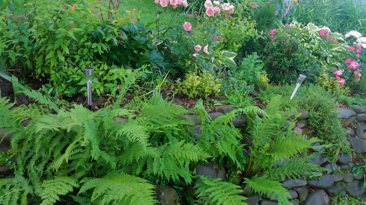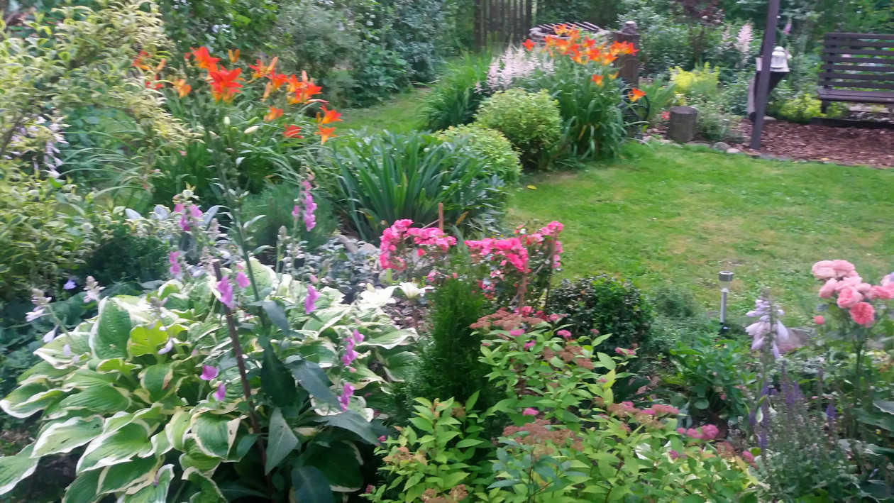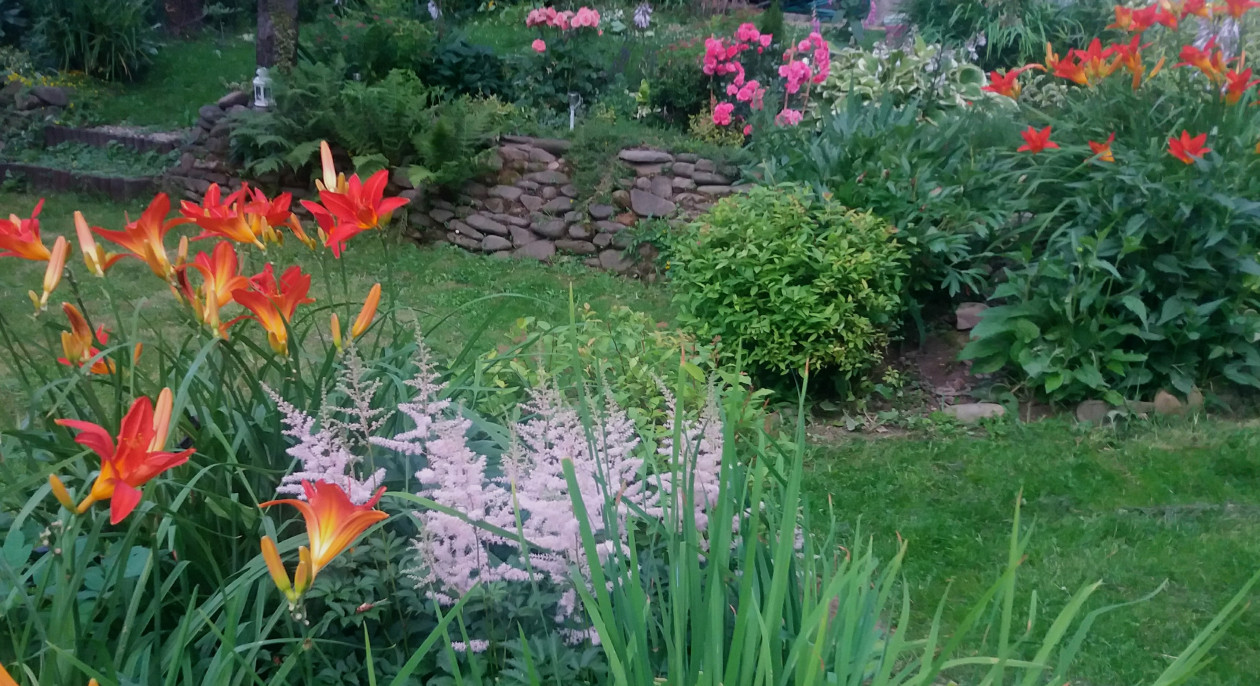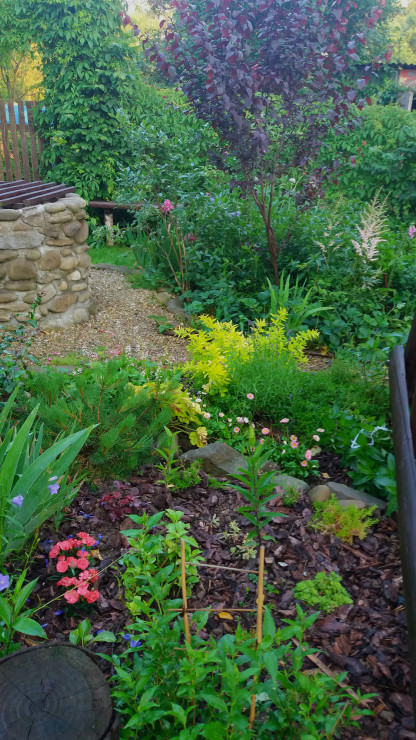 Mój ogród zmienia się ciągle od dziesięciu lat i końca nie widać , a to liliowce rosną nie tam gdzie trzeba , a to znowu różę zarosły zioła tzn.macierzanka i szałwia . Naparstnica , mam nadzieję, że się wysieje i powstaną nowe sadzonki.Przed domem mam na skarpie skalniak i robimy w nim kamienne schodki .Kamienna studnia na deszczówkę sprawdza się znakomicie , jest czym podlewać rośliny. W tym roku wsadziłam sadzonki iglaków , sosny , świerka , jodły .Na razie ich bardzo nie widać , ale jak podrosną , będzie pięknie. W ogródku nie zabrakło także ziół .Miętę i melisę ususzyłam ,ale najlepiej jednak smakują świeżo ścięte zioła na zadaszonym tarasie lub na ogrodowej huśtawce. Wieczorami zaś można miło spędzić czas przy grillu .