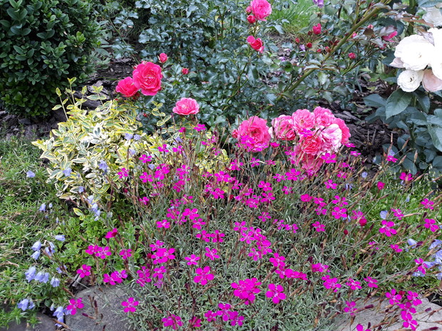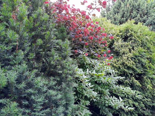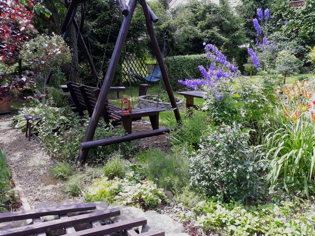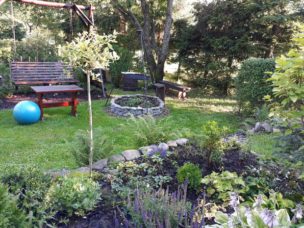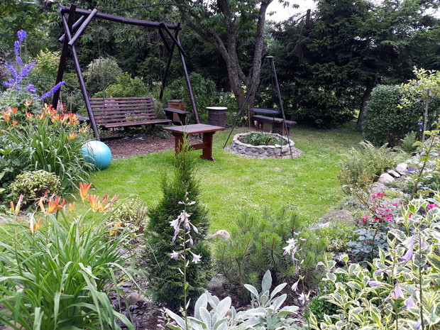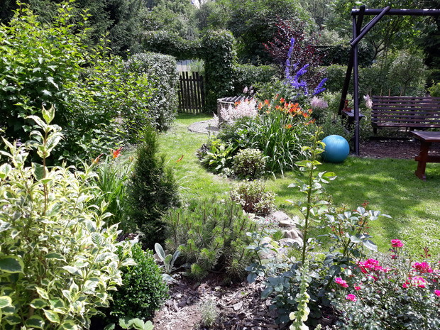 Mój ogród ciągle się zmienia ..Można porównać moje wszystkie galerie.Nie zmieniają się tylko stałe budowle jak studnia na deszczówkę, kamienny krąg pod grillem czy kuty grill. Mam jedynie zamiar poprawić murek oporowy ,na którym rosną byliny , róże i małe krzewy .Ciągle coś dosadzam .Mam już pokażną gamę roślin takich jak iglaki , krzewy liściaste i byliny. Ostatnio udało mi się ukorzenić pęcherznicę diabolo. Mam jeszcze pęcherznice zielonych liściach , krzewuszki , żylistek wysmukły , azalię , rododendron , róże rabatowe , pnące i płożące i wiele innych krzewów .Iglaste to przede wszystkim kosodrzewiny , świerki , jodły , tuje .Bylin nie będę wymieniać bo ich jest mnóstwo. Ostatnio przesadzałam poziomki , które się szybko krzewią . Janina
