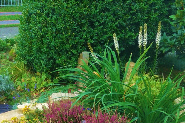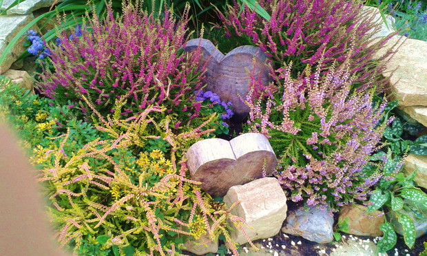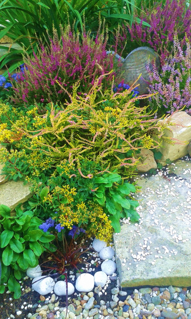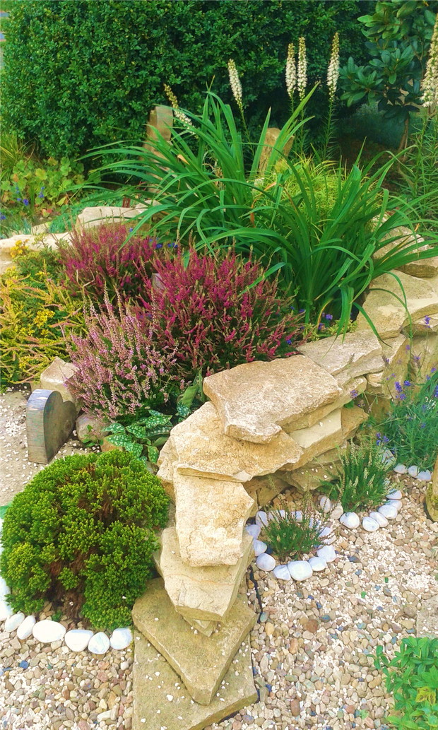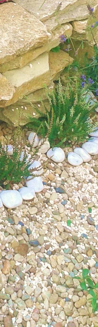 Chciałam Państwu pokazać efekt swojej pracy. Stworzenie tego skalniaka w pełni obsadzonego zajęło prawie 2 sezony, ale dla końcowych wrażeń uważam, że było warto. Teraz skalniak cieszy moje oczy i serce. Wcześniej w tym miejscu znajdował się ogromny bukszpan. Budowę zaczęłam od ułożenia kamieni w kształt otwartej studni, po nasypaniu ziemi zaczęło się nasadzanie roślin. Są to głównie wrzosy i liliowce oraz ozdobne trawy. Wczesną wiosną na skalniaku i wokół pojawiają się tulipany, szafirki i żonkile. Z czasem otoczenie skalniaka też zaczęło się zmieniać. Nasadzone zostały lawendy, które przyciągają owady i przede wszystkim pięknie pachną. Jesienią oprócz wrzosów uwagę przyciągną kolorowe ozdobne trawy. Dla kontrastu wokół skalniaka wysypano jaśniejsze kamienie i grys. Rośliny udekorowane zostały śnieżno-białymi otoczakami. Mam nadzieję, że mój projekt spodoba się też innym.