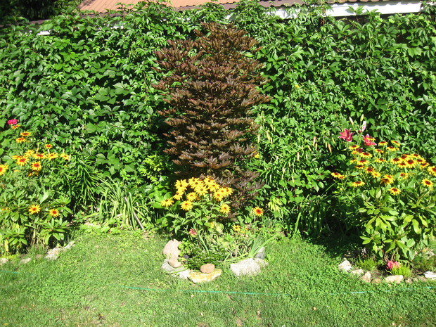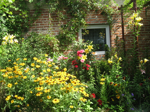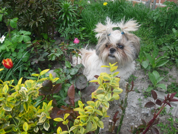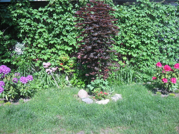 Przesyłam kawałek mojego raju na Ziemi-mój ogródek,w którym rosną kwitnące drzewa ,krzewy i byliny oraz COLA :),która wiernie dotrzymuje mi towarzystwa w codziennych pracach w ogrodzie-kiedy to ja pielę i pielęgnuję a ona się potem wyleguje ...w tych już ładniutkich wyplewionych roślinkach,które póżniej muszę reanimować-by wyglądały w miarę efektownie .Bardzo lubię prace w ogródku.Nie raz mimo zmęczenia i bólów pleców po skończonej pracy siadam z filiżanką kawy na tarasie i patrzę na wtedy czuję się zrelaksowana i odprężona ...kiedy spoglądam na kwitnące krzewy i kwiaty oraz czuję ich zapach,szczególnie róż i piwonii-mają bardzo intensywny a latem floksy i lilie o sobie przypominają a do jesieni cynie i astry spać nie dają:) .Dla takich chwil warto się poświęcać,by póżniej korzystać z uroku ogrodu i móc cieszyć oczy widokiem kwitnących drzew,krzewów i kwiatów nawet za oknem.Ogród daje mi dużo satysfakcji i jest wciągającym hobby,uczy przede wszystkim cierpliwości zbierając własne nasionka-długo nie raz czekając na końcowy efekt lub dzieląc byliny i też czekając by się rozrosły.Daje dużo radości i satysfakcji po skończonej pracy-bo wtedy pozwala nam poczuć się projektantem a zarazem wykonawcą i pozwala prowadzić zdrowy tryb życia.Dzięki mojemu ogródkowi mam codziennie świeże kwiaty w wazonach a domu piękne zapachy witające gości już od progu,co jest dużą korzyścią dla wszystkich :) .Polecam wszystkim Tę PASJĘ OGRODOWĄ-to bardzo przyjemny sposób na spędzanie wolnego czasu wśród pachnących roślin na świeżym powietrzu i ulubionym psem oraz kotem tarzającym się w kocimiętce,a przede wszystkim po skończonej pracy-błogi relaks z rodzinką i dziećmi w pachnącym ogrodzie.