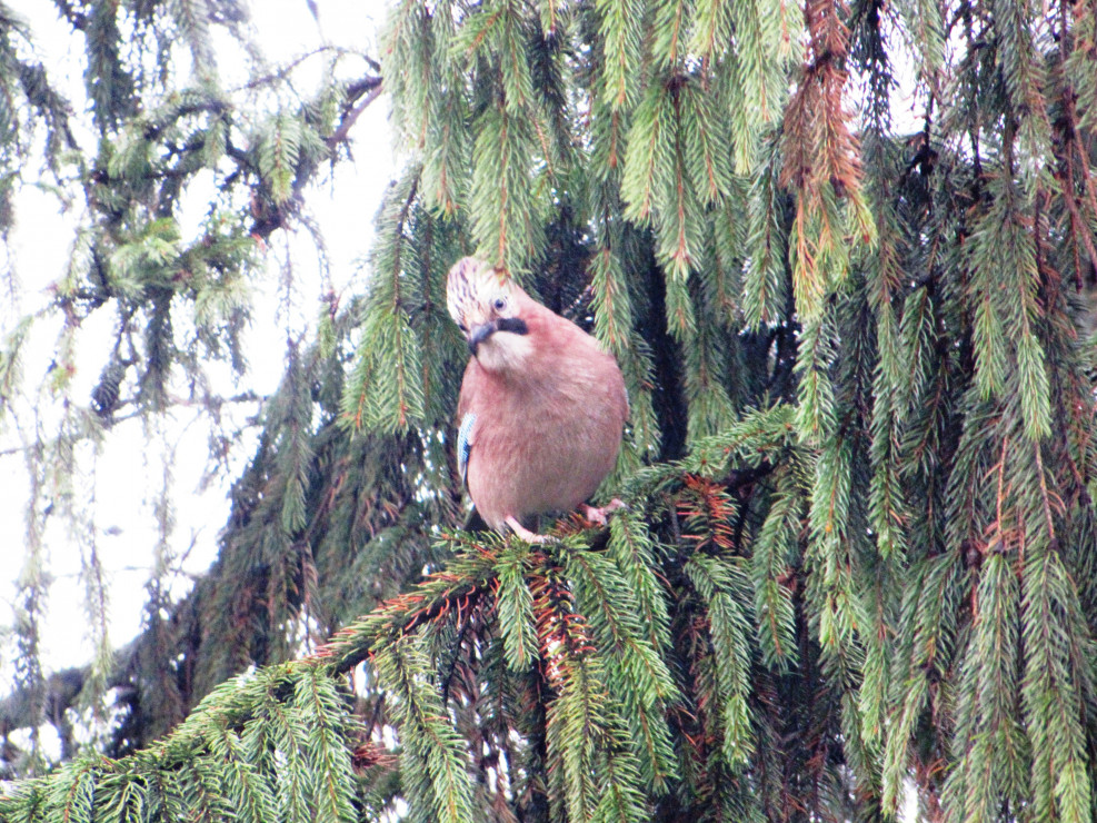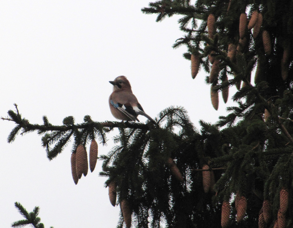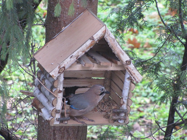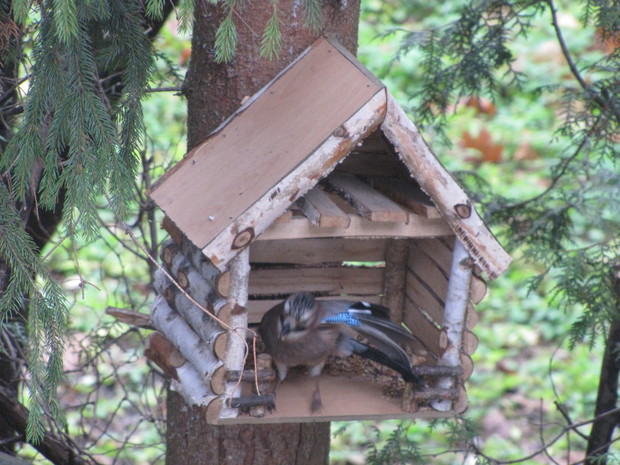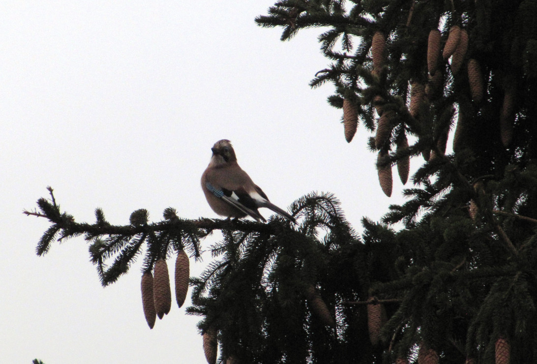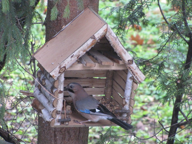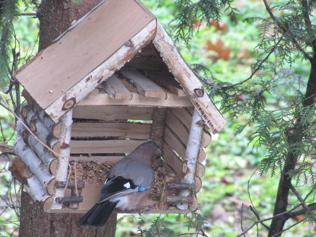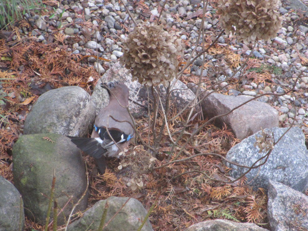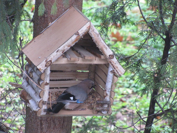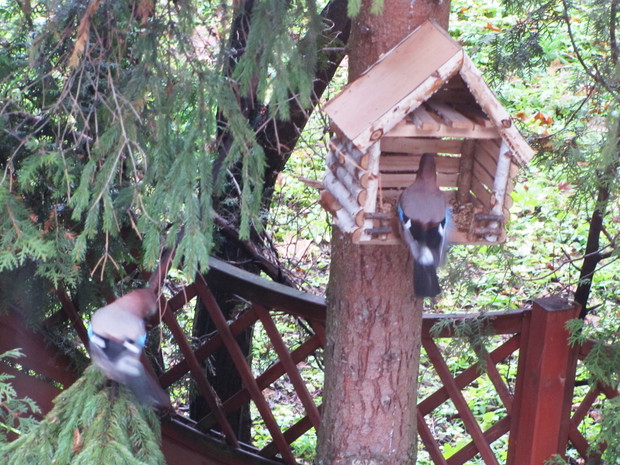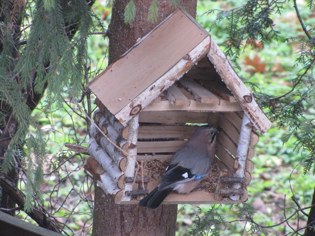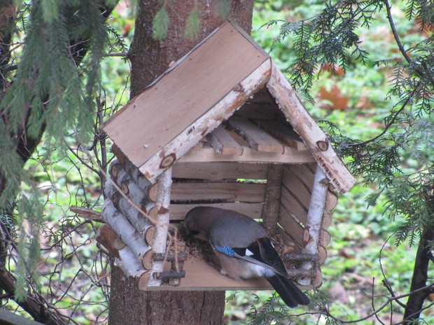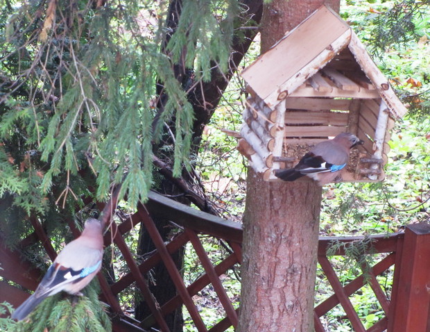 Sójki w naszym ogrodzie. Sójki na dobre zadomowiły się w naszym ogrodzie. "Posprzątały" opadłe orzechy i te które pozostały na drzewie. Zabrały się za szyszki. A teraz regularnie odwiedzają karmnik i nie dopuszczają do niego innych ptaków.