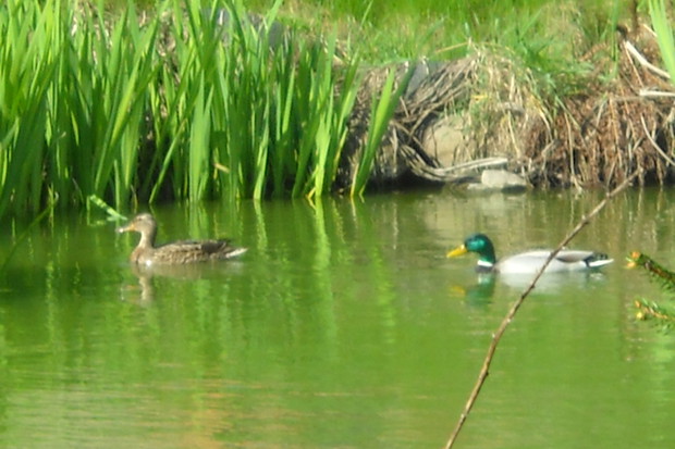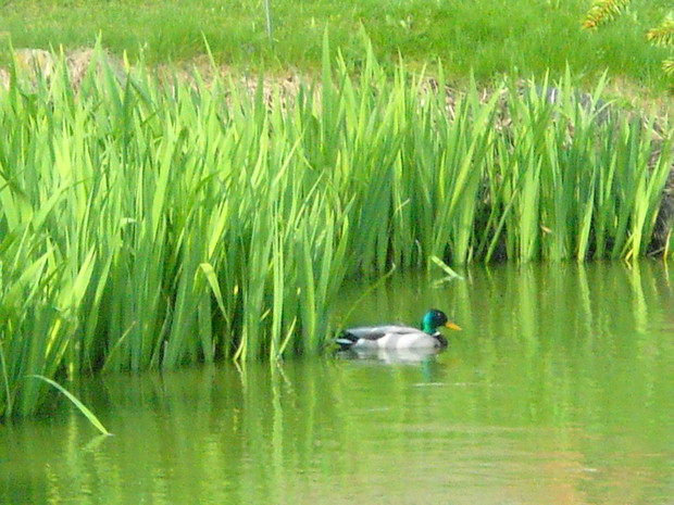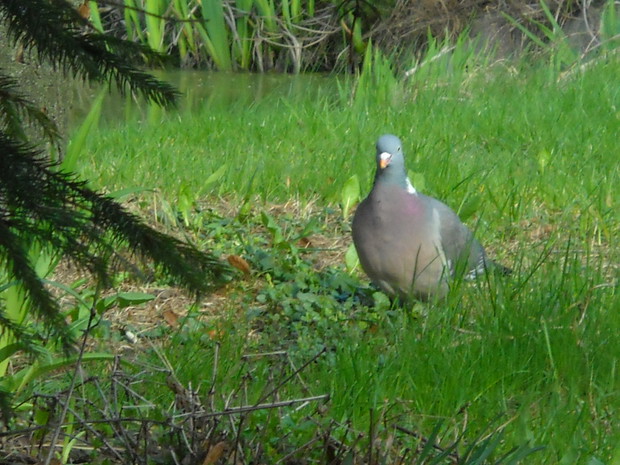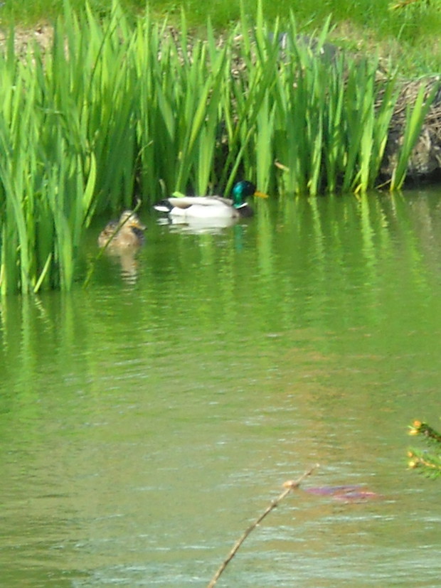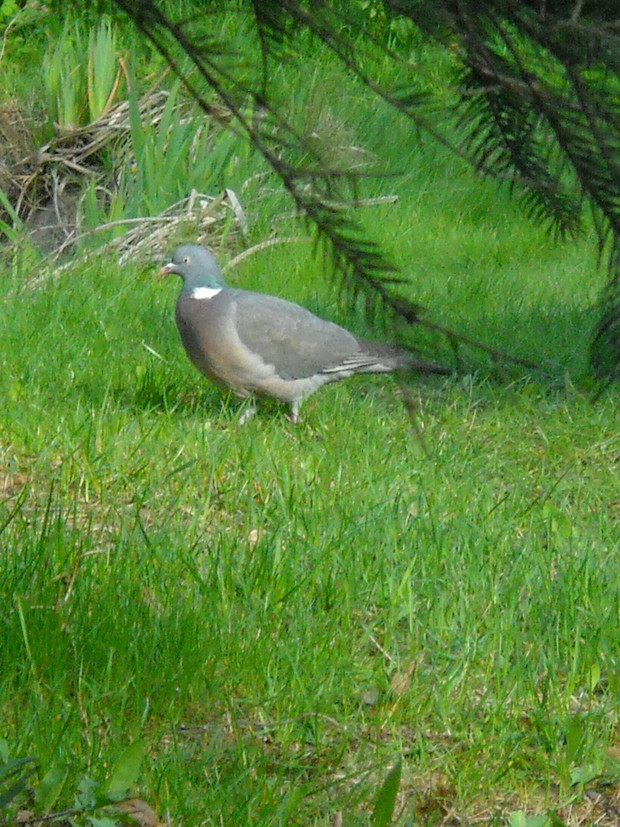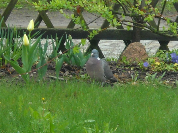 W przydomowym stawku zadomowiły się dzikie kaczki.Są żywą ozdobą.Natomiast szary gołąb uwił sobie gniazdo na świerku tuż przed oknem.Ciężko pracował znosił patyki na swe miejsce.Wczesnym rankiem pięknie grucha.W ciągu dnia spaceruje po całym ogrodzie i zagląda do stawku aby zaczerpnąć wody.Jest oswojony nie przeszkadza mu obecność osób.