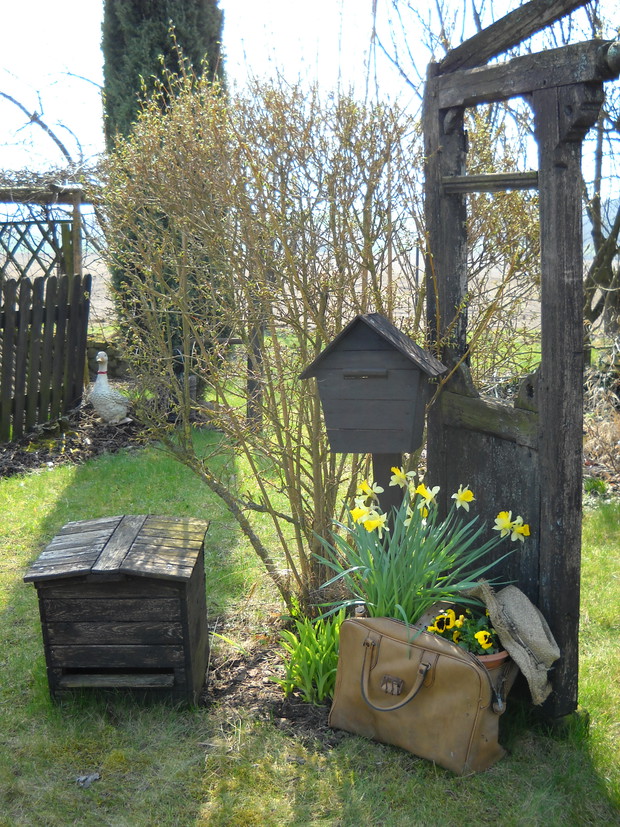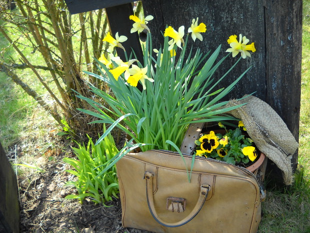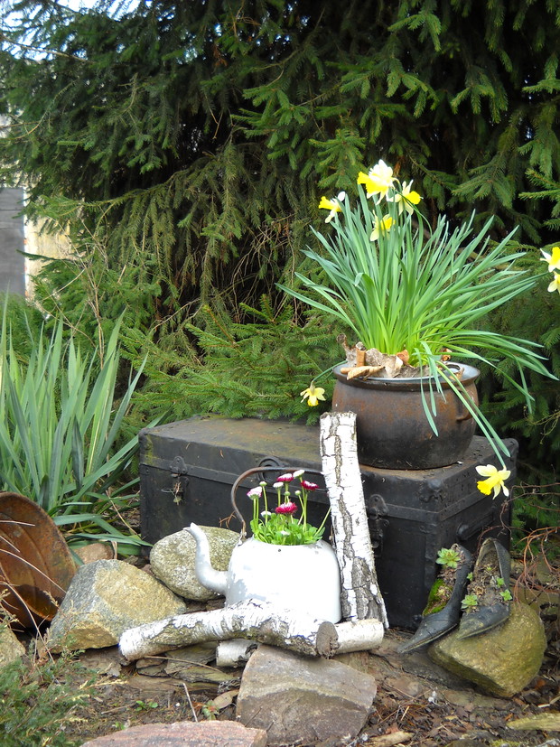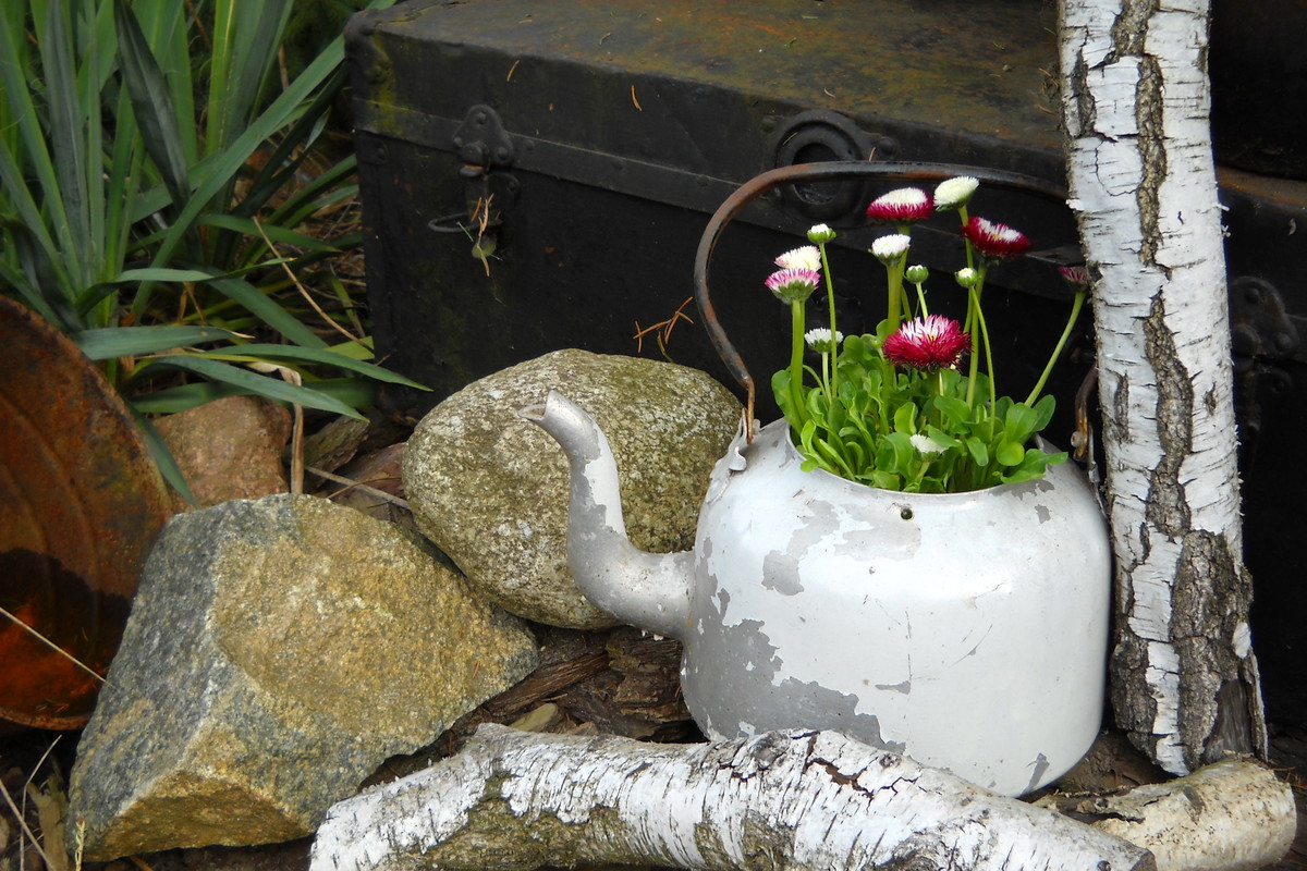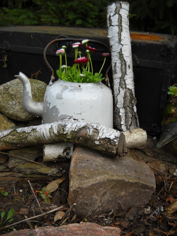 Stary czajnik...a tyle z niego dobrego.Stokrotki dobrze się czują w towarzystwie starego czajnika.Bardzo ładnie się komponuje wśród kawałków brzozy.............................................................................................................................................................................................