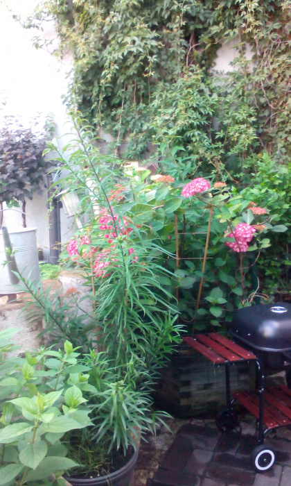 Przydomowa zieleń,którą uwielbiam,w której dobrze się czuje i w niej odpoczywam,mama moja też lubi w niej przebywać.Szkoda że kwiaty przekwitają tak szybko:)Hortensje to moje ulubione kwiaty,w tym roku wyjątkowo duże i przecudny niebieski klematis .Lubie ozdabiać swój ogródek starymi przedmiotami ,które wraz z mężem namiętnie kolekcjonujemy tj.stare metalowe konewki,mosiężne dzbanki,garnki.To jest nasz świat w którym czujemy się dobrze,ciepły przytulny ogród.