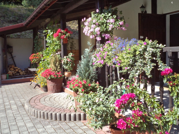 Mój tarasowy ogród i moja ulubienica begenwilla, którą dostałam w prezencie w zeszłym roku ,miała zaledwie 30 cm, w tym roku wyjątkowo wyrosła i pięknie zakwitła. Taras jest bardzo słoneczny, mieści się na południowo zachodniej stronie domu, więc w upalne dni niektóre rośliny podlewam dwa razy dziennie.