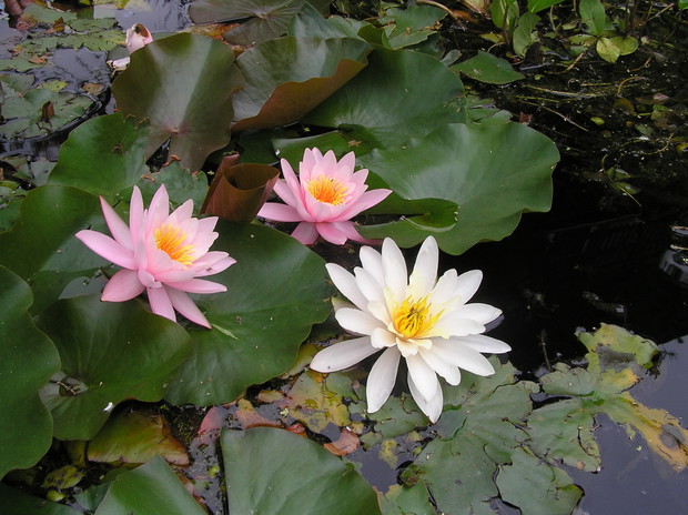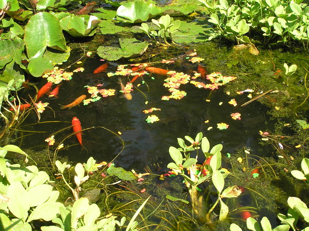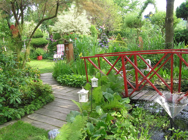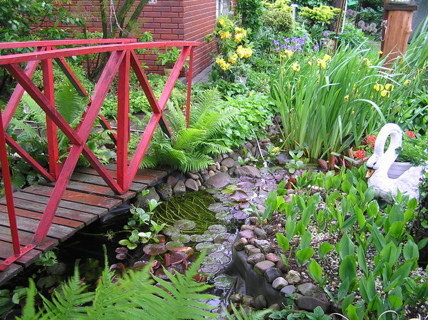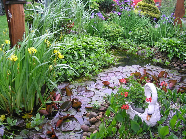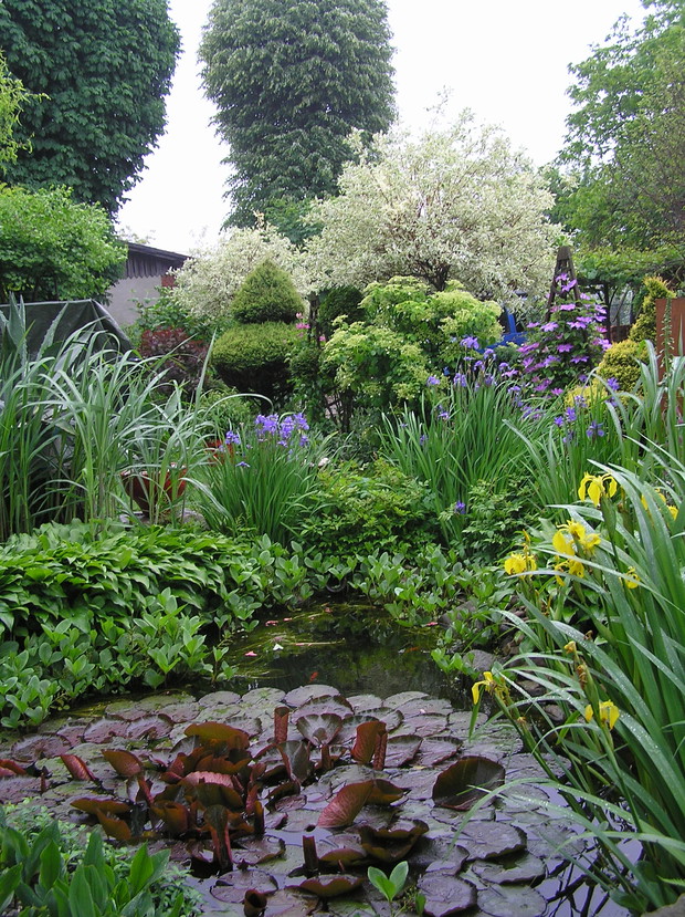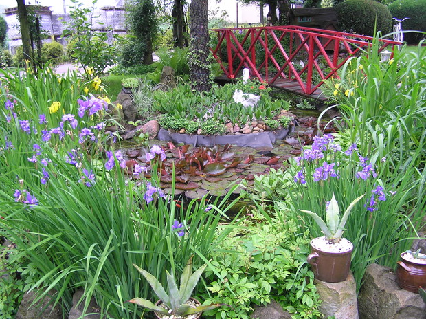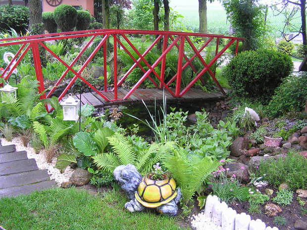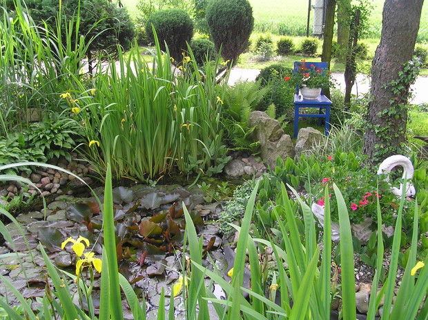 Woda w ogrodzie jest ważnym elementem, dlatego stworzylismy oczko wodne z niewielką kaskadą które tworzą tak zwany "suchy potok" oraz małą fontannnę. Jest to nie tylko raj dla ptaków w upalne dni, ale także kojąca melodia dla uszu pluskającej wody. gdzie woda przynosi nam spokój. Tu marzymy i rozmyślamy a wieczorami można usłyszeć żabi koncert. Latem nad wodą przylatują ptaki a szczególnie kosy które zadomowiły się zakładając gniazda wśród drzew w ogrodzie oraz motyle i kolorowe wazki aby ugasić pragnienie. Doskonale czują się w wodzie karasie które zimują a ozdobą tafii wodnej są piękne czerwone,kremowe i białe grzebienie na których chętnie kumkają żabki.