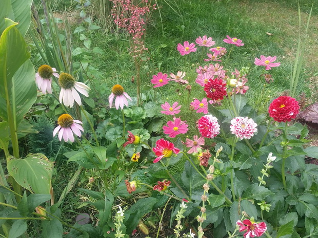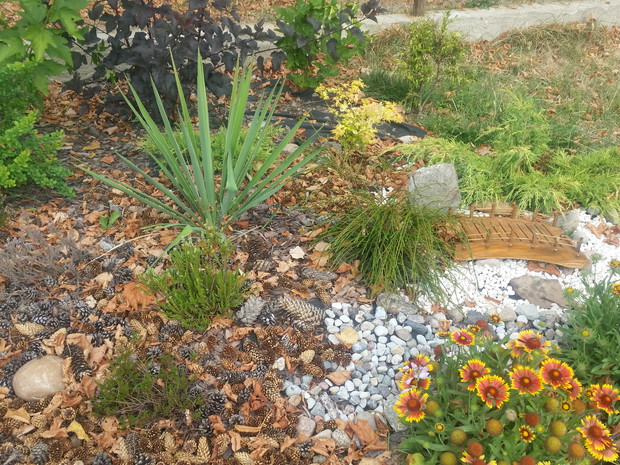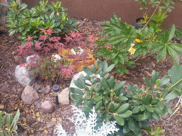 Może zakątek w japońskim stylu a może przepiekne trawy, miskanty. Mój najpiękniejszy okaz wrzosu na skalniaku w kolorze złoto- różowym. Azalie i rododendrony wyglądaja pięknie także gdy nie kwitną no i oczywiście klon japoński to zgrane towarzystwo. W tym roku z sadzonki jaką zakupiłam wyrósł mi i zaowocowal pomidor Krakus. Pomidory pyszne.