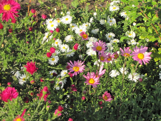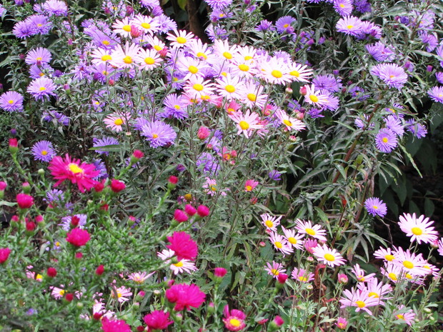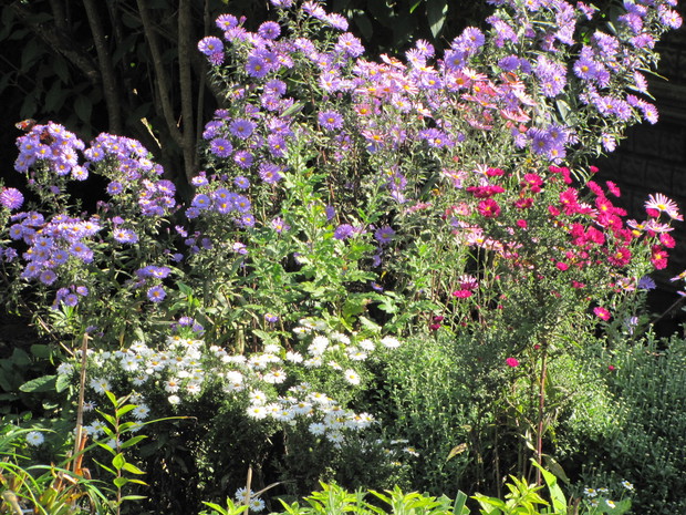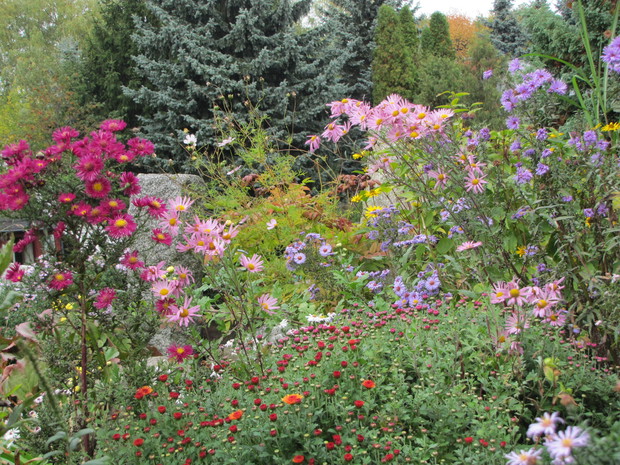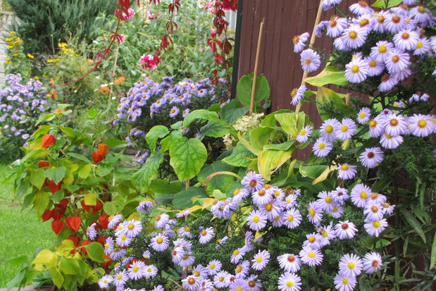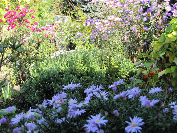Marcinki to kwiaty jesieni - września, mam w swojej kolekcji pięć kolorów. Ogród zdominowały jednak marcinki fioletowe. Występują one w różnych odcieniach i mają różną wysokość. Rozrastają się szybko i tworzą samoistnie ciekawe łany i kolorystyczne zestawienia. Z roku na rok ich przybywa.
