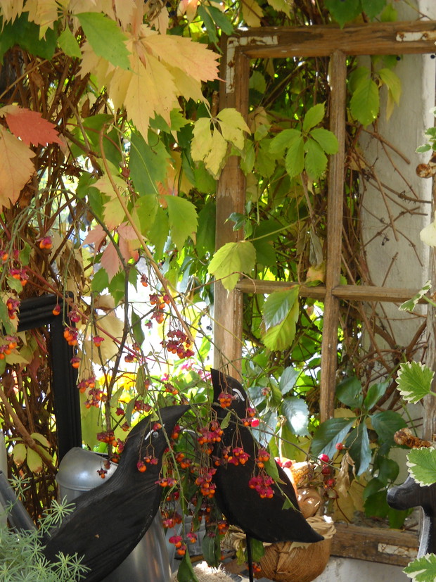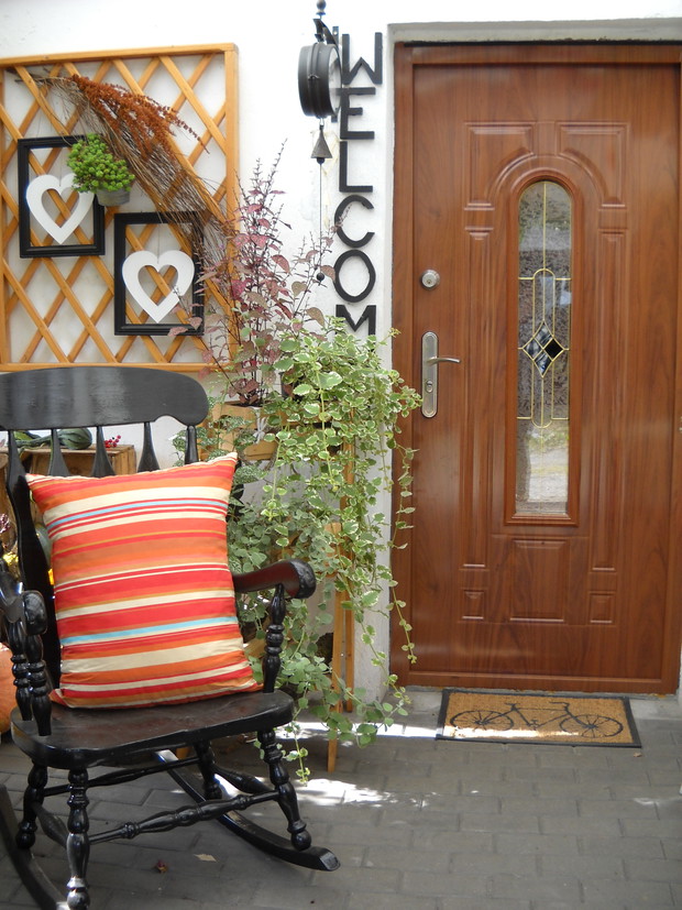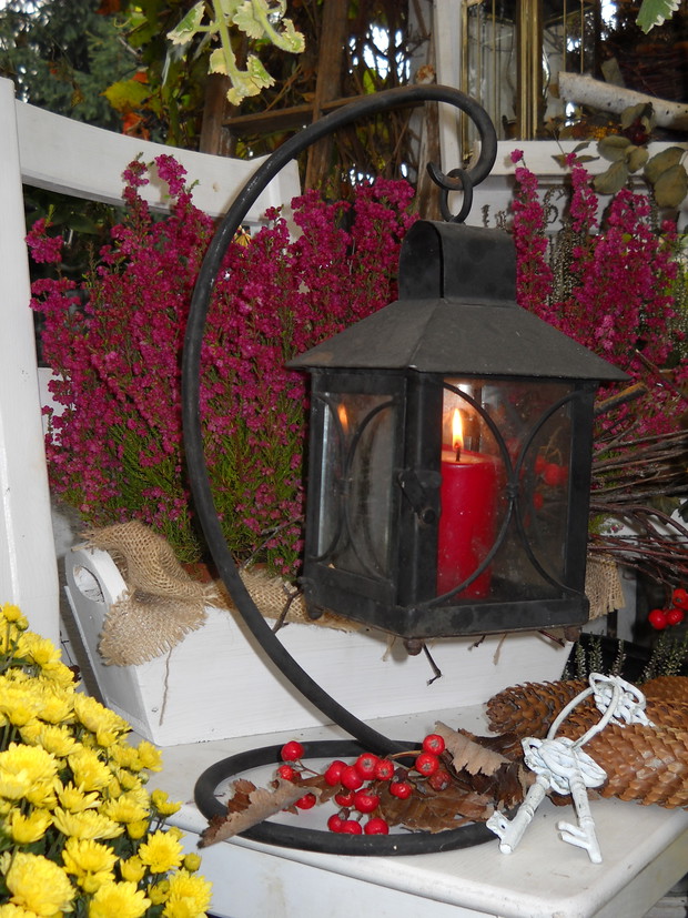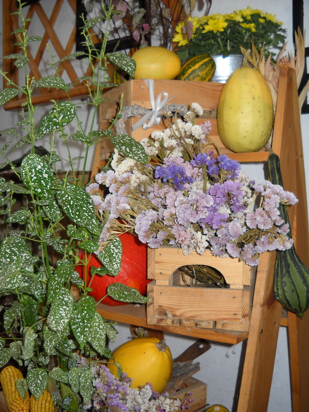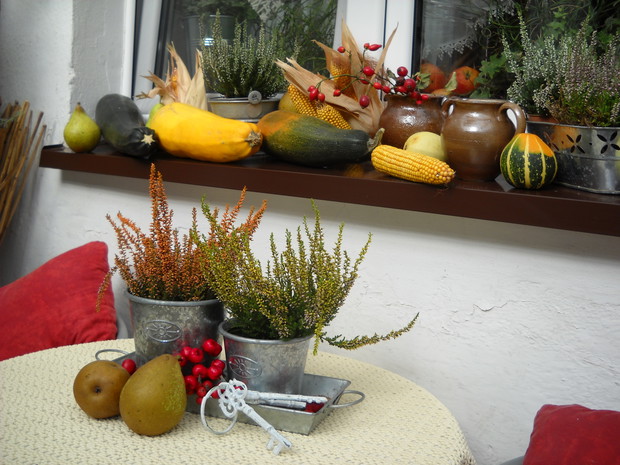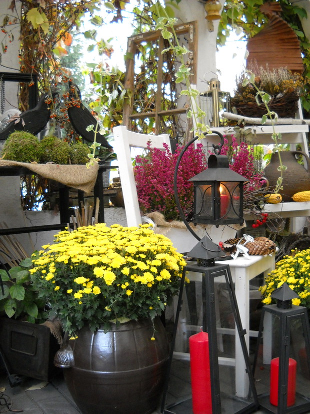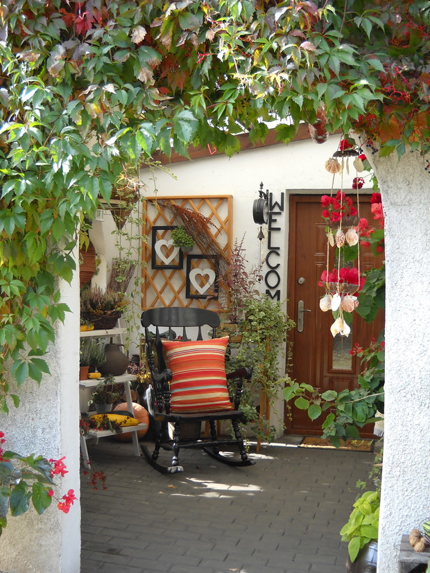To nasze miejsce tuż przed wejściem do domu-przydomowa altanka w jesiennej odsłonie.Chryzantemy Wrzosy i Wrzośce to one odgrywają główną role.Dodatkami które dekorują nasze miejsce są dekoracyjne dynie szyszki kukurydza oraz dary z warzywniaka.Winobluszcz bije kolorami zmieniających się liści od żółtego pełnego blasku po ognistą czerwień.