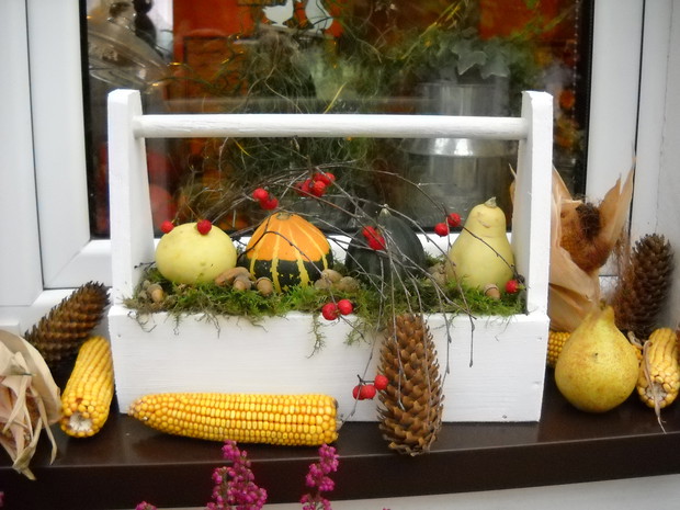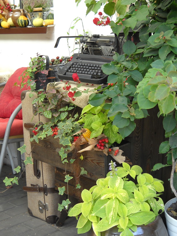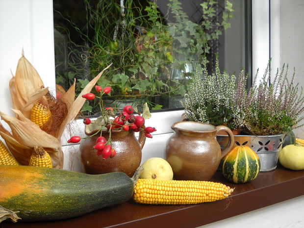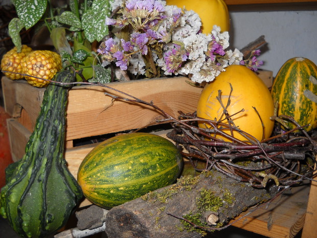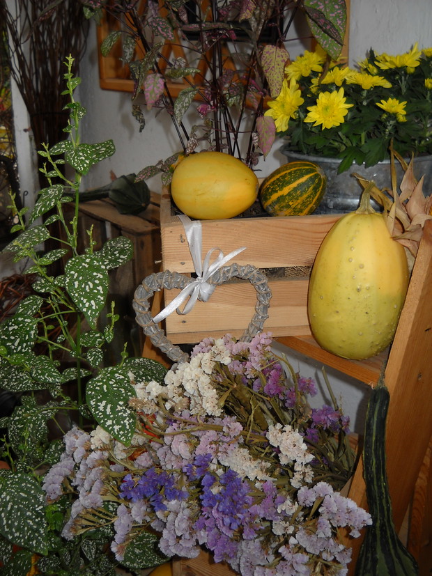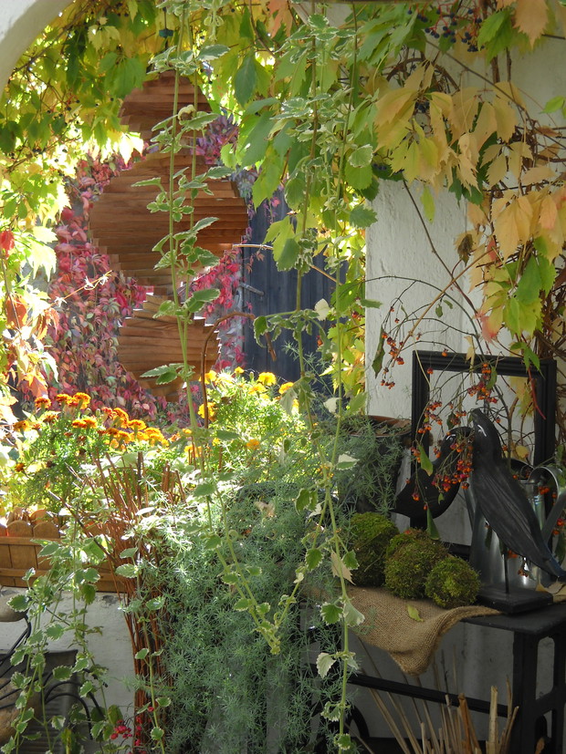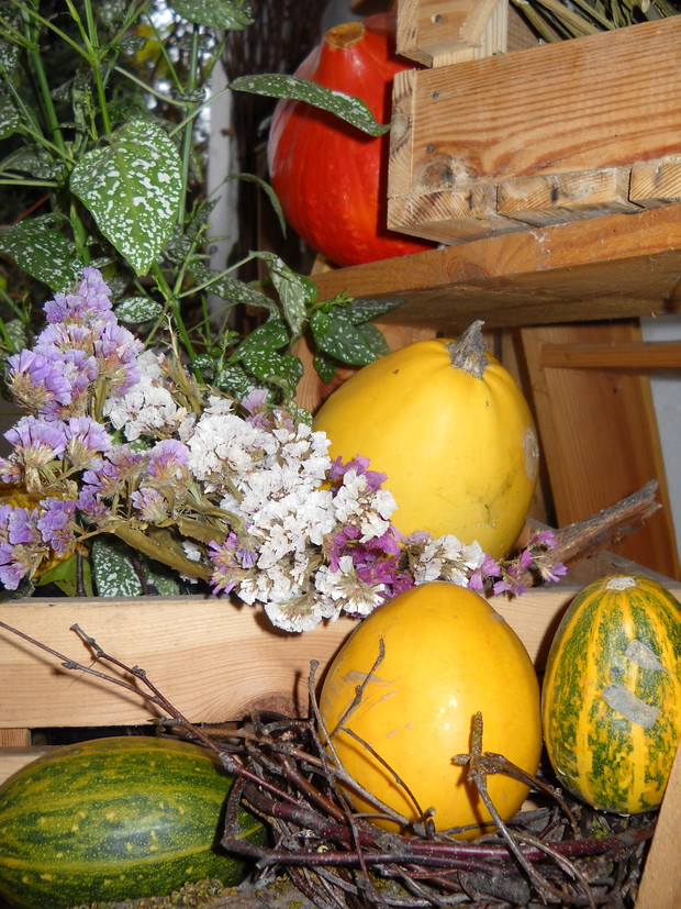 To nasze miejsce tuż przed wejściem do domu-przydomowa altanka w jesiennej odsłonie.Chryzantemy Wrzosy i Wrzośce to one odgrywają główną role.Dodatkami które dekorują nasze miejsce są dekoracyjne dynie szyszki kukurydza oraz dary z warzywniaka.Winobluszcz bije kolorami zmieniających się liści od żółtego pełnego blasku po ognistą czerwień.