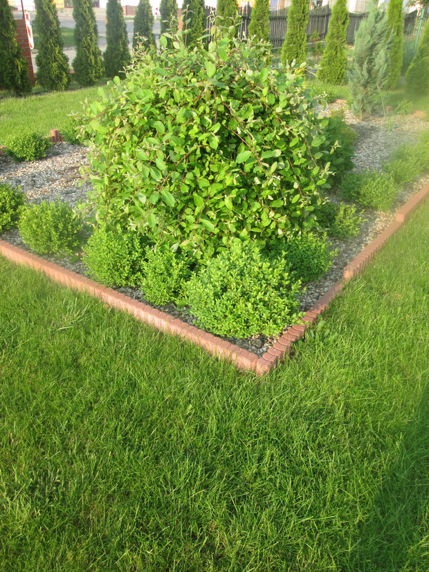 Ta rabata powstała jako pierwsza w moim ogrodzie. Jej kształt to prostokąt, który okalają betonowe krawężniki. Powierzchnia wyłożona jest agrowłókniną, na której wysypane są kamyki i kora. W środku rośnie żywotnik w kształcie kuli, dwie hortensje ogrodowe, wierzba iwa "Pendula" oraz jałowiec płożący .Krawędzie rabaty wypełniają bukszpany.