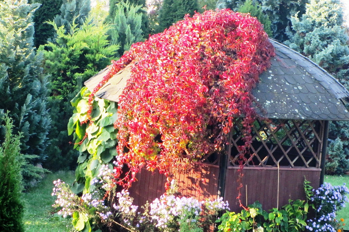 Winobluszcz to bardzo praktyczne pnącze w ogrodzie. Do tego mało kłopotliwe i jeszcze mniej wymagające. Wystarczy wiosną przyciąć starsze pędy i nadać mu pożądany kierunek wzrostu. Od wczesnego już lata, obsadzony na pergolach, tworzy zielone ściany, tworząc ciekawą osłonę w ogrodzie. Ale najpiękniej prezentuje się jesienią. Już od września do końca października przebarwia się, mieni się codziennie pięknymi, różnorodnymi kolorami. Tworzy niepowtarzalny klimat, tworząc urocze jesienne zakątki w ogrodzie.