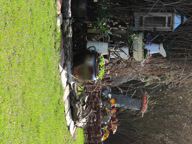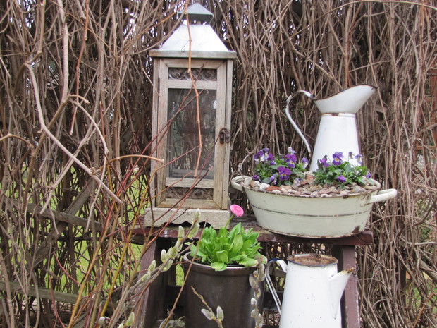 Stare emaliowane naczynia, w nich fiołki i stokrotki. W kamionkowych dzbanach gałązki, bazi, leszczyny, bukszpanu i forsycji. Do tego stara niepotrzebna drabinka i wiosenna aranżacja, dekoracja gotowa. Polecam!
