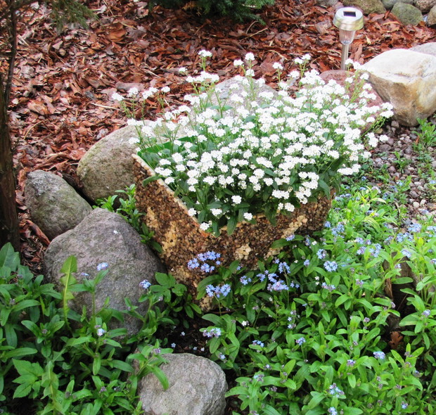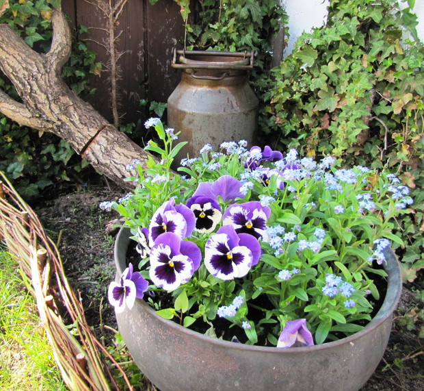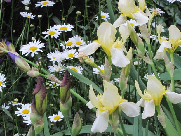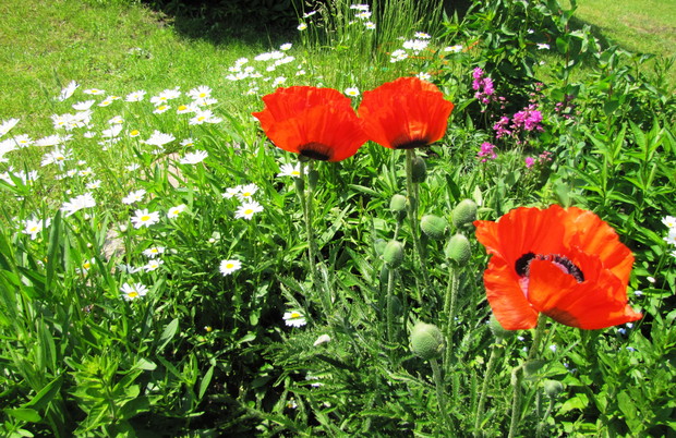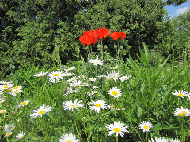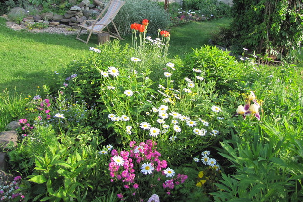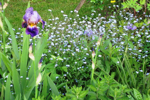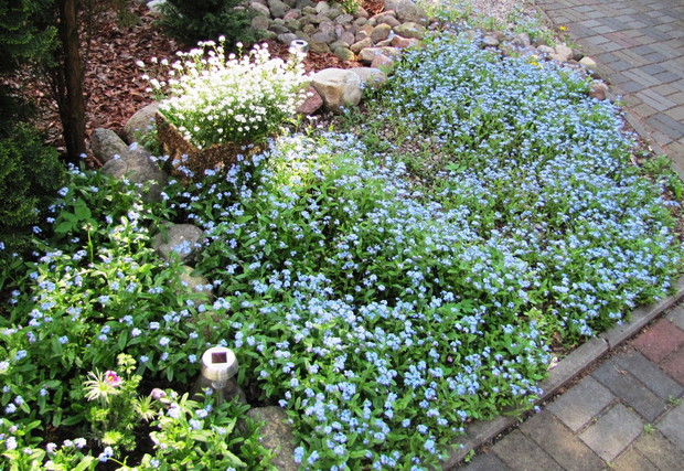 Wiosenne rabaty nie tylko z cebulowych !!! Wiosenne rabaty mogą zachwycać swoją uroda nie tylko dzięki kwiatom cebulowym. Ja od paru lat postawiłam na byliny i kwiaty samosiejki. Wiosną w moim ogrodzie poczucie świeżości i lekkości dają białe margaretki , stokrotki oraz niezapominajki w kolorach białych, różowych i niebieskich. Są to niezwykle łatwe w uprawie kwiaty, które pojawiają się wiosną w różnych niespodziewanych miejscach w ogrodzie . Wystarczy tylko po przekwitnięciu nie ścinać kilku kwiatów i zostawić kilka kęp , aby kojonej wiosny zastać ich łany w swoim ogrodzie. Małe sadzonki, przez całe lato, aż do jesieni można spotkać w ogrodzie w przeróżnych miejscach jak np. między kamieniami na skalniku czy pod płotem, rozsiewają się dosłownie wszędzie i rosną na każdym podłożu, nawet między drobnym grysikiem, mają małe wymagania. Są to idealne kwiatki dla zapracowanych. Jesienią lub bardzo wczesną wiosną można małe sadzonki „pozbierać” z ogrodu i przesadzić w jedno miejsce najlepiej na rabatę z wiosennymi kwiatami lub w donice. Wspaniale uzupełniają i wypełniają rabatę czy kompozycję w donicach. !!!! W moim ogrodzie zawsze towarzyszą im czerwone maki, różowe firletki , niebieskie chabry, kolorowe irysy czy bratki w donicach.